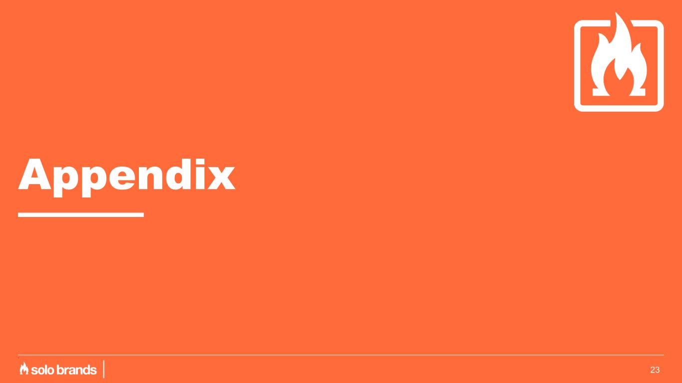 Why Invest in Solo Brands Now? 22 Clear leader in core markets (fire pits, pizza ovens and men’s swim) Our brands focus on high-value consumers that value premium products Brands have a passionate community of loyal customers and high Net Promoter Scores Both Solo Stove and Chubbies play in the premium segment of markets that are aligned with current trends, enabling brands to command higher margins Significant resizing of the company to a structurally smaller, profit driven business model Balance sheet risk reduced; debt refinanced through 2028, removal of going concern disclaimer, positioned for stability and transformation Cohesive new leadership team of top talent aligned on future vision, focused on the right issues & excited to revitalize growth Clear adjacencies with high optionality on path for expansion (e.g., product expansion opportunities) S O L O B R A N D S W H Y I N V E S T