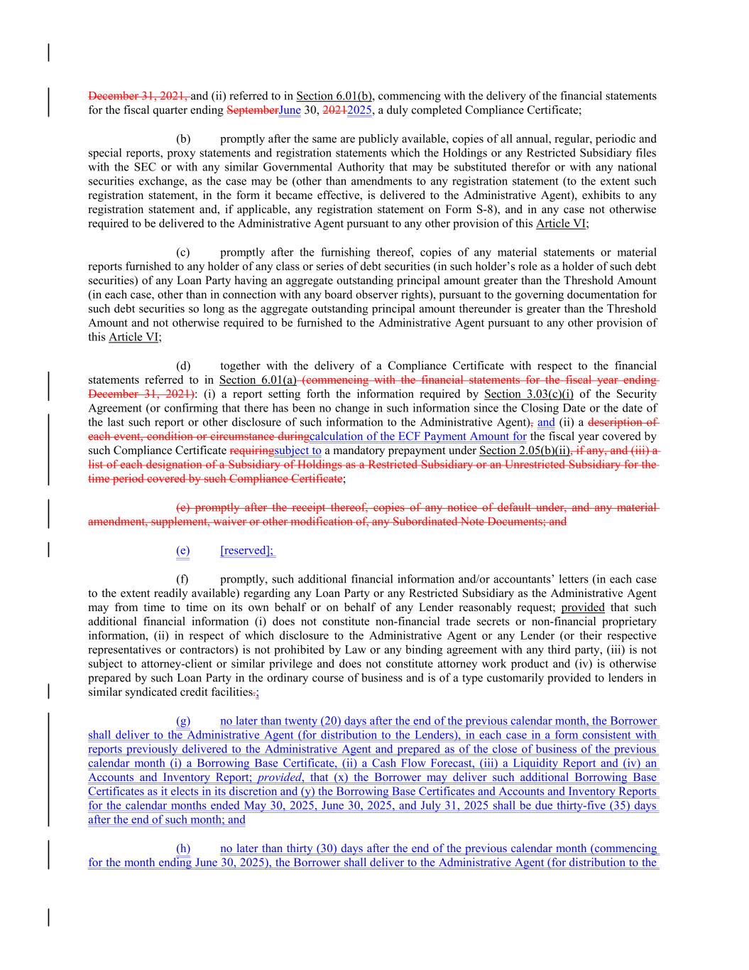 December 31, 2021, and (ii) referred to in Section 6.01(b), commencing with the delivery of the financial statements for the fiscal quarter ending SeptemberJune 30, 20212025, a duly completed Compliance Certificate; (b) promptly after the same are publicly available, copies of all annual, regular, periodic and special reports, proxy statements and registration statements which the Holdings or any Restricted Subsidiary files with the SEC or with any similar Governmental Authority that may be substituted therefor or with any national securities exchange, as the case may be (other than amendments to any registration statement (to the extent such registration statement, in the form it became effective, is delivered to the Administrative Agent), exhibits to any registration statement and, if applicable, any registration statement on Form S-8), and in any case not otherwise required to be delivered to the Administrative Agent pursuant to any other provision of this Article VI; (c) promptly after the furnishing thereof, copies of any material statements or material reports furnished to any holder of any class or series of debt securities (in such holder’s role as a holder of such debt securities) of any Loan Party having an aggregate outstanding principal amount greater than the Threshold Amount (in each case, other than in connection with any board observer rights), pursuant to the governing documentation for such debt securities so long as the aggregate outstanding principal amount thereunder is greater than the Threshold Amount and not otherwise required to be furnished to the Administrative Agent pursuant to any other provision of this Article VI; (d) together with the delivery of a Compliance Certificate with respect to the financial statements referred to in Section 6.01(a) (commencing with the financial statements for the fiscal year ending December 31, 2021): (i) a report setting forth the information required by Section 3.03(c)(i) of the Security Agreement (or confirming that there has been no change in such information since the Closing Date or the date of the last such report or other disclosure of such information to the Administrative Agent), and (ii) a description of each event, condition or circumstance duringcalculation of the ECF Payment Amount for the fiscal year covered by such Compliance Certificate requiringsubject to a mandatory prepayment under Section 2.05(b)(ii), if any, and (iii) a list of each designation of a Subsidiary of Holdings as a Restricted Subsidiary or an Unrestricted Subsidiary for the time period covered by such Compliance Certificate; (e) promptly after the receipt thereof, copies of any notice of default under, and any material amendment, supplement, waiver or other modification of, any Subordinated Note Documents; and (e) [reserved]; (f) promptly, such additional financial information and/or accountants’ letters (in each case to the extent readily available) regarding any Loan Party or any Restricted Subsidiary as the Administrative Agent may from time to time on its own behalf or on behalf of any Lender reasonably request; provided that such additional financial information (i) does not constitute non-financial trade secrets or non-financial proprietary information, (ii) in respect of which disclosure to the Administrative Agent or any Lender (or their respective representatives or contractors) is not prohibited by Law or any binding agreement with any third party, (iii) is not subject to attorney-client or similar privilege and does not constitute attorney work product and (iv) is otherwise prepared by such Loan Party in the ordinary course of business and is of a type customarily provided to lenders in similar syndicated credit facilities.; (g) no later than twenty (20) days after the end of the previous calendar month, the Borrower shall deliver to the Administrative Agent (for distribution to the Lenders), in each case in a form consistent with reports previously delivered to the Administrative Agent and prepared as of the close of business of the previous calendar month (i) a Borrowing Base Certificate, (ii) a Cash Flow Forecast, (iii) a Liquidity Report and (iv) an Accounts and Inventory Report; provided, that (x) the Borrower may deliver such additional Borrowing Base Certificates as it elects in its discretion and (y) the Borrowing Base Certificates and Accounts and Inventory Reports for the calendar months ended May 30, 2025, June 30, 2025, and July 31, 2025 shall be due thirty-five (35) days after the end of such month; and (h) no later than thirty (30) days after the end of the previous calendar month (commencing for the month ending June 30, 2025), the Borrower shall deliver to the Administrative Agent (for distribution to the