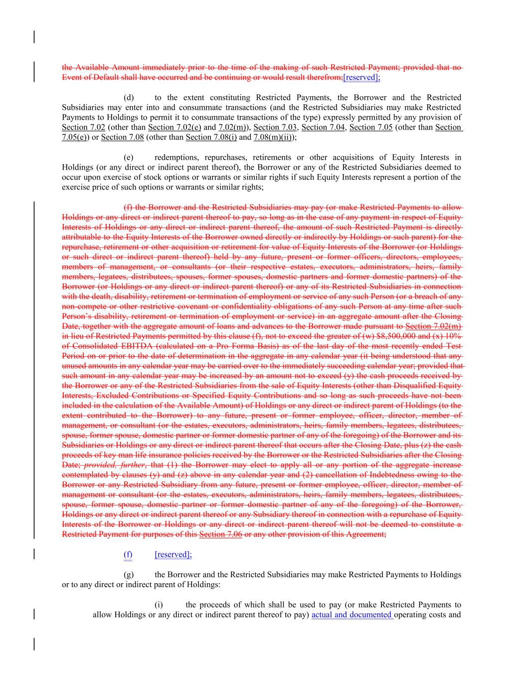 the Available Amount immediately prior to the time of the making of such Restricted Payment; provided that no Event of Default shall have occurred and be continuing or would result therefrom;[reserved]; (d) to the extent constituting Restricted Payments, the Borrower and the Restricted Subsidiaries may enter into and consummate transactions (and the Restricted Subsidiaries may make Restricted Payments to Holdings to permit it to consummate transactions of the type) expressly permitted by any provision of Section 7.02 (other than Section 7.02(e) and 7.02(m)), Section 7.03, Section 7.04, Section 7.05 (other than Section 7.05(e)) or Section 7.08 (other than Section 7.08(i) and 7.08(m)(ii)); (e) redemptions, repurchases, retirements or other acquisitions of Equity Interests in Holdings (or any direct or indirect parent thereof), the Borrower or any of the Restricted Subsidiaries deemed to occur upon exercise of stock options or warrants or similar rights if such Equity Interests represent a portion of the exercise price of such options or warrants or similar rights; (f) the Borrower and the Restricted Subsidiaries may pay (or make Restricted Payments to allow Holdings or any direct or indirect parent thereof to pay, so long as in the case of any payment in respect of Equity Interests of Holdings or any direct or indirect parent thereof, the amount of such Restricted Payment is directly attributable to the Equity Interests of the Borrower owned directly or indirectly by Holdings or such parent) for the repurchase, retirement or other acquisition or retirement for value of Equity Interests of the Borrower (or Holdings or such direct or indirect parent thereof) held by any future, present or former officers, directors, employees, members of management, or consultants (or their respective estates, executors, administrators, heirs, family members, legatees, distributees, spouses, former spouses, domestic partners and former domestic partners) of the Borrower (or Holdings or any direct or indirect parent thereof) or any of its Restricted Subsidiaries in connection with the death, disability, retirement or termination of employment or service of any such Person (or a breach of any non-compete or other restrictive covenant or confidentiality obligations of any such Person at any time after such Person’s disability, retirement or termination of employment or service) in an aggregate amount after the Closing Date, together with the aggregate amount of loans and advances to the Borrower made pursuant to Section 7.02(m) in lieu of Restricted Payments permitted by this clause (f), not to exceed the greater of (w) $8,500,000 and (x) 10% of Consolidated EBITDA (calculated on a Pro Forma Basis) as of the last day of the most recently ended Test Period on or prior to the date of determination in the aggregate in any calendar year (it being understood that any unused amounts in any calendar year may be carried over to the immediately succeeding calendar year; provided that such amount in any calendar year may be increased by an amount not to exceed (y) the cash proceeds received by the Borrower or any of the Restricted Subsidiaries from the sale of Equity Interests (other than Disqualified Equity Interests, Excluded Contributions or Specified Equity Contributions and so long as such proceeds have not been included in the calculation of the Available Amount) of Holdings or any direct or indirect parent of Holdings (to the extent contributed to the Borrower) to any future, present or former employee, officer, director, member of management, or consultant (or the estates, executors, administrators, heirs, family members, legatees, distributees, spouse, former spouse, domestic partner or former domestic partner of any of the foregoing) of the Borrower and its Subsidiaries or Holdings or any direct or indirect parent thereof that occurs after the Closing Date, plus (z) the cash proceeds of key man life insurance policies received by the Borrower or the Restricted Subsidiaries after the Closing Date; provided, further, that (1) the Borrower may elect to apply all or any portion of the aggregate increase contemplated by clauses (y) and (z) above in any calendar year and (2) cancellation of Indebtedness owing to the Borrower or any Restricted Subsidiary from any future, present or former employee, officer, director, member of management or consultant (or the estates, executors, administrators, heirs, family members, legatees, distributees, spouse, former spouse, domestic partner or former domestic partner of any of the foregoing) of the Borrower, Holdings or any direct or indirect parent thereof or any Subsidiary thereof in connection with a repurchase of Equity Interests of the Borrower or Holdings or any direct or indirect parent thereof will not be deemed to constitute a Restricted Payment for purposes of this Section 7.06 or any other provision of this Agreement; (f) [reserved]; (g) the Borrower and the Restricted Subsidiaries may make Restricted Payments to Holdings or to any direct or indirect parent of Holdings: (i) the proceeds of which shall be used to pay (or make Restricted Payments to allow Holdings or any direct or indirect parent thereof to pay) actual and documented operating costs and