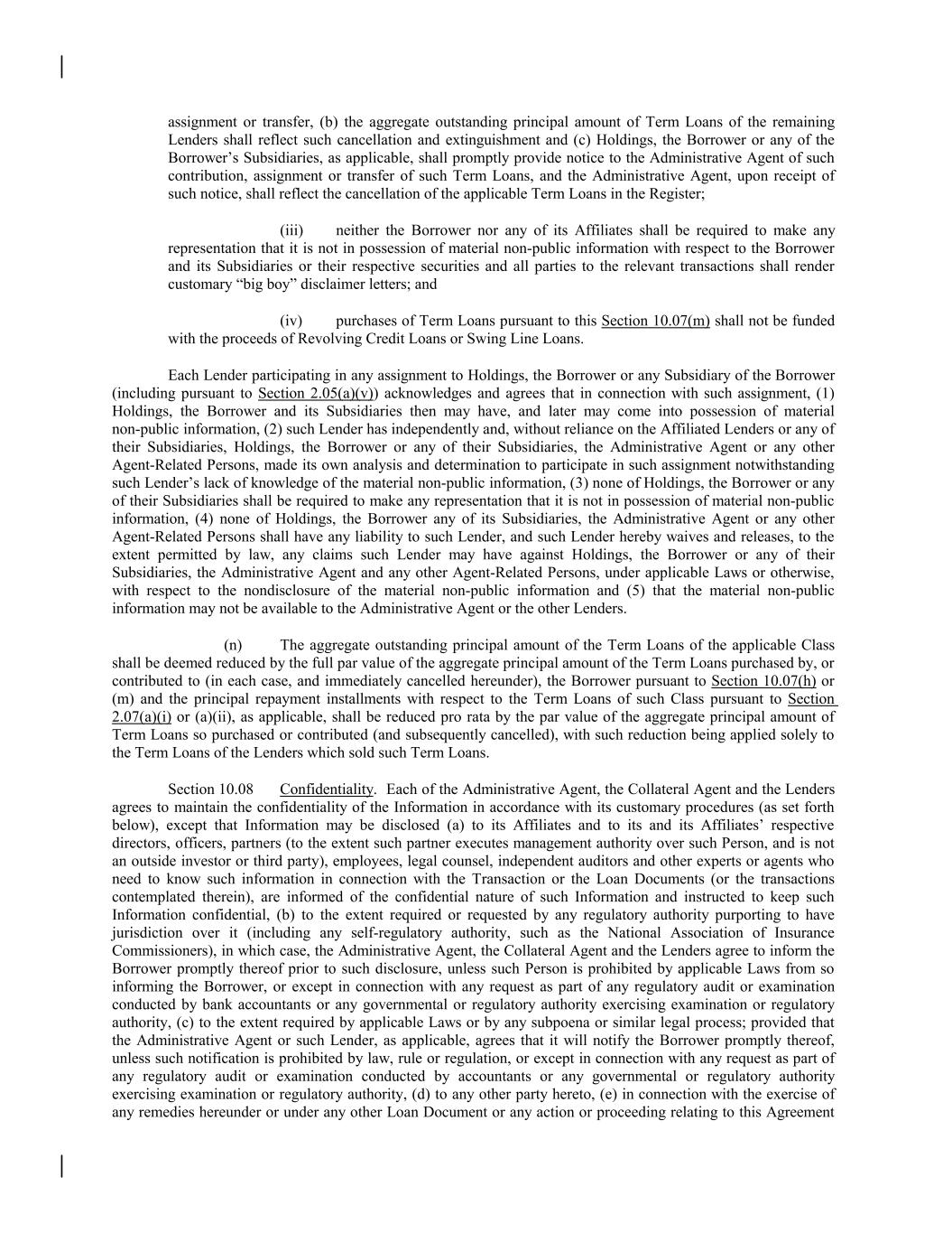 assignment or transfer, (b) the aggregate outstanding principal amount of Term Loans of the remaining Lenders shall reflect such cancellation and extinguishment and (c) Holdings, the Borrower or any of the Borrower’s Subsidiaries, as applicable, shall promptly provide notice to the Administrative Agent of such contribution, assignment or transfer of such Term Loans, and the Administrative Agent, upon receipt of such notice, shall reflect the cancellation of the applicable Term Loans in the Register; (iii) neither the Borrower nor any of its Affiliates shall be required to make any representation that it is not in possession of material non-public information with respect to the Borrower and its Subsidiaries or their respective securities and all parties to the relevant transactions shall render customary “big boy” disclaimer letters; and (iv) purchases of Term Loans pursuant to this Section 10.07(m) shall not be funded with the proceeds of Revolving Credit Loans or Swing Line Loans. Each Lender participating in any assignment to Holdings, the Borrower or any Subsidiary of the Borrower (including pursuant to Section 2.05(a)(v)) acknowledges and agrees that in connection with such assignment, (1) Holdings, the Borrower and its Subsidiaries then may have, and later may come into possession of material non-public information, (2) such Lender has independently and, without reliance on the Affiliated Lenders or any of their Subsidiaries, Holdings, the Borrower or any of their Subsidiaries, the Administrative Agent or any other Agent-Related Persons, made its own analysis and determination to participate in such assignment notwithstanding such Lender’s lack of knowledge of the material non-public information, (3) none of Holdings, the Borrower or any of their Subsidiaries shall be required to make any representation that it is not in possession of material non-public information, (4) none of Holdings, the Borrower any of its Subsidiaries, the Administrative Agent or any other Agent-Related Persons shall have any liability to such Lender, and such Lender hereby waives and releases, to the extent permitted by law, any claims such Lender may have against Holdings, the Borrower or any of their Subsidiaries, the Administrative Agent and any other Agent-Related Persons, under applicable Laws or otherwise, with respect to the nondisclosure of the material non-public information and (5) that the material non-public information may not be available to the Administrative Agent or the other Lenders. (n) The aggregate outstanding principal amount of the Term Loans of the applicable Class shall be deemed reduced by the full par value of the aggregate principal amount of the Term Loans purchased by, or contributed to (in each case, and immediately cancelled hereunder), the Borrower pursuant to Section 10.07(h) or (m) and the principal repayment installments with respect to the Term Loans of such Class pursuant to Section 2.07(a)(i) or (a)(ii), as applicable, shall be reduced pro rata by the par value of the aggregate principal amount of Term Loans so purchased or contributed (and subsequently cancelled), with such reduction being applied solely to the Term Loans of the Lenders which sold such Term Loans. Section 10.08 Confidentiality. Each of the Administrative Agent, the Collateral Agent and the Lenders agrees to maintain the confidentiality of the Information in accordance with its customary procedures (as set forth below), except that Information may be disclosed (a) to its Affiliates and to its and its Affiliates’ respective directors, officers, partners (to the extent such partner executes management authority over such Person, and is not an outside investor or third party), employees, legal counsel, independent auditors and other experts or agents who need to know such information in connection with the Transaction or the Loan Documents (or the transactions contemplated therein), are informed of the confidential nature of such Information and instructed to keep such Information confidential, (b) to the extent required or requested by any regulatory authority purporting to have jurisdiction over it (including any self-regulatory authority, such as the National Association of Insurance Commissioners), in which case, the Administrative Agent, the Collateral Agent and the Lenders agree to inform the Borrower promptly thereof prior to such disclosure, unless such Person is prohibited by applicable Laws from so informing the Borrower, or except in connection with any request as part of any regulatory audit or examination conducted by bank accountants or any governmental or regulatory authority exercising examination or regulatory authority, (c) to the extent required by applicable Laws or by any subpoena or similar legal process; provided that the Administrative Agent or such Lender, as applicable, agrees that it will notify the Borrower promptly thereof, unless such notification is prohibited by law, rule or regulation, or except in connection with any request as part of any regulatory audit or examination conducted by accountants or any governmental or regulatory authority exercising examination or regulatory authority, (d) to any other party hereto, (e) in connection with the exercise of any remedies hereunder or under any other Loan Document or any action or proceeding relating to this Agreement