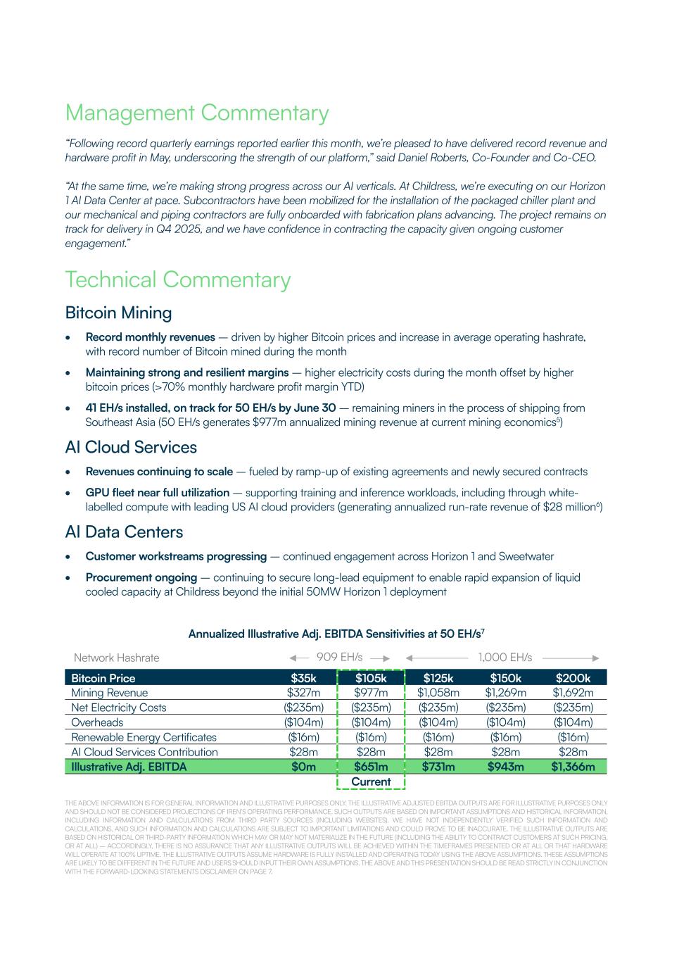 Management Commentary “Following record quarterly earnings reported earlier this month, we’re pleased to have delivered record revenue and hardware profit in May, underscoring the strength of our platform,” said Daniel Roberts, Co-Founder and Co-CEO. “At the same time, we’re making strong progress across our AI verticals. At Childress, we’re executing on our Horizon 1 AI Data Center at pace. Subcontractors have been mobilized for the installation of the packaged chiller plant and our mechanical and piping contractors are fully onboarded with fabrication plans advancing. The project remains on track for delivery in Q4 2025, and we have confidence in contracting the capacity given ongoing customer engagement.” Technical Commentary Bitcoin Mining • Record monthly revenues – driven by higher Bitcoin prices and increase in average operating hashrate, with record number of Bitcoin mined during the month • Maintaining strong and resilient margins – higher electricity costs during the month offset by higher bitcoin prices (>70% monthly hardware profit margin YTD) • 41 EH/s installed, on track for 50 EH/s by June 30 – remaining miners in the process of shipping from Southeast Asia (50 EH/s generates $977m annualized mining revenue at current mining economics5) AI Cloud Services • Revenues continuing to scale – fueled by ramp-up of existing agreements and newly secured contracts • GPU fleet near full utilization – supporting training and inference workloads, including through white- labelled compute with leading US AI cloud providers (generating annualized run-rate revenue of $28 million6) AI Data Centers • Customer workstreams progressing – continued engagement across Horizon 1 and Sweetwater • Procurement ongoing – continuing to secure long-lead equipment to enable rapid expansion of liquid cooled capacity at Childress beyond the initial 50MW Horizon 1 deployment Annualized Illustrative Adj. EBITDA Sensitivities at 50 EH/s7 Bitcoin Price $35k $105k $125k $150k $200k Mining Revenue $327m $977m $1,058m $1,269m $1,692m Net Electricity Costs ($235m) ($235m) ($235m) ($235m) ($235m) Overheads ($104m) ($104m) ($104m) ($104m) ($104m) Renewable Energy Certificates ($16m) ($16m) ($16m) ($16m) ($16m) AI Cloud Services Contribution $28m $28m $28m $28m $28m Illustrative Adj. EBITDA $0m $651m $731m $943m $1,366m Current THE ABOVE INFORMATION IS FOR GENERAL INFORMATION AND ILLUSTRATIVE PURPOSES ONLY. THE ILLUSTRATIVE ADJUSTED EBITDA OUTPUTS ARE FOR ILLUSTRATIVE PURPOSES ONLY AND SHOULD NOT BE CONSIDERED PROJECTIONS OF IREN’S OPERATING PERFORMANCE. SUCH OUTPUTS ARE BASED ON IMPORTANT ASSUMPTIONS AND HISTORICAL INFORMATION, INCLUDING INFORMATION AND CALCULATIONS FROM THIRD PARTY SOURCES (INCLUDING WEBSITES). WE HAVE NOT INDEPENDENTLY VERIFIED SUCH INFORMATION AND CALCULATIONS, AND SUCH INFORMATION AND CALCULATIONS ARE SUBJECT TO IMPORTANT LIMITATIONS AND COULD PROVE TO BE INACCURATE. THE ILLUSTRATIVE OUTPUTS ARE BASED ON HISTORICAL OR THIRD-PARTY INFORMATION WHICH MAY OR MAY NOT MATERIALIZE IN THE FUTURE (INCLUDING THE ABILITY TO CONTRACT CUSTOMERS AT SUCH PRICING, OR AT ALL) – ACCORDINGLY, THERE IS NO ASSURANCE THAT ANY ILLUSTRATIVE OUTPUTS WILL BE ACHIEVED WITHIN THE TIMEFRAMES PRESENTED OR AT ALL OR THAT HARDWARE WILL OPERATE AT 100% UPTIME. THE ILLUSTRATIVE OUTPUTS ASSUME HARDWARE IS FULLY INSTALLED AND OPERATING TODAY USING THE ABOVE ASSUMPTIONS. THESE ASSUMPTIONS ARE LIKELY TO BE DIFFERENT IN THE FUTURE AND USERS SHOULD INPUT THEIR OWN ASSUMPTIONS. THE ABOVE AND THIS PRESENTATION SHOULD BE READ STRICTLY IN CONJUNCTION WITH THE FORWARD-LOOKING STATEMENTS DISCLAIMER ON PAGE 7. 1,000 EH/s 909 EH/s Network Hashrate