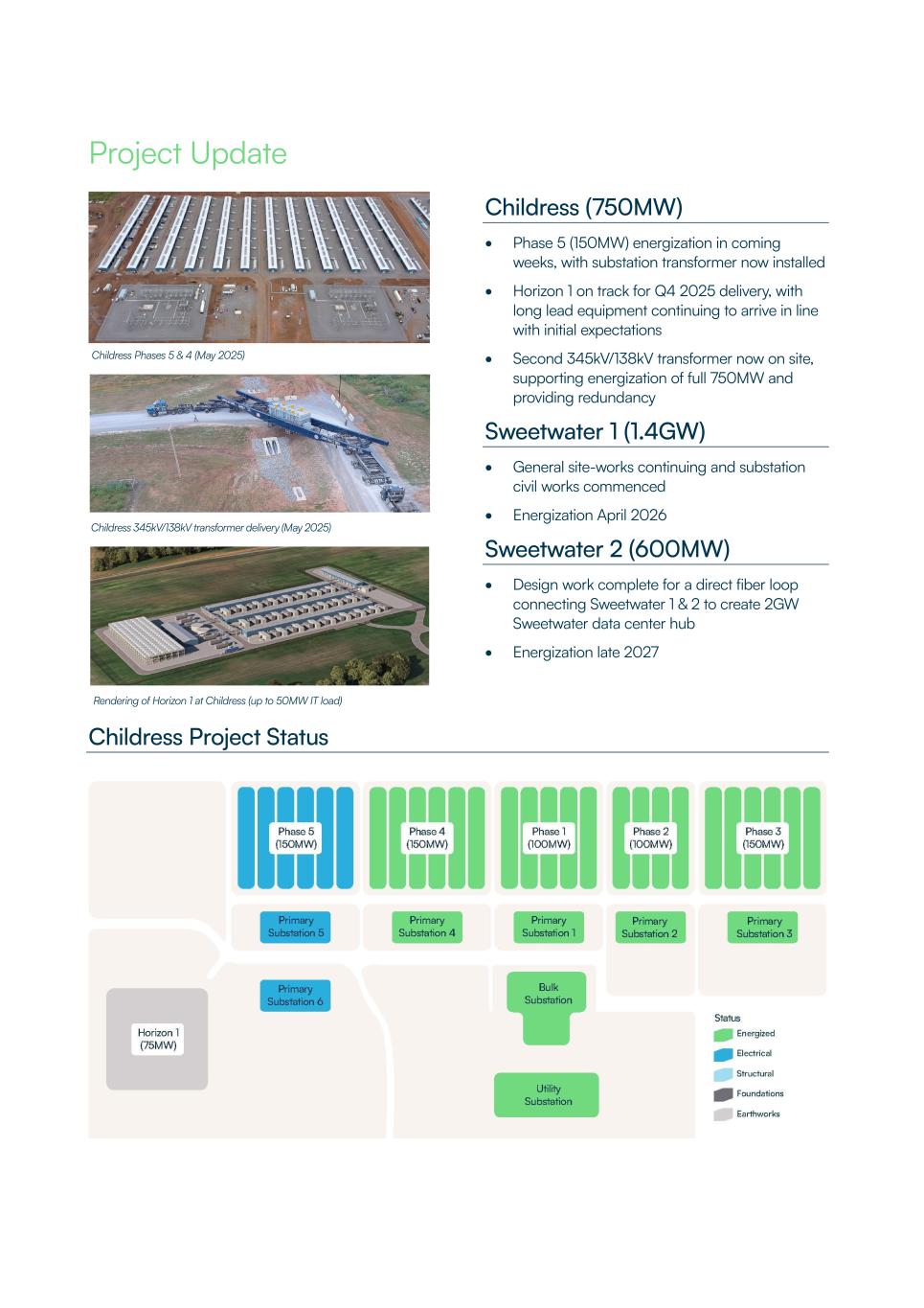 Project Update Childress (750MW) • Phase 5 (150MW) energization in coming weeks, with substation transformer now installed • Horizon 1 on track for Q4 2025 delivery, with long lead equipment continuing to arrive in line with initial expectations • Second 345kV/138kV transformer now on site, supporting energization of full 750MW and providing redundancy Sweetwater 1 (1.4GW) • General site-works continuing and substation civil works commenced • Energization April 2026 Sweetwater 2 (600MW) • Design work complete for a direct fiber loop connecting Sweetwater 1 & 2 to create 2GW Sweetwater data center hub • Energization late 2027 Childress Project Status Childress Phases 5 & 4 (May 2025) Childress 345kV/138kV transformer delivery (May 2025) Rendering of Horizon 1 at Childress (up to 50MW IT load)