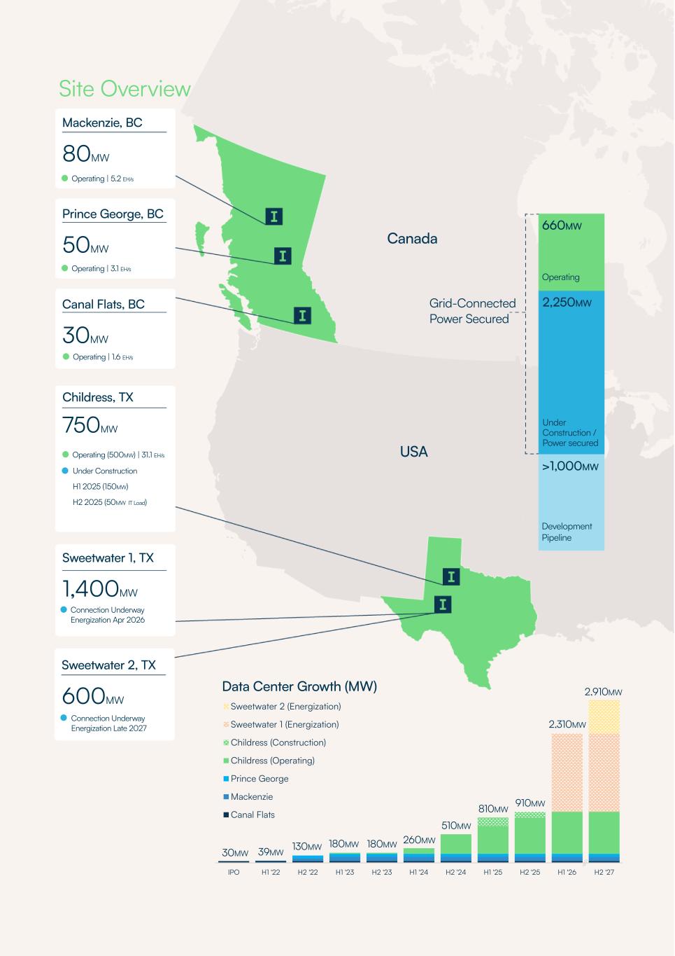IPO H1 '22 H2 '22 H1 '23 H2 '23 H1 '24 H2 '24 H1 '25 H2 '25 H1 '26 H2 '27 Sweetwater 2 (Energization) Sweetwater 1 (Energization) Childress (Construction) Childress (Operating) Prince George Mackenzie Canal Flats 910MW 810MW 510MW 260MW 180MW 180MW 130MW 39MW 30MW Data Center Growth (MW) Sweetwater 1, TX 1,400MW Grid-Connected Power Secured 660MW Operating 2,250MW Under Construction / Power secured >1,000MW Development Pipeline Mackenzie, BC 80MW Prince George, BC 50MW Canal Flats, BC 30MW Childress, TX 750MW Site Overview Canada USA 2,310MW Sweetwater 2, TX 600MW Connection Underway Energization Late 2027 2,910MW Operating | 1.6 EH/s Operating | 3.1 EH/s Operating | 5.2 EH/s Under Construction H1 2025 (150MW) H2 2025 (50MW IT Load) Operating (500MW) | 31.1 EH/s Connection Underway Energization Apr 2026