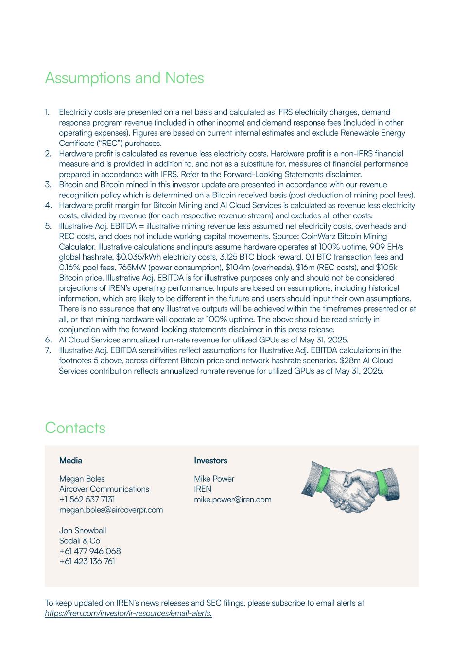 Assumptions and Notes 1. Electricity costs are presented on a net basis and calculated as IFRS electricity charges, demand response program revenue (included in other income) and demand response fees (included in other operating expenses). Figures are based on current internal estimates and exclude Renewable Energy Certificate (“REC”) purchases. 2. Hardware profit is calculated as revenue less electricity costs. Hardware profit is a non-IFRS financial measure and is provided in addition to, and not as a substitute for, measures of financial performance prepared in accordance with IFRS. Refer to the Forward-Looking Statements disclaimer. 3. Bitcoin and Bitcoin mined in this investor update are presented in accordance with our revenue recognition policy which is determined on a Bitcoin received basis (post deduction of mining pool fees). 4. Hardware profit margin for Bitcoin Mining and AI Cloud Services is calculated as revenue less electricity costs, divided by revenue (for each respective revenue stream) and excludes all other costs. 5. Illustrative Adj. EBITDA = illustrative mining revenue less assumed net electricity costs, overheads and REC costs, and does not include working capital movements. Source: CoinWarz Bitcoin Mining Calculator. Illustrative calculations and inputs assume hardware operates at 100% uptime, 909 EH/s global hashrate, $0.035/kWh electricity costs, 3.125 BTC block reward, 0.1 BTC transaction fees and 0.16% pool fees, 765MW (power consumption), $104m (overheads), $16m (REC costs), and $105k Bitcoin price. Illustrative Adj. EBITDA is for illustrative purposes only and should not be considered projections of IREN’s operating performance. Inputs are based on assumptions, including historical information, which are likely to be different in the future and users should input their own assumptions. There is no assurance that any illustrative outputs will be achieved within the timeframes presented or at all, or that mining hardware will operate at 100% uptime. The above should be read strictly in conjunction with the forward-looking statements disclaimer in this press release. 6. AI Cloud Services annualized run-rate revenue for utilized GPUs as of May 31, 2025. 7. Illustrative Adj. EBITDA sensitivities reflect assumptions for Illustrative Adj. EBITDA calculations in the footnotes 5 above, across different Bitcoin price and network hashrate scenarios. $28m AI Cloud Services contribution reflects annualized runrate revenue for utilized GPUs as of May 31, 2025. Contacts To keep updated on IREN’s news releases and SEC filings, please subscribe to email alerts at https://iren.com/investor/ir-resources/email-alerts. Media Megan Boles Aircover Communications +1 562 537 7131 megan.boles@aircoverpr.com Jon Snowball Sodali & Co +61 477 946 068 +61 423 136 761 Investors Mike Power IREN mike.power@iren.com