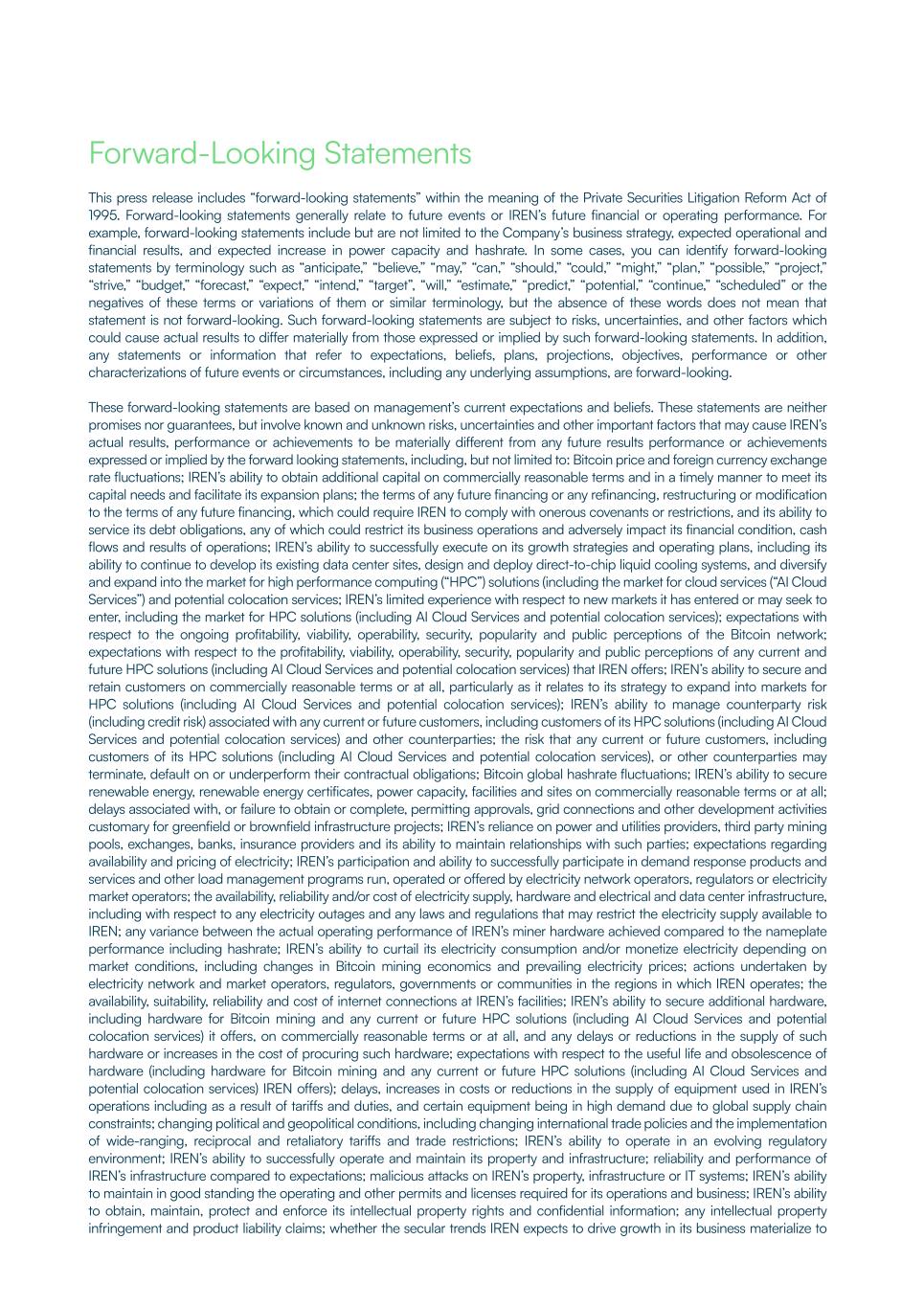 Forward-Looking Statements This press release includes “forward-looking statements” within the meaning of the Private Securities Litigation Reform Act of 1995. Forward-looking statements generally relate to future events or IREN’s future financial or operating performance. For example, forward-looking statements include but are not limited to the Company’s business strategy, expected operational and financial results, and expected increase in power capacity and hashrate. In some cases, you can identify forward-looking statements by terminology such as “anticipate,” “believe,” “may,” “can,” “should,” “could,” “might,” “plan,” “possible,” “project,” “strive,” “budget,” “forecast,” “expect,” “intend,” “target”, “will,” “estimate,” “predict,” “potential,” “continue,” “scheduled” or the negatives of these terms or variations of them or similar terminology, but the absence of these words does not mean that statement is not forward-looking. Such forward-looking statements are subject to risks, uncertainties, and other factors which could cause actual results to differ materially from those expressed or implied by such forward-looking statements. In addition, any statements or information that refer to expectations, beliefs, plans, projections, objectives, performance or other characterizations of future events or circumstances, including any underlying assumptions, are forward-looking. These forward-looking statements are based on management’s current expectations and beliefs. These statements are neither promises nor guarantees, but involve known and unknown risks, uncertainties and other important factors that may cause IREN’s actual results, performance or achievements to be materially different from any future results performance or achievements expressed or implied by the forward looking statements, including, but not limited to: Bitcoin price and foreign currency exchange rate fluctuations; IREN’s ability to obtain additional capital on commercially reasonable terms and in a timely manner to meet its capital needs and facilitate its expansion plans; the terms of any future financing or any refinancing, restructuring or modification to the terms of any future financing, which could require IREN to comply with onerous covenants or restrictions, and its ability to service its debt obligations, any of which could restrict its business operations and adversely impact its financial condition, cash flows and results of operations; IREN’s ability to successfully execute on its growth strategies and operating plans, including its ability to continue to develop its existing data center sites, design and deploy direct-to-chip liquid cooling systems, and diversify and expand into the market for high performance computing (“HPC”) solutions (including the market for cloud services (“AI Cloud Services”) and potential colocation services; IREN’s limited experience with respect to new markets it has entered or may seek to enter, including the market for HPC solutions (including AI Cloud Services and potential colocation services); expectations with respect to the ongoing profitability, viability, operability, security, popularity and public perceptions of the Bitcoin network; expectations with respect to the profitability, viability, operability, security, popularity and public perceptions of any current and future HPC solutions (including AI Cloud Services and potential colocation services) that IREN offers; IREN’s ability to secure and retain customers on commercially reasonable terms or at all, particularly as it relates to its strategy to expand into markets for HPC solutions (including AI Cloud Services and potential colocation services); IREN’s ability to manage counterparty risk (including credit risk) associated with any current or future customers, including customers of its HPC solutions (including AI Cloud Services and potential colocation services) and other counterparties; the risk that any current or future customers, including customers of its HPC solutions (including AI Cloud Services and potential colocation services), or other counterparties may terminate, default on or underperform their contractual obligations; Bitcoin global hashrate fluctuations; IREN’s ability to secure renewable energy, renewable energy certificates, power capacity, facilities and sites on commercially reasonable terms or at all; delays associated with, or failure to obtain or complete, permitting approvals, grid connections and other development activities customary for greenfield or brownfield infrastructure projects; IREN’s reliance on power and utilities providers, third party mining pools, exchanges, banks, insurance providers and its ability to maintain relationships with such parties; expectations regarding availability and pricing of electricity; IREN’s participation and ability to successfully participate in demand response products and services and other load management programs run, operated or offered by electricity network operators, regulators or electricity market operators; the availability, reliability and/or cost of electricity supply, hardware and electrical and data center infrastructure, including with respect to any electricity outages and any laws and regulations that may restrict the electricity supply available to IREN; any variance between the actual operating performance of IREN’s miner hardware achieved compared to the nameplate performance including hashrate; IREN’s ability to curtail its electricity consumption and/or monetize electricity depending on market conditions, including changes in Bitcoin mining economics and prevailing electricity prices; actions undertaken by electricity network and market operators, regulators, governments or communities in the regions in which IREN operates; the availability, suitability, reliability and cost of internet connecti