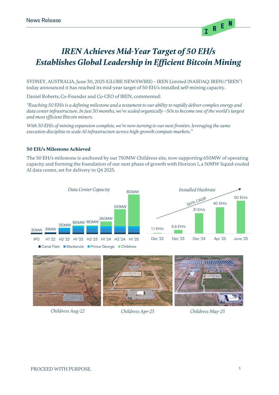 PROCEED WITH PURPOSE. 1 IREN Achieves Mid-Year Target of 50 EH/s Establishes Global Leadership in Efficient Bitcoin Mining SYDNEY, AUSTRALIA, June 30, 2025 (GLOBE NEWSWIRE) – IREN Limited (NASDAQ: IREN) (“IREN”) today announced it has reached its mid-year target of 50 EH/s installed self-mining capacity. Daniel Roberts, Co-Founder and Co-CEO of IREN, commented: “Reaching 50 EH/s is a defining milestone and a testament to our ability to rapidly deliver complex energy and data center infrastructure. In just 30 months, we’ve scaled organically ~50x to become one of the world’s largest and most efficient Bitcoin miners. With 50 EH/s of mining expansion complete, we’re now turning to our next frontier, leveraging the same execution discipline to scale AI infrastructure across high-growth compute markets.” 50 EH/s Milestone Achieved The 50 EH/s milestone is anchored by our 750MW Childress site, now supporting 650MW of operating capacity and forming the foundation of our next phase of growth with Horizon 1, a 50MW liquid-cooled AI data center, set for delivery in Q4 2025. Installed Hashrate IPO H1 '22 H2 '22 H1 '23 H2 '23 H1 '24 H2 '24 H1 '25 Canal Flats Mackenzie Prince George Childress 810MW 510MW 260MW 180MW180MW 130MW 39MW30MW 1.1 EH/s 5.6 EH/s 31 EH/s 40 EH/s 50 EH/s Dec '22 Dec '23 Dec '24 Apr '25 June '25 Data Center Capacity Childress Aug-22 Childress Apr-23 Childress May-25