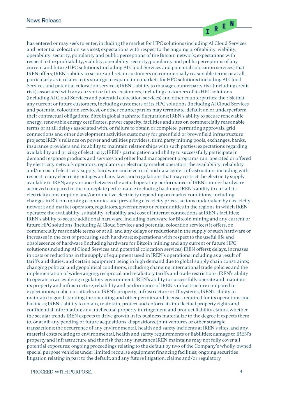 PROCEED WITH PURPOSE. 4 has entered or may seek to enter, including the market for HPC solutions (including AI Cloud Services and potential colocation services); expectations with respect to the ongoing profitability, viability, operability, security, popularity and public perceptions of the Bitcoin network; expectations with respect to the profitability, viability, operability, security, popularity and public perceptions of any current and future HPC solutions (including AI Cloud Services and potential colocation services) that IREN offers; IREN’s ability to secure and retain customers on commercially reasonable terms or at all, particularly as it relates to its strategy to expand into markets for HPC solutions (including AI Cloud Services and potential colocation services); IREN’s ability to manage counterparty risk (including credit risk) associated with any current or future customers, including customers of its HPC solutions (including AI Cloud Services and potential colocation services) and other counterparties; the risk that any current or future customers, including customers of its HPC solutions (including AI Cloud Services and potential colocation services), or other counterparties may terminate, default on or underperform their contractual obligations; Bitcoin global hashrate fluctuations; IREN’s ability to secure renewable energy, renewable energy certificates, power capacity, facilities and sites on commercially reasonable terms or at all; delays associated with, or failure to obtain or complete, permitting approvals, grid connections and other development activities customary for greenfield or brownfield infrastructure projects; IREN’s reliance on power and utilities providers, third party mining pools, exchanges, banks, insurance providers and its ability to maintain relationships with such parties; expectations regarding availability and pricing of electricity; IREN’s participation and ability to successfully participate in demand response products and services and other load management programs run, operated or offered by electricity network operators, regulators or electricity market operators; the availability, reliability and/or cost of electricity supply, hardware and electrical and data center infrastructure, including with respect to any electricity outages and any laws and regulations that may restrict the electricity supply available to IREN; any variance between the actual operating performance of IREN’s miner hardware achieved compared to the nameplate performance including hashrate; IREN’s ability to curtail its electricity consumption and/or monetize electricity depending on market conditions, including changes in Bitcoin mining economics and prevailing electricity prices; actions undertaken by electricity network and market operators, regulators, governments or communities in the regions in which IREN operates; the availability, suitability, reliability and cost of internet connections at IREN’s facilities; IREN’s ability to secure additional hardware, including hardware for Bitcoin mining and any current or future HPC solutions (including AI Cloud Services and potential colocation services) it offers, on commercially reasonable terms or at all, and any delays or reductions in the supply of such hardware or increases in the cost of procuring such hardware; expectations with respect to the useful life and obsolescence of hardware (including hardware for Bitcoin mining and any current or future HPC solutions (including AI Cloud Services and potential colocation services) IREN offers); delays, increases in costs or reductions in the supply of equipment used in IREN’s operations including as a result of tariffs and duties, and certain equipment being in high demand due to global supply chain constraints; changing political and geopolitical conditions, including changing international trade policies and the implementation of wide-ranging, reciprocal and retaliatory tariffs and trade restrictions; IREN’s ability to operate in an evolving regulatory environment; IREN’s ability to successfully operate and maintain its property and infrastructure; reliability and performance of IREN’s infrastructure compared to expectations; malicious attacks on IREN’s property, infrastructure or IT systems; IREN’s ability to maintain in good standing the operating and other permits and licenses required for its operations and business; IREN’s ability to obtain, maintain, protect and enforce its intellectual property rights and confidential information; any intellectual property infringement and product liability claims; whether the secular trends IREN expects to drive growth in its business materialize to the degree it expects them to, or at all; any pending or future acquisitions, dispositions, joint ventures or other strategic transactions; the occurrence of any environmental, health and safety incidents at IREN’s sites, and any material costs relating to environmental, health and safety requirements or liabilities; damage to IREN’s property and infrastructure and the risk that any insurance IREN maintains may not fully cover all potential exposures; ongoing proceedings relating to the default by two of the Company’s wholly-owned special purpose vehicles under limited recourse equipment financing facilities; ongoing securities litigation relating in part to the default, and any future litigation, claims and/or regulatory