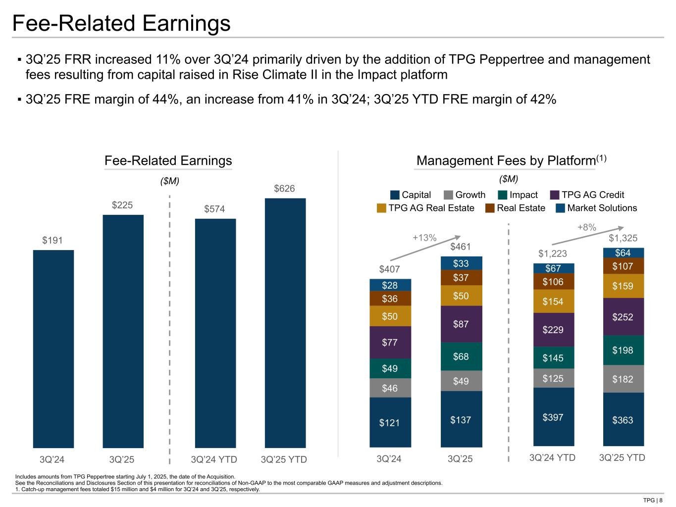 TPG | 7 Non-GAAP Financial Measures ▪ FRE increased 18% from $191 million in 3Q’24 to $225 million in 3Q’25; FRE margin increased from 41% in 3Q’24 to 44% in 3Q’25 ▪ After-tax DE of $214 million in 3Q’25, an increase from $189 million in 3Q’24, primarily driven by FRE, partially offset by an increase in interest expense, net Includes amounts from TPG Peppertree starting July 1, 2025, the date of the Acquisition. See the Reconciliations and Disclosures Section of this presentation for a full reconciliation of Non-GAAP to the most comparable GAAP measures and adjustment descriptions. 1. Realized investment income and other, net includes activity considered non-core to our Fee-Related Earnings operations, including 3Q’25 expenses of $10 million related to our unoccupied lease space and $7 million for acquisition diligence activity. ($ in thousands) 3Q’24 3Q’25 3Q’24 YTD 3Q’25 YTD 3Q’25 LTM Fee-Related Revenues Management fees $ 407,163 $ 461,338 $ 1,223,122 $ 1,324,961 $ 1,727,549 Fee-related performance revenues 5,557 7,340 13,917 20,309 39,425 Transaction, monitoring and other fees, net 43,153 38,097 111,454 126,905 163,094 Other income 3,969 2,621 21,553 8,604 12,122 Fee-Related Revenues 459,842 509,396 1,370,046 1,480,779 1,942,189 Fee-Related Expenses Cash-based compensation and benefits, net 174,514 185,504 520,943 553,398 721,456 Fee-related performance compensation 2,778 3,671 6,958 10,155 19,713 Operating expenses, net 91,783 95,220 267,743 291,146 385,115 Fee-Related Expenses 269,075 284,395 795,644 854,699 1,126,284 Fee-Related Earnings 190,767 225,001 574,402 626,080 815,905 Realized performance allocations, net 32,112 30,424 89,643 157,082 262,021 Realized investment income and other, net(1) (2,529) 2,688 (5,934) (6,990) (8,759) Depreciation expense (5,045) (5,213) (15,382) (15,320) (20,325) Interest expense, net (9,118) (23,226) (26,777) (54,923) (64,255) Distributable Earnings 206,187 229,674 615,952 705,929 984,588 Income taxes (16,742) (15,312) (39,243) (36,541) (54,634) After-Tax Distributable Earnings $ 189,445 $ 214,362 $ 576,709 $ 669,388 $ 929,954 Tie to: -prior page -qtrly statement in back -G-NG qtrly statment in back