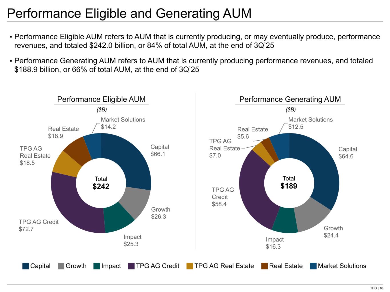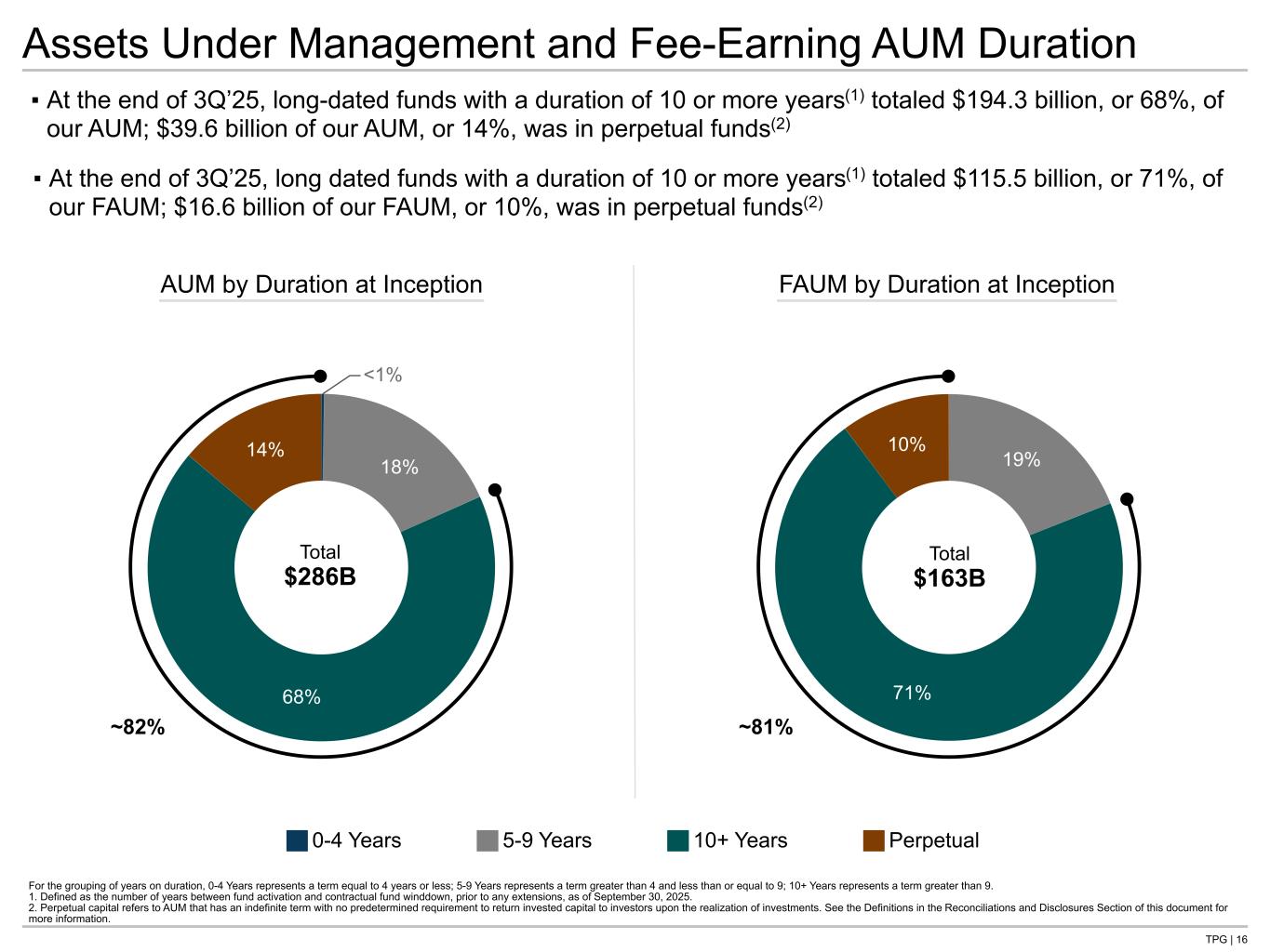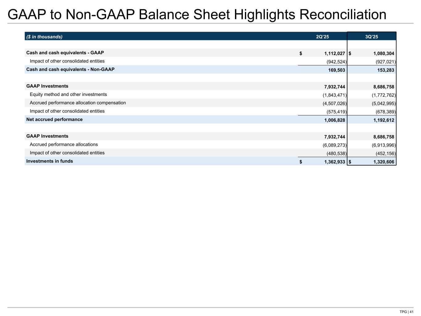 TPG | 3 TPG Reports Third Quarter 2025 Results Forward Looking Statements; No Offers; Non-GAAP Information This document may contain “forward-looking” statements. Forward-looking statements can be identified by words such as “anticipates,” “intends,” “plans,” “seeks,” “believes,” “estimates,” “expects” and similar references to future periods, or by the inclusion of forecasts or projections. Examples of forward-looking statements include, but are not limited to, statements we make regarding the outlook for our future business and financial performance, estimated operational metrics, business strategy and plans and objectives of management for future operations, including, among other things, statements regarding expected growth, future capital expenditures, fund performance, dividends and dividend policy, and debt service obligations. Forward-looking statements are based on our current expectations and assumptions regarding our business, the economy and other future conditions. Because forward-looking statements relate to the future, by their nature, they are subject to inherent uncertainties, risks and changes in circumstances that are difficult to predict. As a result, our actual results may differ materially from those contemplated by any forward-looking statements. Important factors that could cause actual results to differ materially from those in the forward-looking statements include the inability to recognize the anticipated benefits, or unexpected costs related to the integration, of acquired companies; our ability to manage growth and execute our business plan; and regional, national or global political, economic, business, competitive, market and regulatory conditions and uncertainties, among various other risks discussed in the Company’s SEC filings. For the reasons described above, we caution you against relying on any forward-looking statements, which should be read in conjunction with the other cautionary statements included elsewhere in this document and risk factors discussed from time to time in the Company’s filings with the SEC, which can be found at the SEC’s website at http://www.sec.gov. Any forward-looking statement in this document speaks only as of the date of this document. Factors or events that could cause our actual results to differ may emerge from time to time, and it is not possible for us to predict all of them. We undertake no obligation to update or revise any forward-looking statement after the date of this document, whether as a result of new information, future developments or otherwise, except as may be required by law. No recipient should, therefore, rely on these forward-looking statements as representing the views of the Company or its management as of any date subsequent to the date of the document. This document does not constitute an offer of any TPG fund. Throughout this document, all current period amounts are preliminary and unaudited; totals may not sum due to rounding. See the Reconciliations and Disclosures Section of this document for reconciliations of Non-GAAP to the most comparable GAAP measures.