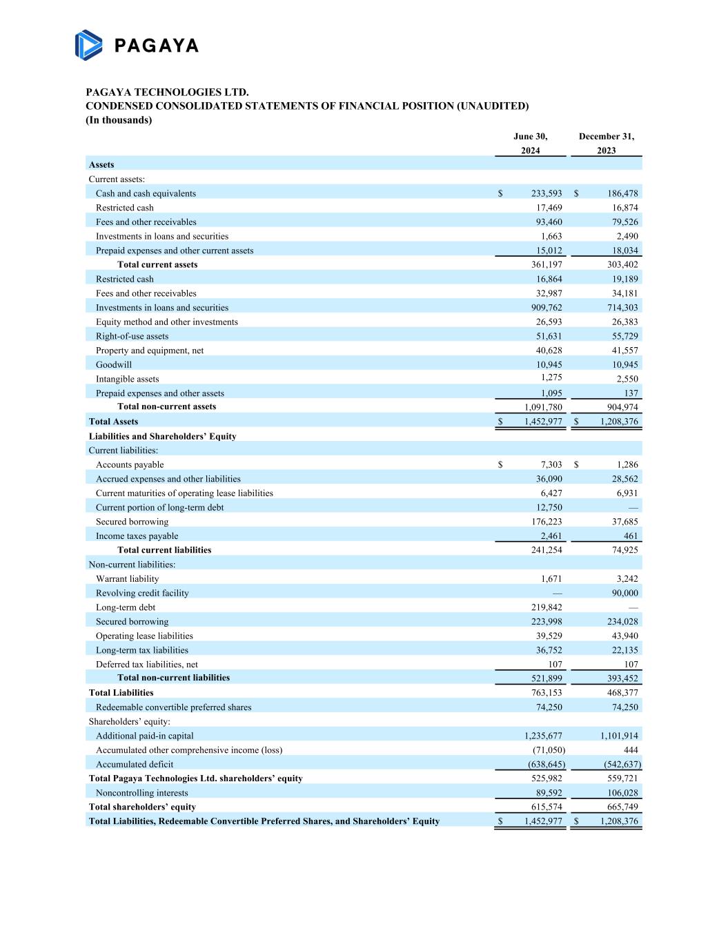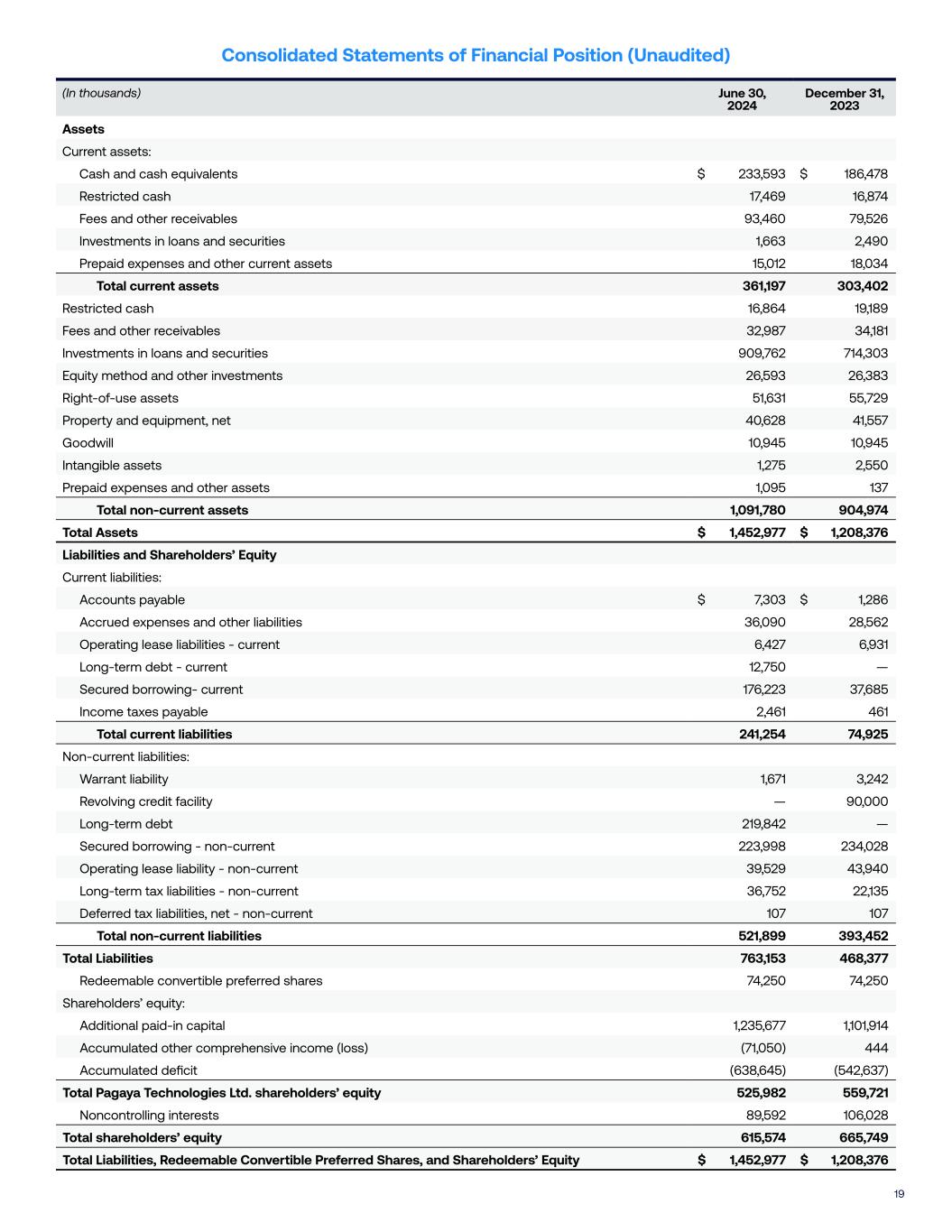 19 (In thousands) June 30, 2024 December 31, 2023 Assets Current assets: Cash and cash equivalents $ 233,593 $ 186,478 Restricted cash 17,469 16,874 Fees and other receivables 93,460 79,526 Investments in loans and securities 1,663 2,490 Prepaid expenses and other current assets 15,012 18,034 Total current assets 361,197 303,402 Restricted cash 16,864 19,189 Fees and other receivables 32,987 34,181 Investments in loans and securities 909,762 714,303 Equity method and other investments 26,593 26,383 Right-of-use assets 51,631 55,729 Property and equipment, net 40,628 41,557 Goodwill 10,945 10,945 Intangible assets 1,275 2,550 Prepaid expenses and other assets 1,095 137 Total non-current assets 1,091,780 904,974 Total Assets $ 1,452,977 $ 1,208,376 Liabilities and Shareholders’ Equity Current liabilities: Accounts payable $ 7,303 $ 1,286 Accrued expenses and other liabilities 36,090 28,562 Operating lease liabilities - current 6,427 6,931 Long-term debt - current 12,750 — Secured borrowing- current 176,223 37,685 Income taxes payable 2,461 461 Total current liabilities 241,254 74,925 Non-current liabilities: Warrant liability 1,671 3,242 Revolving credit facility — 90,000 Long-term debt 219,842 — Secured borrowing - non-current 223,998 234,028 Operating lease liability - non-current 39,529 43,940 Long-term tax liabilities - non-current 36,752 22,135 Deferred tax liabilities, net - non-current 107 107 Total non-current liabilities 521,899 393,452 Total Liabilities 763,153 468,377 Redeemable convertible preferred shares 74,250 74,250 Shareholders’ equity: Additional paid-in capital 1,235,677 1,101,914 Accumulated other comprehensive income (loss) (71,050) 444 Accumulated deficit (638,645) (542,637) Total Pagaya Technologies Ltd. shareholders’ equity 525,982 559,721 Noncontrolling interests 89,592 106,028 Total shareholders’ equity 615,574 665,749 Total Liabilities, Redeemable Convertible Preferred Shares, and Shareholders’ Equity $ 1,452,977 $ 1,208,376 Consolidated Statements of Financial Position (Unaudited)