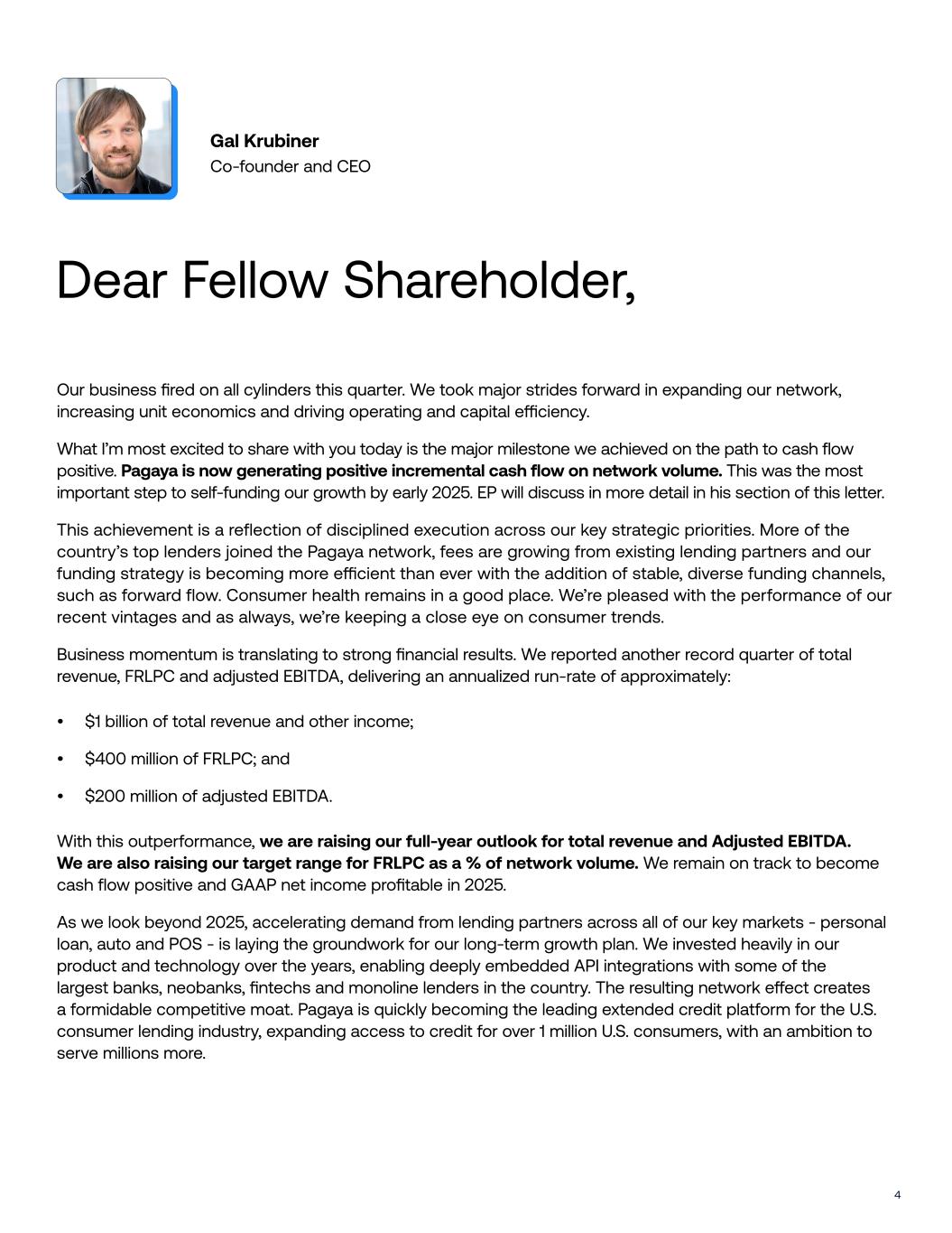 4 Gal Krubiner Co-founder and CEO Dear Fellow Shareholder, Our business fired on all cylinders this quarter. We took major strides forward in expanding our network, increasing unit economics and driving operating and capital efficiency. What I’m most excited to share with you today is the major milestone we achieved on the path to cash flow positive. Pagaya is now generating positive incremental cash flow on network volume. This was the most important step to self-funding our growth by early 2025. EP will discuss in more detail in his section of this letter. This achievement is a reflection of disciplined execution across our key strategic priorities. More of the country’s top lenders joined the Pagaya network, fees are growing from existing lending partners and our funding strategy is becoming more efficient than ever with the addition of stable, diverse funding channels, such as forward flow. Consumer health remains in a good place. We’re pleased with the performance of our recent vintages and as always, we’re keeping a close eye on consumer trends. Business momentum is translating to strong financial results. We reported another record quarter of total revenue, FRLPC and adjusted EBITDA, delivering an annualized run-rate of approximately: • $1 billion of total revenue and other income; • $400 million of FRLPC; and • $200 million of adjusted EBITDA. With this outperformance, we are raising our full-year outlook for total revenue and Adjusted EBITDA. We are also raising our target range for FRLPC as a % of network volume. We remain on track to become cash flow positive and GAAP net income profitable in 2025. As we look beyond 2025, accelerating demand from lending partners across all of our key markets - personal loan, auto and POS - is laying the groundwork for our long-term growth plan. We invested heavily in our product and technology over the years, enabling deeply embedded API integrations with some of the largest banks, neobanks, fintechs and monoline lenders in the country. The resulting network effect creates a formidable competitive moat. Pagaya is quickly becoming the leading extended credit platform for the U.S. consumer lending industry, expanding access to credit for over 1 million U.S. consumers, with an ambition to serve millions more.
