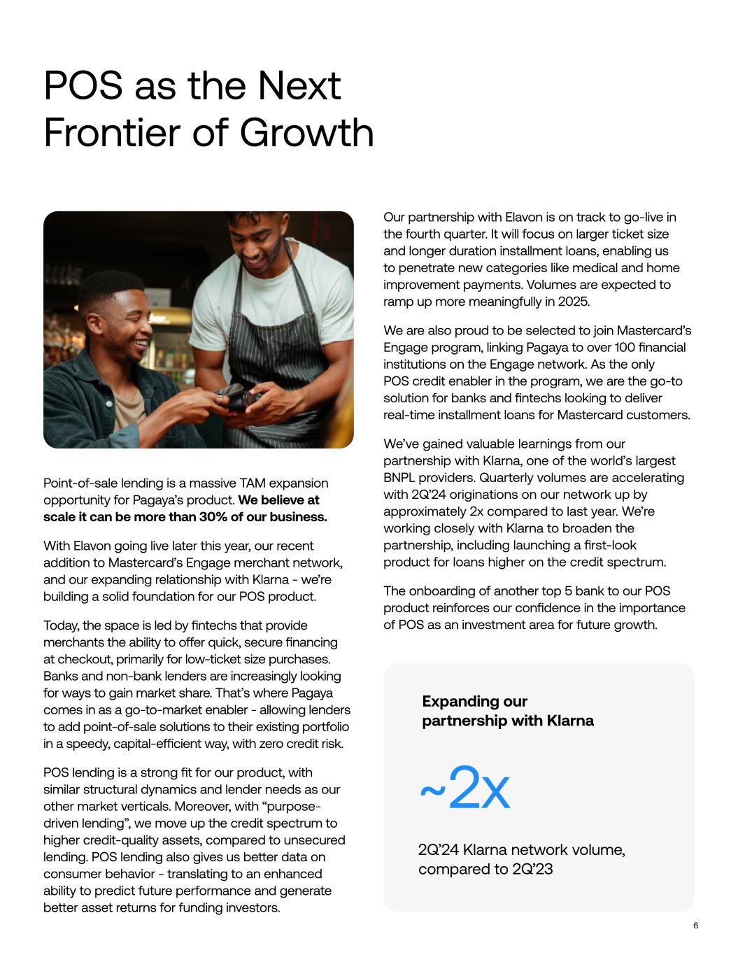 5 Adding New Enterprise Lenders to our Network We recently onboarded OneMain Financial to our network. With the addition of Elavon earlier this year, we’ve delivered our target to add at least two enterprise lenders to our network each year. And we are excited to announce that we are now onboarding another top 5 bank in our POS vertical. Our growth strategy is simple: expand our lending partner network. As more financial institutions sign up to use our product, we get access to more borrowers, more data, enhance our revenue generation potential and accelerate future growth. Demand for the Pagaya product is growing in an environment where regulatory pressures for lenders are increasing - with our solution, lenders can expand credit to more borrowers without capital requirements or credit risk. We continue to prioritize enterprise relationships with the largest lenders in the country. Following the initial integration, there are a multitude of opportunities to expand our product across consumer divisions within a single organization. Our recent partnership with U.S. Bank is a clear case study - in just a few months, we expanded our personal loan partnership to now include its point-of-sale business. OneMain Financial has selected Pagaya to support its foray into auto lending via its recent acquisition of Foursight. The partnership will eventually expand to an enterprise relationship to include its personal loan business - today the second largest in annual originations in the country. With our technology, OneMain will be able to approve more borrowers across its network of auto dealers and 1,400 branches, with volumes expected to go live in Q3. We also deepened our partnership with LendingClub, one of our bank partners and the country’s fourth largest personal loan originator, to our flagship credit decisioning product. This is an expansion beyond our existing smaller-scale secondary purchase program. As a further proof point of the value we’re providing to our partners, we have secured exclusivity arrangements with select partners to the majority of their second-look application flow. These are multi-year agreements, a proof point of the mutually beneficial nature of a stable partnership through market cycles. We continue to see an acceleration in our pipeline of prospective lending partners. Conversations with other deep funnel targets - which currently include 5 names primarily in auto and POS lending - continue to be productive and onboarding timeframes remain on track. It’s important to note that we’re always being thoughtful in how we drive conversion of our pipeline. Our priority is delivering value for our lenders and investors and growing in a profitable way. That means being prudent in the way we onboard new partners (which can take up to 12 months) and ramp up volumes post onboarding (which can take up to 18 months). Expanding the depth and breadth of our partner network
