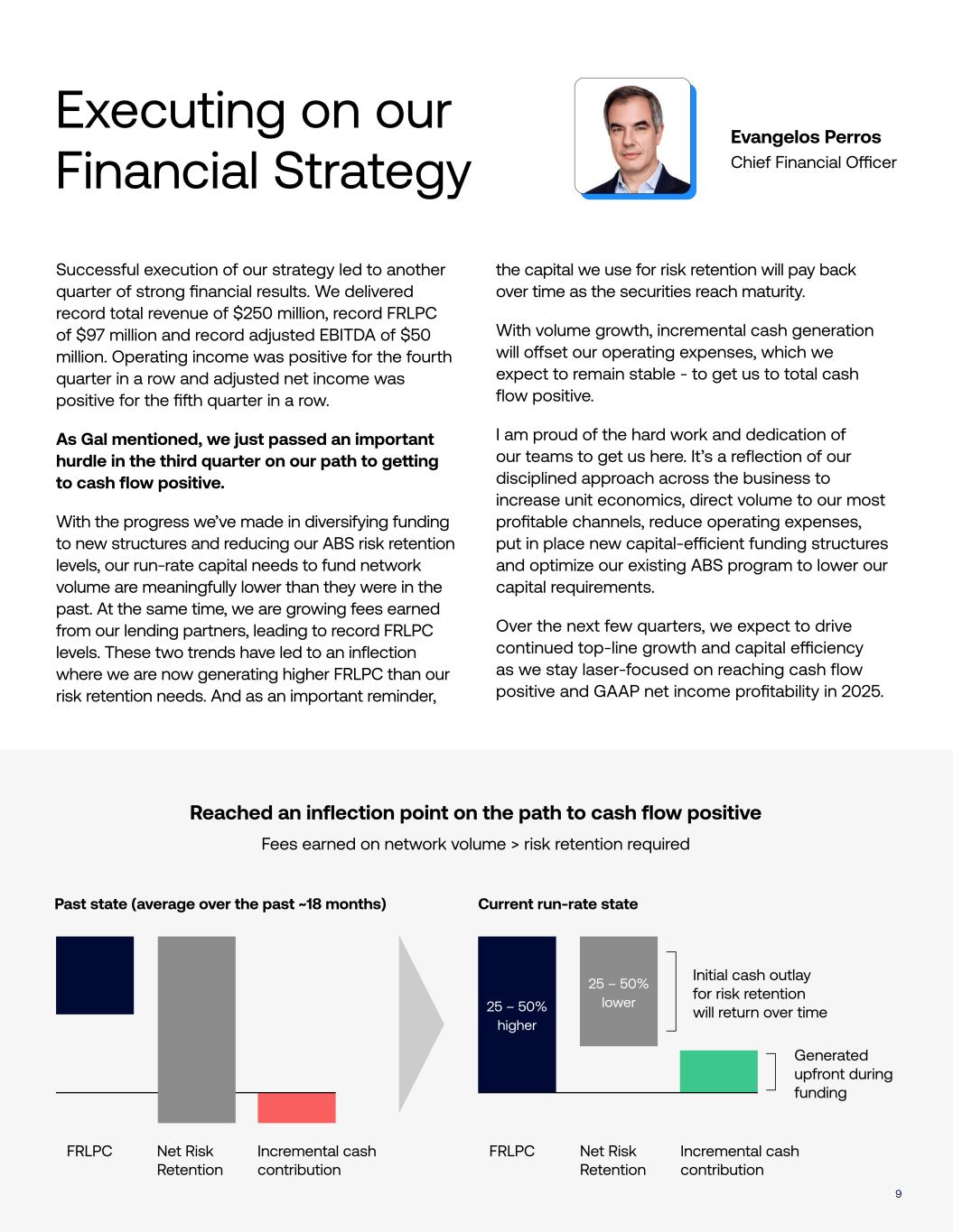 9 Evangelos Perros Chief Financial Officer Executing on our Financial Strategy Successful execution of our strategy led to another quarter of strong financial results. We delivered record total revenue of $250 million, record FRLPC of $97 million and record adjusted EBITDA of $50 million. Operating income was positive for the fourth quarter in a row and adjusted net income was positive for the fifth quarter in a row. As Gal mentioned, we just passed an important hurdle in the third quarter on our path to getting to cash flow positive. With the progress we’ve made in diversifying funding to new structures and reducing our ABS risk retention levels, our run-rate capital needs to fund network volume are meaningfully lower than they were in the past. At the same time, we are growing fees earned from our lending partners, leading to record FRLPC levels. These two trends have led to an inflection where we are now generating higher FRLPC than our risk retention needs. And as an important reminder, Reached an inflection point on the path to cash flow positive Fees earned on network volume > risk retention required Past state (average over the past ~18 months) FRLPC Net Risk Retention Incremental cash contribution Current run-rate state Net Risk Retention Incremental cash contribution FRLPC 25 – 50% higher 25 – 50% lower the capital we use for risk retention will pay back over time as the securities reach maturity. With volume growth, incremental cash generation will offset our operating expenses, which we expect to remain stable - to get us to total cash flow positive. I am proud of the hard work and dedication of our teams to get us here. It’s a reflection of our disciplined approach across the business to increase unit economics, direct volume to our most profitable channels, reduce operating expenses, put in place new capital-efficient funding structures and optimize our existing ABS program to lower our capital requirements. Over the next few quarters, we expect to drive continued top-line growth and capital efficiency as we stay laser-focused on reaching cash flow positive and GAAP net income profitability in 2025. Initial cash outlay for risk retention will return over time Generated upfront during funding