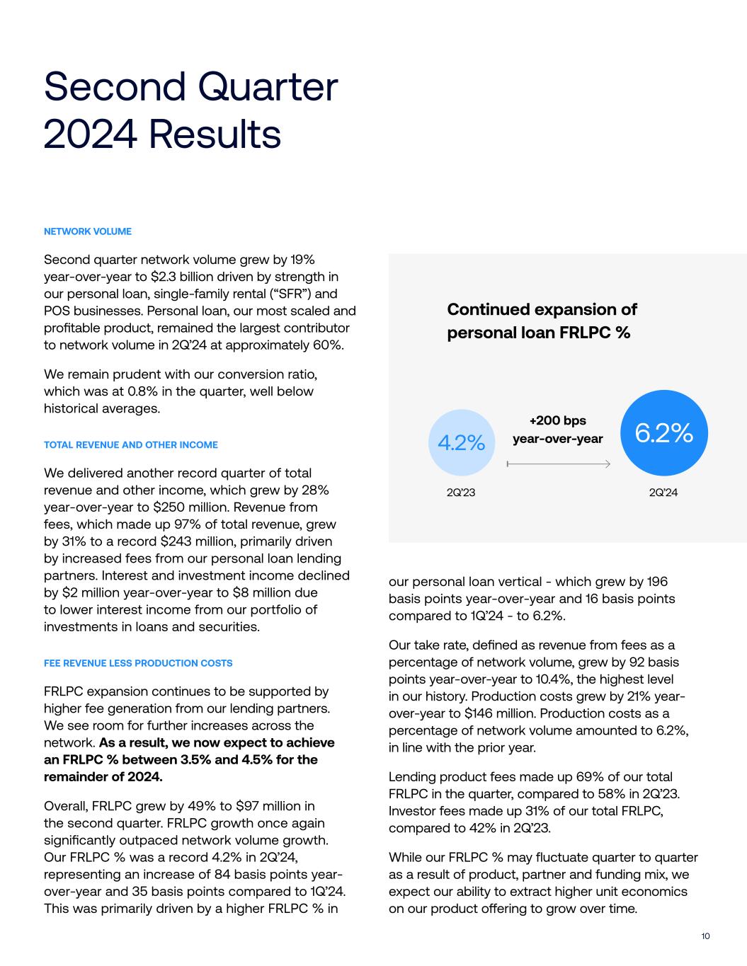 10 Second Quarter 2024 Results Continued expansion of personal loan FRLPC % +200 bps year-over-year 6.2%4.2% 2Q’23 2Q’24 NETWORK VOLUME Second quarter network volume grew by 19% year-over-year to $2.3 billion driven by strength in our personal loan, single-family rental (“SFR”) and POS businesses. Personal loan, our most scaled and profitable product, remained the largest contributor to network volume in 2Q’24 at approximately 60%. We remain prudent with our conversion ratio, which was at 0.8% in the quarter, well below historical averages. TOTAL REVENUE AND OTHER INCOME We delivered another record quarter of total revenue and other income, which grew by 28% year-over-year to $250 million. Revenue from fees, which made up 97% of total revenue, grew by 31% to a record $243 million, primarily driven by increased fees from our personal loan lending partners. Interest and investment income declined by $2 million year-over-year to $8 million due to lower interest income from our portfolio of investments in loans and securities. FEE REVENUE LESS PRODUCTION COSTS FRLPC expansion continues to be supported by higher fee generation from our lending partners. We see room for further increases across the network. As a result, we now expect to achieve an FRLPC % between 3.5% and 4.5% for the remainder of 2024. Overall, FRLPC grew by 49% to $97 million in the second quarter. FRLPC growth once again significantly outpaced network volume growth. Our FRLPC % was a record 4.2% in 2Q’24, representing an increase of 84 basis points year- over-year and 35 basis points compared to 1Q’24. This was primarily driven by a higher FRLPC % in our personal loan vertical - which grew by 196 basis points year-over-year and 16 basis points compared to 1Q’24 - to 6.2%. Our take rate, defined as revenue from fees as a percentage of network volume, grew by 92 basis points year-over-year to 10.4%, the highest level in our history. Production costs grew by 21% year- over-year to $146 million. Production costs as a percentage of network volume amounted to 6.2%, in line with the prior year. Lending product fees made up 69% of our total FRLPC in the quarter, compared to 58% in 2Q’23. Investor fees made up 31% of our total FRLPC, compared to 42% in 2Q’23. While our FRLPC % may fluctuate quarter to quarter as a result of product, partner and funding mix, we expect our ability to extract higher unit economics on our product offering to grow over time.