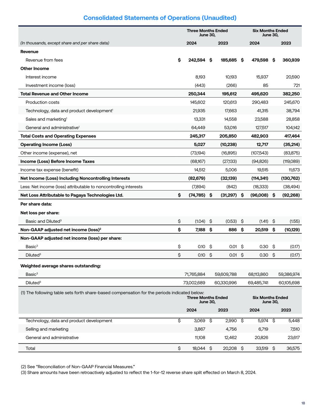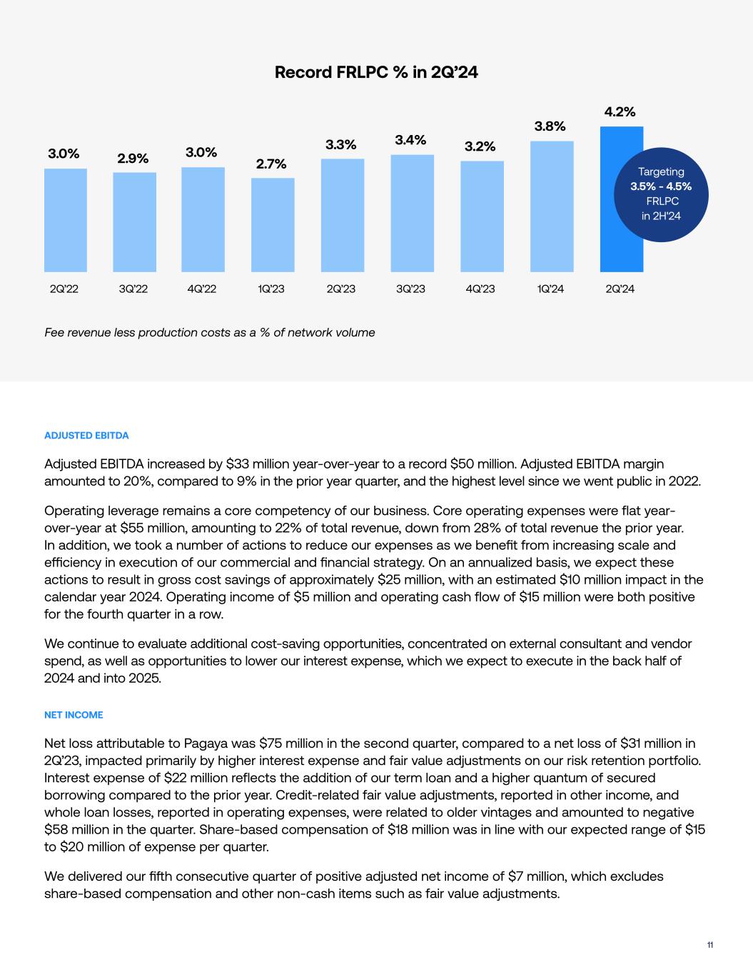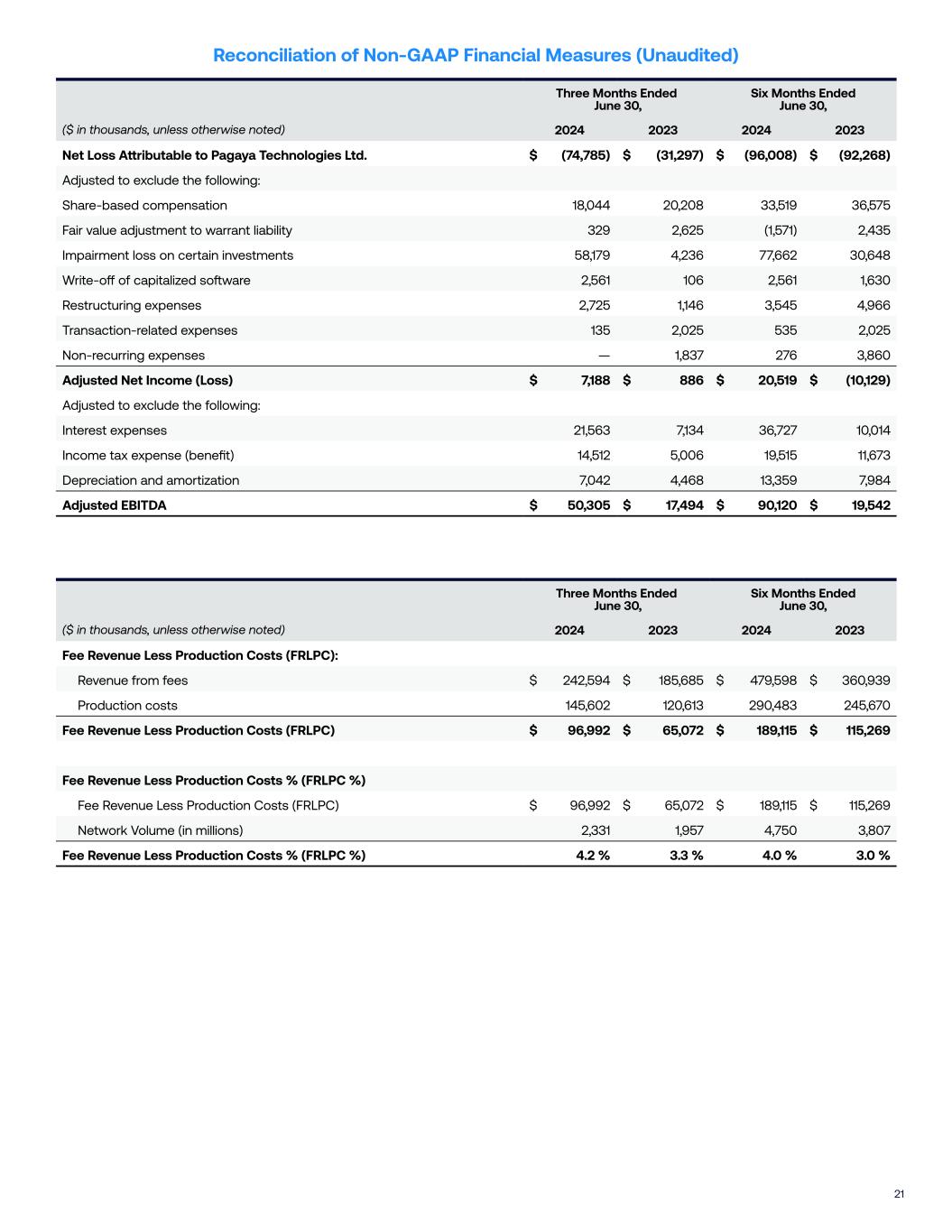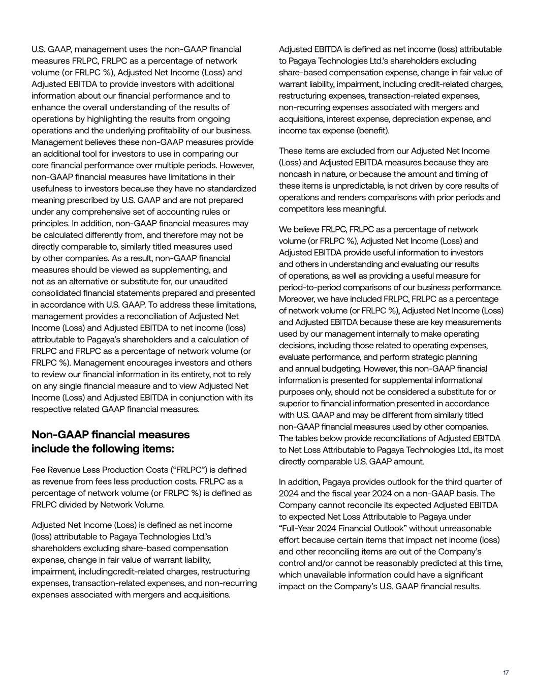 17 U.S. GAAP, management uses the non-GAAP financial measures FRLPC, FRLPC as a percentage of network volume (or FRLPC %), Adjusted Net Income (Loss) and Adjusted EBITDA to provide investors with additional information about our financial performance and to enhance the overall understanding of the results of operations by highlighting the results from ongoing operations and the underlying profitability of our business. Management believes these non-GAAP measures provide an additional tool for investors to use in comparing our core financial performance over multiple periods. However, non-GAAP financial measures have limitations in their usefulness to investors because they have no standardized meaning prescribed by U.S. GAAP and are not prepared under any comprehensive set of accounting rules or principles. In addition, non-GAAP financial measures may be calculated differently from, and therefore may not be directly comparable to, similarly titled measures used by other companies. As a result, non-GAAP financial measures should be viewed as supplementing, and not as an alternative or substitute for, our unaudited consolidated financial statements prepared and presented in accordance with U.S. GAAP. To address these limitations, management provides a reconciliation of Adjusted Net Income (Loss) and Adjusted EBITDA to net income (loss) attributable to Pagaya’s shareholders and a calculation of FRLPC and FRLPC as a percentage of network volume (or FRLPC %). Management encourages investors and others to review our financial information in its entirety, not to rely on any single financial measure and to view Adjusted Net Income (Loss) and Adjusted EBITDA in conjunction with its respective related GAAP financial measures. Non-GAAP financial measures include the following items: Fee Revenue Less Production Costs (“FRLPC”) is defined as revenue from fees less production costs. FRLPC as a percentage of network volume (or FRLPC %) is defined as FRLPC divided by Network Volume. Adjusted Net Income (Loss) is defined as net income (loss) attributable to Pagaya Technologies Ltd.’s shareholders excluding share-based compensation expense, change in fair value of warrant liability, impairment, includingcredit-related charges, restructuring expenses, transaction-related expenses, and non-recurring expenses associated with mergers and acquisitions. Adjusted EBITDA is defined as net income (loss) attributable to Pagaya Technologies Ltd.’s shareholders excluding share-based compensation expense, change in fair value of warrant liability, impairment, including credit-related charges, restructuring expenses, transaction-related expenses, non-recurring expenses associated with mergers and acquisitions, interest expense, depreciation expense, and income tax expense (benefit). These items are excluded from our Adjusted Net Income (Loss) and Adjusted EBITDA measures because they are noncash in nature, or because the amount and timing of these items is unpredictable, is not driven by core results of operations and renders comparisons with prior periods and competitors less meaningful. We believe FRLPC, FRLPC as a percentage of network volume (or FRLPC %), Adjusted Net Income (Loss) and Adjusted EBITDA provide useful information to investors and others in understanding and evaluating our results of operations, as well as providing a useful measure for period-to-period comparisons of our business performance. Moreover, we have included FRLPC, FRLPC as a percentage of network volume (or FRLPC %), Adjusted Net Income (Loss) and Adjusted EBITDA because these are key measurements used by our management internally to make operating decisions, including those related to operating expenses, evaluate performance, and perform strategic planning and annual budgeting. However, this non-GAAP financial information is presented for supplemental informational purposes only, should not be considered a substitute for or superior to financial information presented in accordance with U.S. GAAP and may be different from similarly titled non-GAAP financial measures used by other companies. The tables below provide reconciliations of Adjusted EBITDA to Net Loss Attributable to Pagaya Technologies Ltd., its most directly comparable U.S. GAAP amount. In addition, Pagaya provides outlook for the third quarter of 2024 and the fiscal year 2024 on a non-GAAP basis. The Company cannot reconcile its expected Adjusted EBITDA to expected Net Loss Attributable to Pagaya under “Full-Year 2024 Financial Outlook” without unreasonable effort because certain items that impact net income (loss) and other reconciling items are out of the Company’s control and/or cannot be reasonably predicted at this time, which unavailable information could have a significant impact on the Company’s U.S. GAAP financial results.