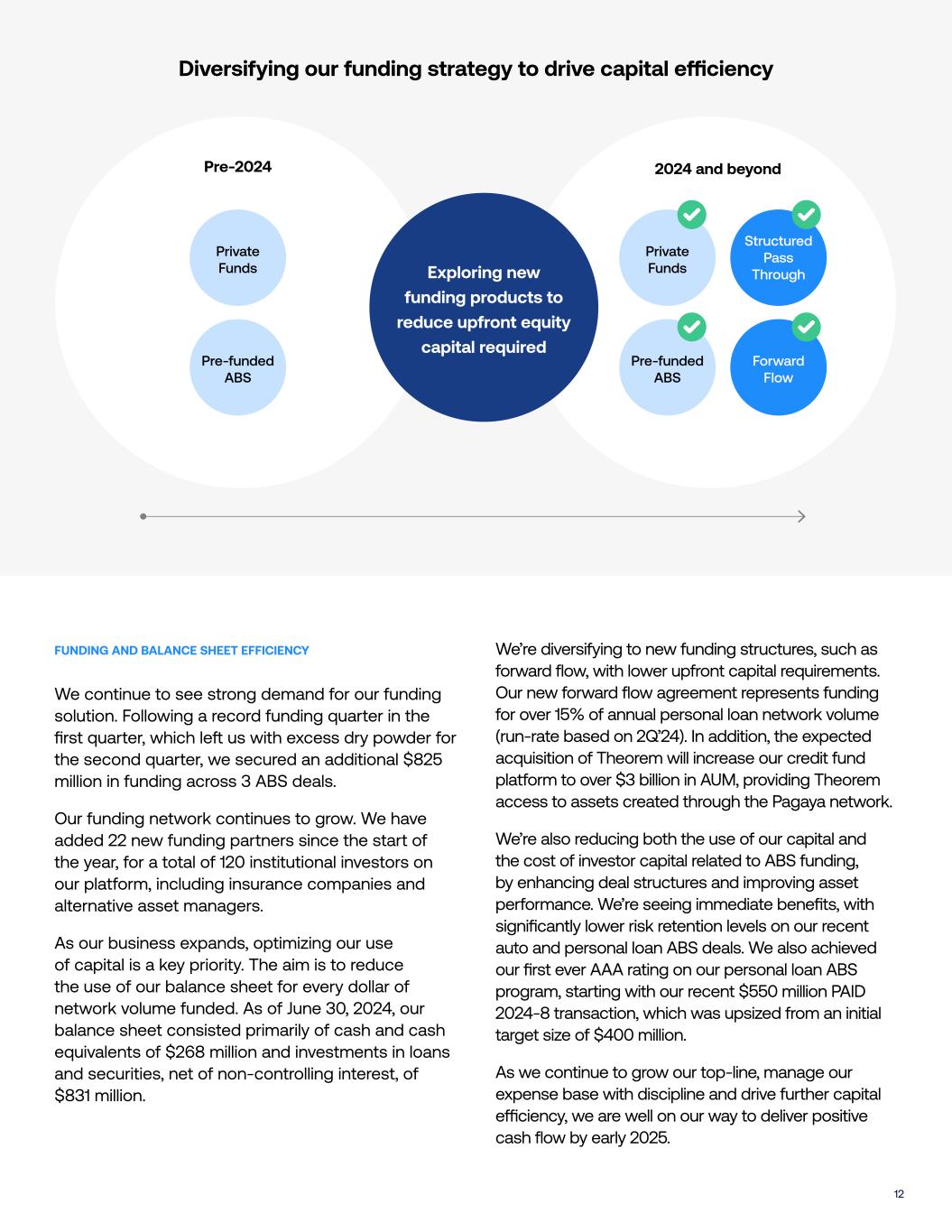 11 ADJUSTED EBITDA Adjusted EBITDA increased by $33 million year-over-year to a record $50 million. Adjusted EBITDA margin amounted to 20%, compared to 9% in the prior year quarter, and the highest level since we went public in 2022. Operating leverage remains a core competency of our business. Core operating expenses were flat year- over-year at $55 million, amounting to 22% of total revenue, down from 28% of total revenue the prior year. In addition, we took a number of actions to reduce our expenses as we benefit from increasing scale and efficiency in execution of our commercial and financial strategy. On an annualized basis, we expect these actions to result in gross cost savings of approximately $25 million, with an estimated $10 million impact in the calendar year 2024. Operating income of $5 million and operating cash flow of $15 million were both positive for the fourth quarter in a row. We continue to evaluate additional cost-saving opportunities, concentrated on external consultant and vendor spend, as well as opportunities to lower our interest expense, which we expect to execute in the back half of 2024 and into 2025. NET INCOME Net loss attributable to Pagaya was $75 million in the second quarter, compared to a net loss of $31 million in 2Q’23, impacted primarily by higher interest expense and fair value adjustments on our risk retention portfolio. Interest expense of $22 million reflects the addition of our term loan and a higher quantum of secured borrowing compared to the prior year. Credit-related fair value adjustments, reported in other income, and whole loan losses, reported in operating expenses, were related to older vintages and amounted to negative $58 million in the quarter. Share-based compensation of $18 million was in line with our expected range of $15 to $20 million of expense per quarter. We delivered our fifth consecutive quarter of positive adjusted net income of $7 million, which excludes share-based compensation and other non-cash items such as fair value adjustments. Record FRLPC % in 2Q’24 2Q’22 3.0% 3Q’22 4Q’22 1Q’23 2Q’23 3Q’23 4Q’23 1Q’24 2Q’24 3.0%2.9% 3.3% 2.7% 3.4% 3.2% 3.8% 4.2% Fee revenue less production costs as a % of network volume Targeting 3.5% - 4.5% FRLPC in 2H'24