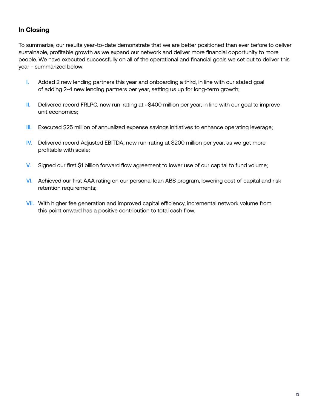 13 In Closing To summarize, our results year-to-date demonstrate that we are better positioned than ever before to deliver sustainable, profitable growth as we expand our network and deliver more financial opportunity to more people. We have executed successfully on all of the operational and financial goals we set out to deliver this year - summarized below: I. Added 2 new lending partners this year and onboarding a third, in line with our stated goal of adding 2-4 new lending partners per year, setting us up for long-term growth; II. Delivered record FRLPC, now run-rating at ~$400 million per year, in line with our goal to improve unit economics; III. Executed $25 million of annualized expense savings initiatives to enhance operating leverage; IV. Delivered record Adjusted EBITDA, now run-rating at $200 million per year, as we get more profitable with scale; V. Signed our first $1 billion forward flow agreement to lower use of our capital to fund volume; VI. Achieved our first AAA rating on our personal loan ABS program, lowering cost of capital and risk retention requirements; VII. With higher fee generation and improved capital efficiency, incremental network volume from this point onward has a positive contribution to total cash flow.