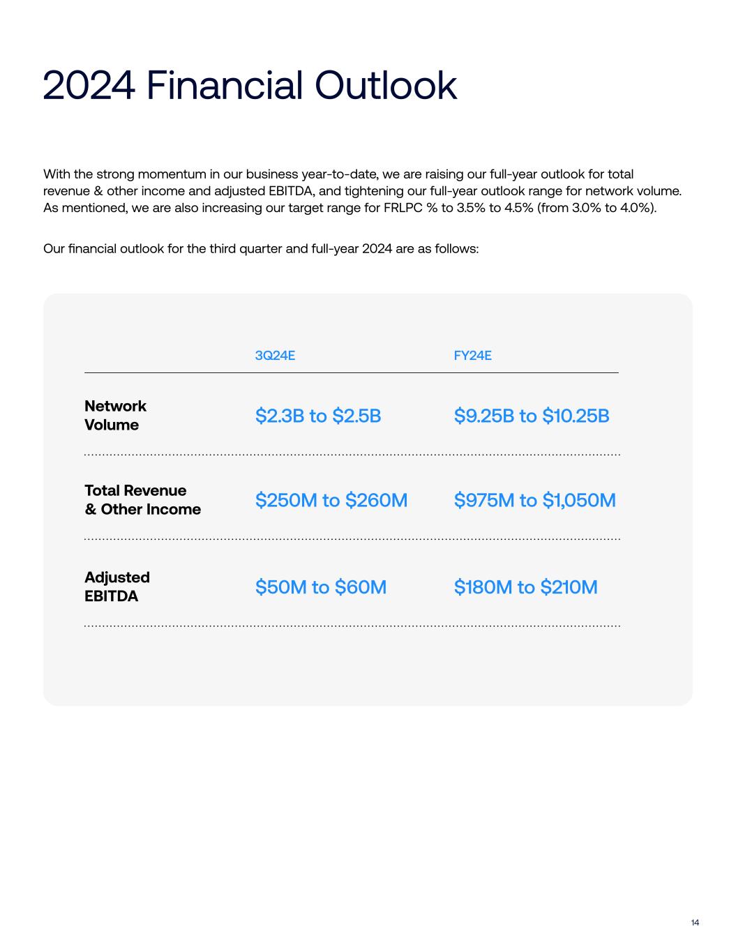 14 2024 Financial Outlook With the strong momentum in our business year-to-date, we are raising our full-year outlook for total revenue & other income and adjusted EBITDA, and tightening our full-year outlook range for network volume. As mentioned, we are also increasing our target range for FRLPC % to 3.5% to 4.5% (from 3.0% to 4.0%). Our financial outlook for the third quarter and full-year 2024 are as follows: Network Volume $9.25B to $10.25B$2.3B to $2.5B 3Q24E FY24E Total Revenue & Other Income $975M to $1,050M$250M to $260M Adjusted EBITDA $180M to $210M$50M to $60M