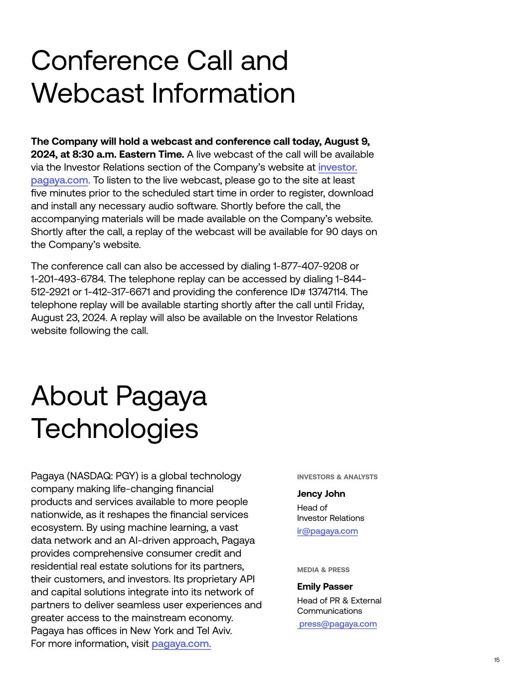 15 Conference Call and Webcast Information The Company will hold a webcast and conference call today, August 9, 2024, at 8:30 a.m. Eastern Time. A live webcast of the call will be available via the Investor Relations section of the Company’s website at investor. pagaya.com. To listen to the live webcast, please go to the site at least five minutes prior to the scheduled start time in order to register, download and install any necessary audio software. Shortly before the call, the accompanying materials will be made available on the Company’s website. Shortly after the call, a replay of the webcast will be available for 90 days on the Company’s website. The conference call can also be accessed by dialing 1-877-407-9208 or 1-201-493-6784. The telephone replay can be accessed by dialing 1-844- 512-2921 or 1-412-317-6671 and providing the conference ID# 13747114. The telephone replay will be available starting shortly after the call until Friday, August 23, 2024. A replay will also be available on the Investor Relations website following the call. About Pagaya Technologies Pagaya (NASDAQ: PGY) is a global technology company making life-changing financial products and services available to more people nationwide, as it reshapes the financial services ecosystem. By using machine learning, a vast data network and an AI-driven approach, Pagaya provides comprehensive consumer credit and residential real estate solutions for its partners, their customers, and investors. Its proprietary API and capital solutions integrate into its network of partners to deliver seamless user experiences and greater access to the mainstream economy. Pagaya has offices in New York and Tel Aviv. For more information, visit pagaya.com. INVESTORS & ANALYSTS Jency John Head of Investor Relations ir@pagaya.com MEDIA & PRESS Emily Passer Head of PR & External Communications press@pagaya.com