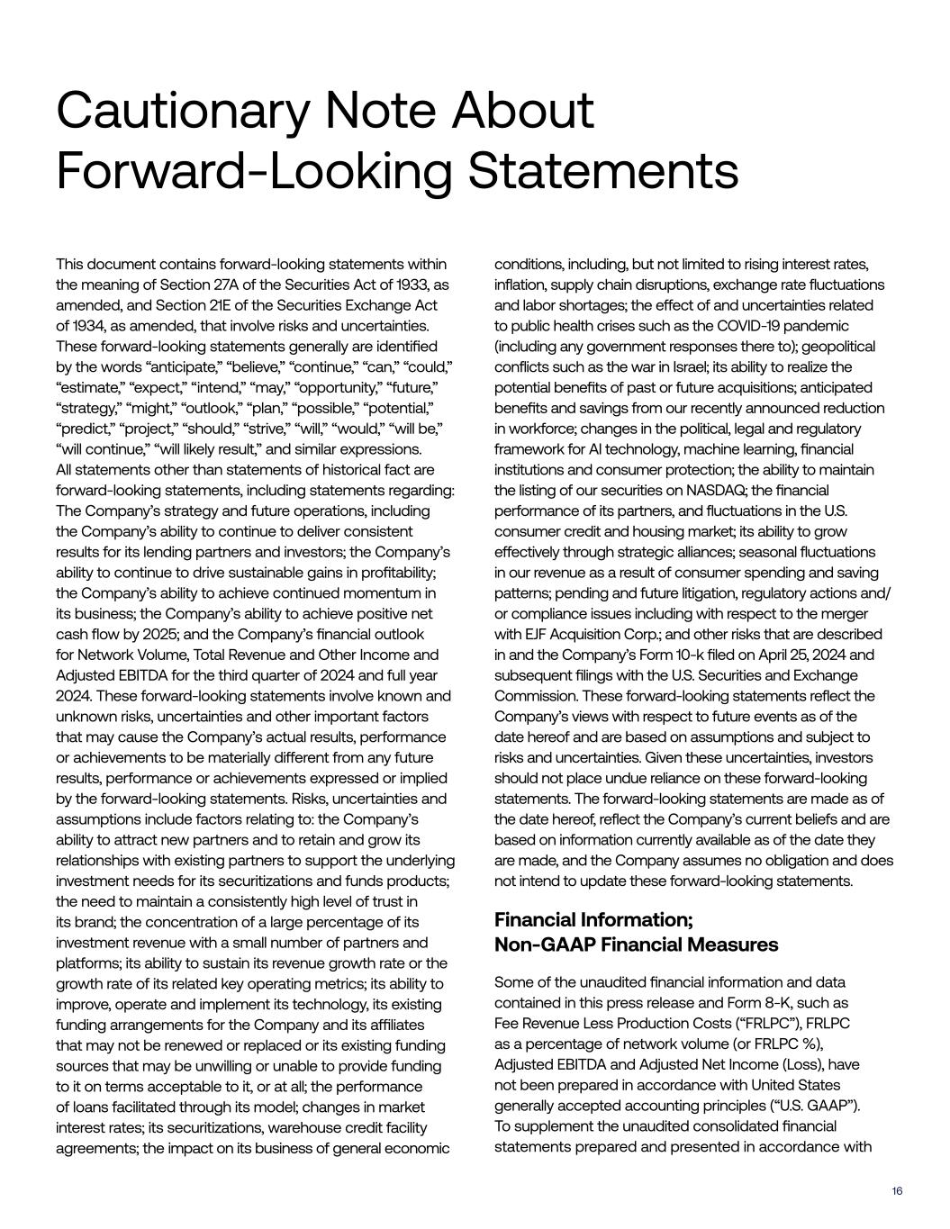 16 Cautionary Note About Forward-Looking Statements This document contains forward-looking statements within the meaning of Section 27A of the Securities Act of 1933, as amended, and Section 21E of the Securities Exchange Act of 1934, as amended, that involve risks and uncertainties. These forward-looking statements generally are identified by the words “anticipate,” “believe,” “continue,” “can,” “could,” “estimate,” “expect,” “intend,” “may,” “opportunity,” “future,” “strategy,” “might,” “outlook,” “plan,” “possible,” “potential,” “predict,” “project,” “should,” “strive,” “will,” “would,” “will be,” “will continue,” “will likely result,” and similar expressions. All statements other than statements of historical fact are forward-looking statements, including statements regarding: The Company’s strategy and future operations, including the Company’s ability to continue to deliver consistent results for its lending partners and investors; the Company’s ability to continue to drive sustainable gains in profitability; the Company’s ability to achieve continued momentum in its business; the Company’s ability to achieve positive net cash flow by 2025; and the Company’s financial outlook for Network Volume, Total Revenue and Other Income and Adjusted EBITDA for the third quarter of 2024 and full year 2024. These forward-looking statements involve known and unknown risks, uncertainties and other important factors that may cause the Company’s actual results, performance or achievements to be materially different from any future results, performance or achievements expressed or implied by the forward-looking statements. Risks, uncertainties and assumptions include factors relating to: the Company’s ability to attract new partners and to retain and grow its relationships with existing partners to support the underlying investment needs for its securitizations and funds products; the need to maintain a consistently high level of trust in its brand; the concentration of a large percentage of its investment revenue with a small number of partners and platforms; its ability to sustain its revenue growth rate or the growth rate of its related key operating metrics; its ability to improve, operate and implement its technology, its existing funding arrangements for the Company and its affiliates that may not be renewed or replaced or its existing funding sources that may be unwilling or unable to provide funding to it on terms acceptable to it, or at all; the performance of loans facilitated through its model; changes in market interest rates; its securitizations, warehouse credit facility agreements; the impact on its business of general economic conditions, including, but not limited to rising interest rates, inflation, supply chain disruptions, exchange rate fluctuations and labor shortages; the effect of and uncertainties related to public health crises such as the COVID-19 pandemic (including any government responses there to); geopolitical conflicts such as the war in Israel; its ability to realize the potential benefits of past or future acquisitions; anticipated benefits and savings from our recently announced reduction in workforce; changes in the political, legal and regulatory framework for AI technology, machine learning, financial institutions and consumer protection; the ability to maintain the listing of our securities on NASDAQ; the financial performance of its partners, and fluctuations in the U.S. consumer credit and housing market; its ability to grow effectively through strategic alliances; seasonal fluctuations in our revenue as a result of consumer spending and saving patterns; pending and future litigation, regulatory actions and/ or compliance issues including with respect to the merger with EJF Acquisition Corp.; and other risks that are described in and the Company’s Form 10-k filed on April 25, 2024 and subsequent filings with the U.S. Securities and Exchange Commission. These forward-looking statements reflect the Company’s views with respect to future events as of the date hereof and are based on assumptions and subject to risks and uncertainties. Given these uncertainties, investors should not place undue reliance on these forward-looking statements. The forward-looking statements are made as of the date hereof, reflect the Company’s current beliefs and are based on information currently available as of the date they are made, and the Company assumes no obligation and does not intend to update these forward-looking statements. Financial Information; Non-GAAP Financial Measures Some of the unaudited financial information and data contained in this press release and Form 8-K, such as Fee Revenue Less Production Costs (“FRLPC”), FRLPC as a percentage of network volume (or FRLPC %), Adjusted EBITDA and Adjusted Net Income (Loss), have not been prepared in accordance with United States generally accepted accounting principles (“U.S. GAAP”). To supplement the unaudited consolidated financial statements prepared and presented in accordance with