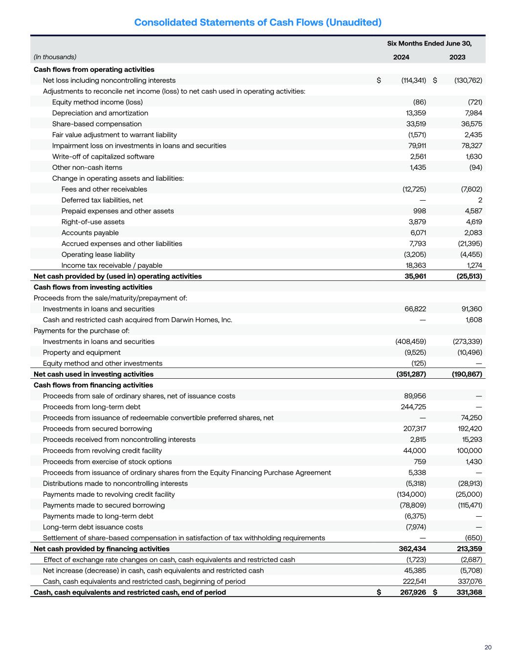 20 Six Months Ended June 30, (In thousands) 2024 2023 Cash flows from operating activities Net loss including noncontrolling interests $ (114,341) $ (130,762) Adjustments to reconcile net income (loss) to net cash used in operating activities: Equity method income (loss) (86) (721) Depreciation and amortization 13,359 7,984 Share-based compensation 33,519 36,575 Fair value adjustment to warrant liability (1,571) 2,435 Impairment loss on investments in loans and securities 79,911 78,327 Write-off of capitalized software 2,561 1,630 Other non-cash items 1,435 (94) Change in operating assets and liabilities: Fees and other receivables (12,725) (7,602) Deferred tax liabilities, net — 2 Prepaid expenses and other assets 998 4,587 Right-of-use assets 3,879 4,619 Accounts payable 6,071 2,083 Accrued expenses and other liabilities 7,793 (21,395) Operating lease liability (3,205) (4,455) Income tax receivable / payable 18,363 1,274 Net cash provided by (used in) operating activities 35,961 (25,513) Cash flows from investing activities Proceeds from the sale/maturity/prepayment of: Investments in loans and securities 66,822 91,360 Cash and restricted cash acquired from Darwin Homes, Inc. — 1,608 Payments for the purchase of: Investments in loans and securities (408,459) (273,339) Property and equipment (9,525) (10,496) Equity method and other investments (125) — Net cash used in investing activities (351,287) (190,867) Cash flows from financing activities Proceeds from sale of ordinary shares, net of issuance costs 89,956 — Proceeds from long-term debt 244,725 — Proceeds from issuance of redeemable convertible preferred shares, net — 74,250 Proceeds from secured borrowing 207,317 192,420 Proceeds received from noncontrolling interests 2,815 15,293 Proceeds from revolving credit facility 44,000 100,000 Proceeds from exercise of stock options 759 1,430 Proceeds from issuance of ordinary shares from the Equity Financing Purchase Agreement 5,338 — Distributions made to noncontrolling interests (5,318) (28,913) Payments made to revolving credit facility (134,000) (25,000) Payments made to secured borrowing (78,809) (115,471) Payments made to long-term debt (6,375) — Long-term debt issuance costs (7,974) — Settlement of share-based compensation in satisfaction of tax withholding requirements — (650) Net cash provided by financing activities 362,434 213,359 Effect of exchange rate changes on cash, cash equivalents and restricted cash (1,723) (2,687) Net increase (decrease) in cash, cash equivalents and restricted cash 45,385 (5,708) Cash, cash equivalents and restricted cash, beginning of period 222,541 337,076 Cash, cash equivalents and restricted cash, end of period $ 267,926 $ 331,368 Consolidated Statements of Cash Flows (Unaudited)
