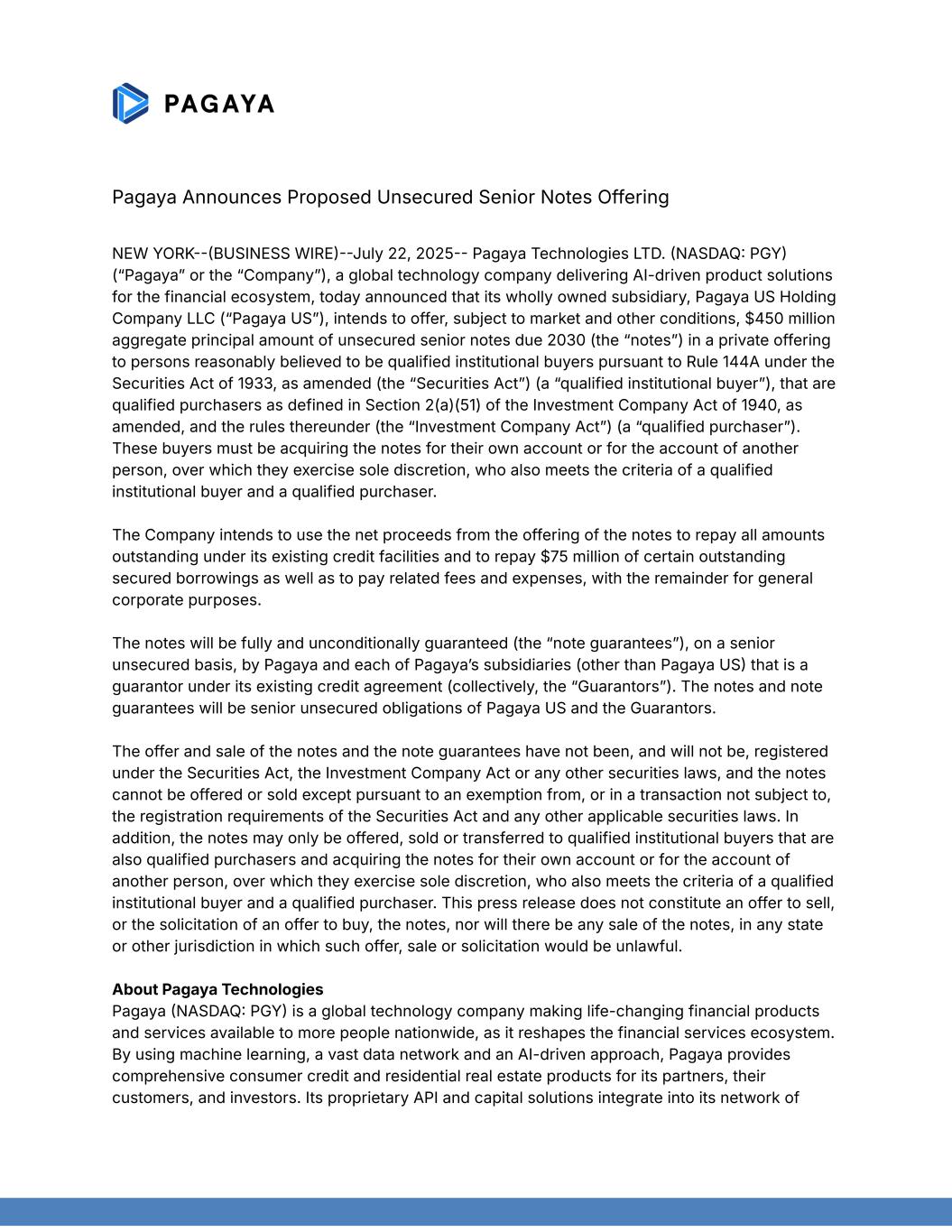 Pagaya Announces Proposed Unsecured Senior Notes Offering NEW YORKBUSINESS WIREJuly 22, 2025 Pagaya Technologies LTD. NASDAQ PGY (“Pagayaˮ or the “Companyˮ), a global technology company delivering AI-driven product solutions for the financial ecosystem, today announced that its wholly owned subsidiary, Pagaya US Holding Company LLC (“Pagaya USˮ), intends to offer, subject to market and other conditions, $450 million aggregate principal amount of unsecured senior notes due 2030 (the “notesˮ) in a private offering to persons reasonably believed to be qualified institutional buyers pursuant to Rule 144A under the Securities Act of 1933, as amended (the “Securities Actˮ) (a “qualified institutional buyerˮ), that are qualified purchasers as defined in Section 2(a)(51) of the Investment Company Act of 1940, as amended, and the rules thereunder (the “Investment Company Actˮ) (a “qualified purchaserˮ). These buyers must be acquiring the notes for their own account or for the account of another person, over which they exercise sole discretion, who also meets the criteria of a qualified institutional buyer and a qualified purchaser. The Company intends to use the net proceeds from the offering of the notes to repay all amounts outstanding under its existing credit facilities and to repay $75 million of certain outstanding secured borrowings as well as to pay related fees and expenses, with the remainder for general corporate purposes. The notes will be fully and unconditionally guaranteed (the “note guaranteesˮ), on a senior unsecured basis, by Pagaya and each of Pagayaʼs subsidiaries (other than Pagaya US that is a guarantor under its existing credit agreement (collectively, the “Guarantorsˮ). The notes and note guarantees will be senior unsecured obligations of Pagaya US and the Guarantors. The offer and sale of the notes and the note guarantees have not been, and will not be, registered under the Securities Act, the Investment Company Act or any other securities laws, and the notes cannot be offered or sold except pursuant to an exemption from, or in a transaction not subject to, the registration requirements of the Securities Act and any other applicable securities laws. In addition, the notes may only be offered, sold or transferred to qualified institutional buyers that are also qualified purchasers and acquiring the notes for their own account or for the account of another person, over which they exercise sole discretion, who also meets the criteria of a qualified institutional buyer and a qualified purchaser. This press release does not constitute an offer to sell, or the solicitation of an offer to buy, the notes, nor will there be any sale of the notes, in any state or other jurisdiction in which such offer, sale or solicitation would be unlawful. About Pagaya Technologies Pagaya NASDAQ PGY is a global technology company making life-changing financial products and services available to more people nationwide, as it reshapes the financial services ecosystem. By using machine learning, a vast data network and an AI-driven approach, Pagaya provides comprehensive consumer credit and residential real estate products for its partners, their customers, and investors. Its proprietary API and capital solutions integrate into its network of 0