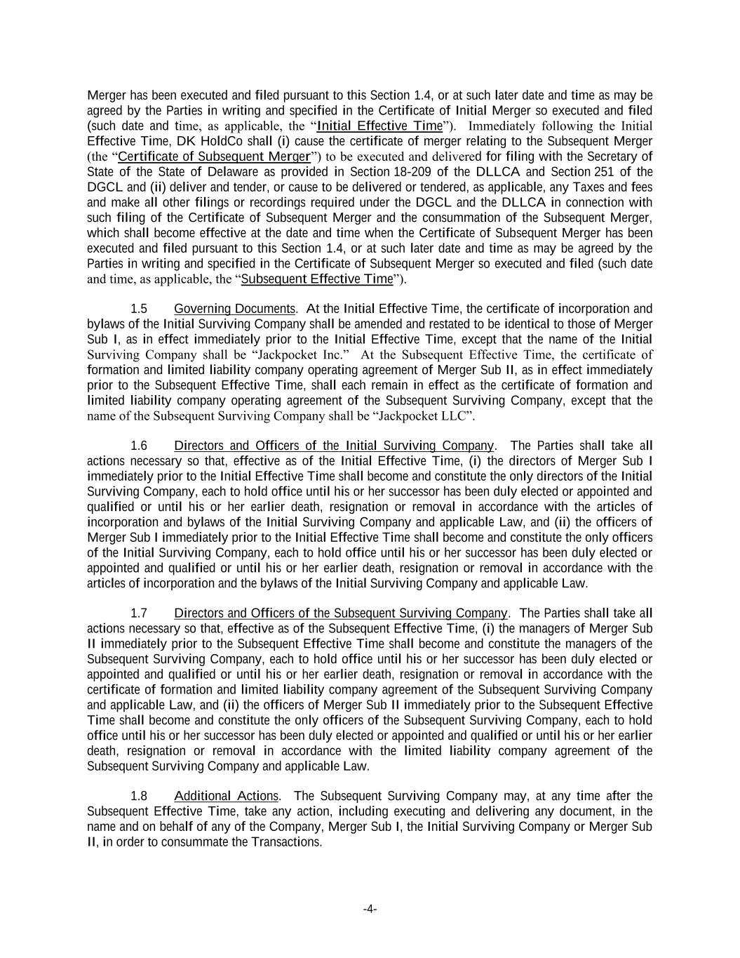 -4- Merger has been executed and filed pursuant to this Section 1.4, or at such later date and time as may be agreed by the Parties in writing and specified in the Certificate of Initial Merger so executed and filed (such date and time, as applicable, the “Initial Effective Time”). Immediately following the Initial Effective Time, DK HoldCo shall (i) cause the certificate of merger relating to the Subsequent Merger (the “Certificate of Subsequent Merger”) to be executed and delivered for filing with the Secretary of State of the State of Delaware as provided in Section 18-209 of the DLLCA and Section 251 of the DGCL and (ii) deliver and tender, or cause to be delivered or tendered, as applicable, any Taxes and fees and make all other filings or recordings required under the DGCL and the DLLCA in connection with such filing of the Certificate of Subsequent Merger and the consummation of the Subsequent Merger, which shall become effective at the date and time when the Certificate of Subsequent Merger has been executed and filed pursuant to this Section 1.4, or at such later date and time as may be agreed by the Parties in writing and specified in the Certificate of Subsequent Merger so executed and filed (such date and time, as applicable, the “Subsequent Effective Time”). 1.5 Governing Documents. At the Initial Effective Time, the certificate of incorporation and bylaws of the Initial Surviving Company shall be amended and restated to be identical to those of Merger Sub I, as in effect immediately prior to the Initial Effective Time, except that the name of the Initial Surviving Company shall be “Jackpocket Inc.” At the Subsequent Effective Time, the certificate of formation and limited liability company operating agreement of Merger Sub II, as in effect immediately prior to the Subsequent Effective Time, shall each remain in effect as the certificate of formation and limited liability company operating agreement of the Subsequent Surviving Company, except that the name of the Subsequent Surviving Company shall be “Jackpocket LLC”. 1.6 Directors and Officers of the Initial Surviving Company. The Parties shall take all actions necessary so that, effective as of the Initial Effective Time, (i) the directors of Merger Sub I immediately prior to the Initial Effective Time shall become and constitute the only directors of the Initial Surviving Company, each to hold office until his or her successor has been duly elected or appointed and qualified or until his or her earlier death, resignation or removal in accordance with the articles of incorporation and bylaws of the Initial Surviving Company and applicable Law, and (ii) the officers of Merger Sub I immediately prior to the Initial Effective Time shall become and constitute the only officers of the Initial Surviving Company, each to hold office until his or her successor has been duly elected or appointed and qualified or until his or her earlier death, resignation or removal in accordance with the articles of incorporation and the bylaws of the Initial Surviving Company and applicable Law. 1.7 Directors and Officers of the Subsequent Surviving Company. The Parties shall take all actions necessary so that, effective as of the Subsequent Effective Time, (i) the managers of Merger Sub II immediately prior to the Subsequent Effective Time shall become and constitute the managers of the Subsequent Surviving Company, each to hold office until his or her successor has been duly elected or appointed and qualified or until his or her earlier death, resignation or removal in accordance with the certificate of formation and limited liability company agreement of the Subsequent Surviving Company and applicable Law, and (ii) the officers of Merger Sub II immediately prior to the Subsequent Effective Time shall become and constitute the only officers of the Subsequent Surviving Company, each to hold office until his or her successor has been duly elected or appointed and qualified or until his or her earlier death, resignation or removal in accordance with the limited liability company agreement of the Subsequent Surviving Company and applicable Law. 1.8 Additional Actions. The Subsequent Surviving Company may, at any time after the Subsequent Effective Time, take any action, including executing and delivering any document, in the name and on behalf of any of the Company, Merger Sub I, the Initial Surviving Company or Merger Sub II, in order to consummate the Transactions.