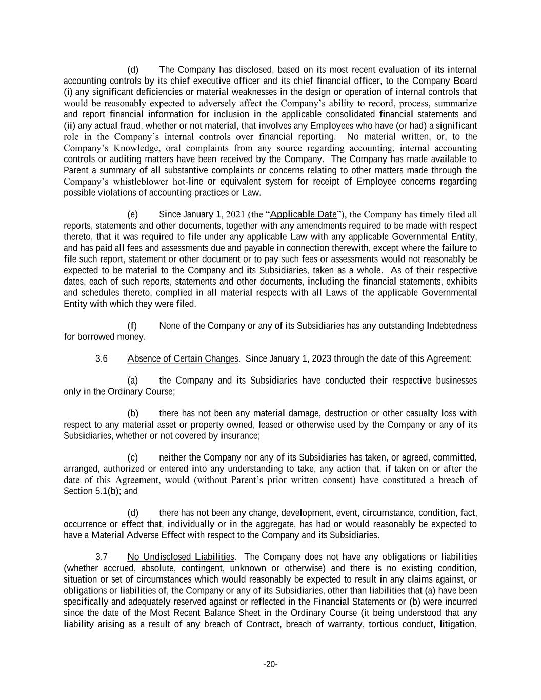 TABLE OF CONTENTS (continued) Page -iii- 4.10 Brokers and Finders ......................................................................................................... 40 4.11 Tax Matters. ..................................................................................................................... 40 4.12 Capitalization ................................................................................................................... 41 4.13 Absence of Certain Changes ............................................................................................ 41 4.14 Non-Reliance ................................................................................................................... 41 4.15 No Other Representations or Warranties ......................................................................... 41 ARTICLE V COVENANTS ...................................................................................................................... 42 5.1 Interim Operations. .......................................................................................................... 42 5.2 Cooperation; Status Updates ............................................................................................ 46 5.3 Regulatory Filings and Approvals ................................................................................... 46 5.4 No Solicitation of Acquisition Proposals or Change in Recommendation. ..................... 49 5.5 Required Stockholder Approval ...................................................................................... 50 5.6 Stockholder Support Agreements .................................................................................... 51 5.7 Information Statement ..................................................................................................... 51 5.8 Third-Party Consents ....................................................................................................... 52 5.9 Access and Reports; Retention of Books and Records .................................................... 52 5.10 Publicity ........................................................................................................................... 53 5.11 Employee Benefits. .......................................................................................................... 53 5.12 Indemnification; Directors’ and Officers’ Insurance. ...................................................... 55 5.13 Confidentiality ................................................................................................................. 56 5.14 Tax Matters. ..................................................................................................................... 56 5.15 Takeover Statutes ............................................................................................................. 61 5.16 R&W Insurance Policy. ................................................................................................... 61 5.17 Transfer of Private Placement Shares; Registration Statement ....................................... 61 5.18 Director and Officer Resignations ................................................................................... 65 5.19 Delivery of Data Room .................................................................................................... 65 5.20 Company Indebtedness .................................................................................................... 65 5.21 Lobbying .......................................................................................................................... 66 5.22 Continued Licensure ........................................................................................................ 66 5.23 Further Assurances .......................................................................................................... 66 ARTICLE VI CONDITIONS .................................................................................................................... 66 6.1 Conditions to Each Party’s Obligation to Consummate the Transactions ....................... 66