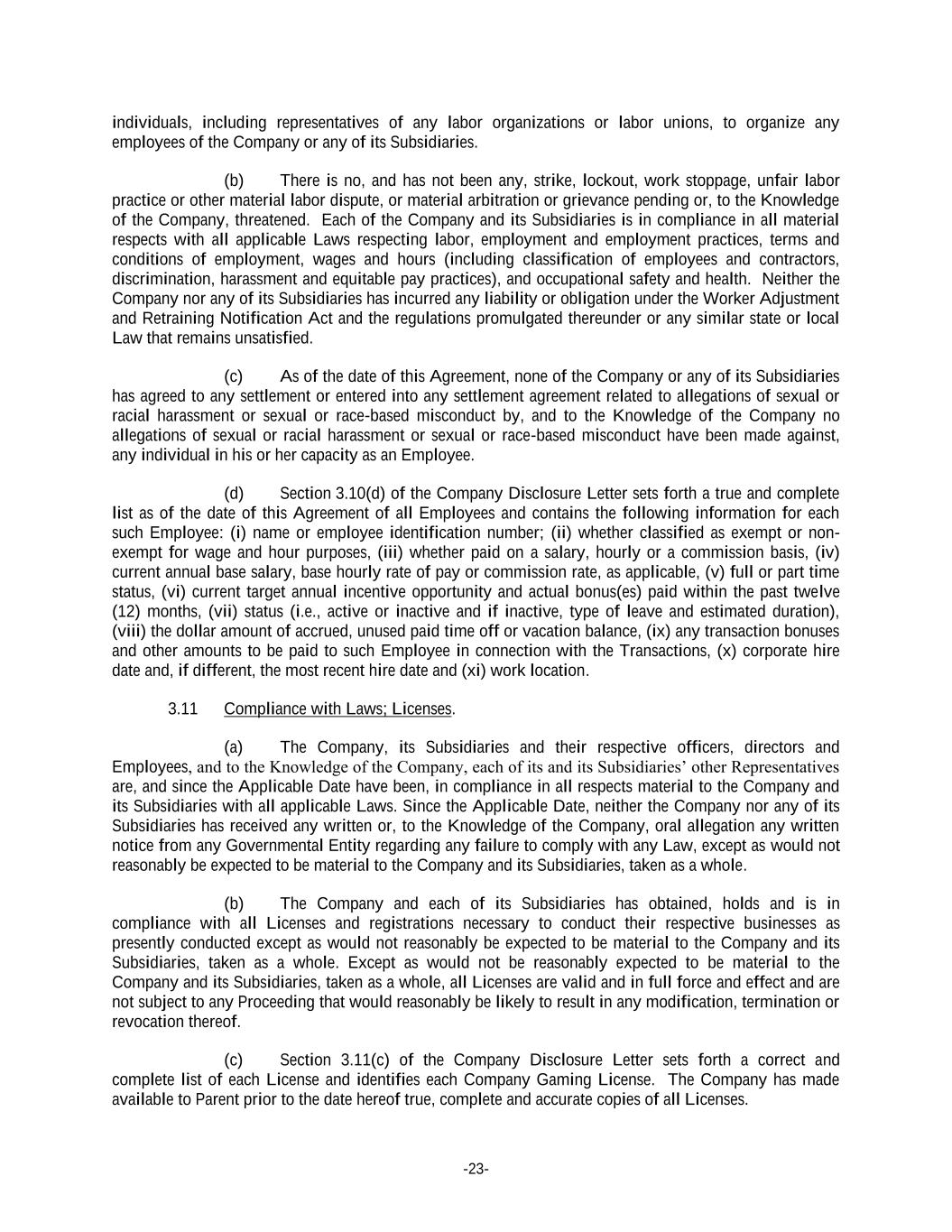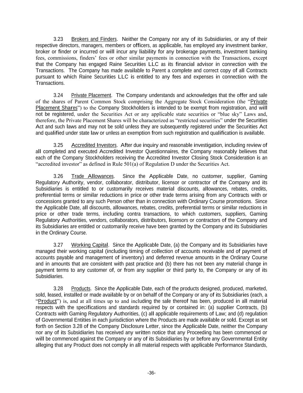 TABLE OF CONTENTS (continued) Page -ii- 3.10 Labor Matters. .................................................................................................................. 22 3.11 Compliance with Laws; Licenses. ................................................................................... 23 3.12 Takeover Statutes ............................................................................................................. 26 3.13 Material Contracts. ........................................................................................................... 26 3.14 Real Property. .................................................................................................................. 29 3.15 Environmental Matters .................................................................................................... 29 3.16 Taxes ................................................................................................................................ 30 3.17 Intellectual Property; IT Assets; Data Privacy. ................................................................ 32 3.18 Personal Property ............................................................................................................. 34 3.19 Insurance .......................................................................................................................... 35 3.20 Suppliers and Gaming Authorities. .................................................................................. 35 3.21 Related Party Transactions .............................................................................................. 35 3.22 Bank Accounts ................................................................................................................. 35 3.23 Brokers and Finders ......................................................................................................... 36 3.24 Private Placement ............................................................................................................ 36 3.25 Accredited Investors ........................................................................................................ 36 3.26 Trade Allowances ............................................................................................................ 36 3.27 Working Capital ............................................................................................................... 36 3.28 Products ........................................................................................................................... 36 3.29 Information ...................................................................................................................... 37 3.30 Non-Reliance ................................................................................................................... 37 3.31 No Other Representations or Warranties ......................................................................... 37 ARTICLE IV REPRESENTATIONS AND WARRANTIES OF PARENT, DK HOLDCO, MERGER SUB I AND MERGER SUB II ...................................................................... 37 4.1 Organization, Good Standing and Qualification .............................................................. 38 4.2 Parent Common Stock ..................................................................................................... 38 4.3 Authority; Approval ......................................................................................................... 38 4.4 Governmental Filings; No Violations. ............................................................................. 38 4.5 Public Filings ................................................................................................................... 39 4.6 Legal Proceedings ............................................................................................................ 39 4.7 Available Funds ............................................................................................................... 40 4.8 Merger Sub I and DK HoldCo ......................................................................................... 40 4.9 Merger Sub II ................................................................................................................... 40