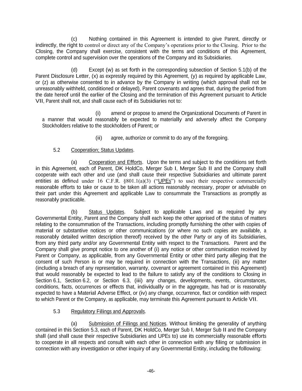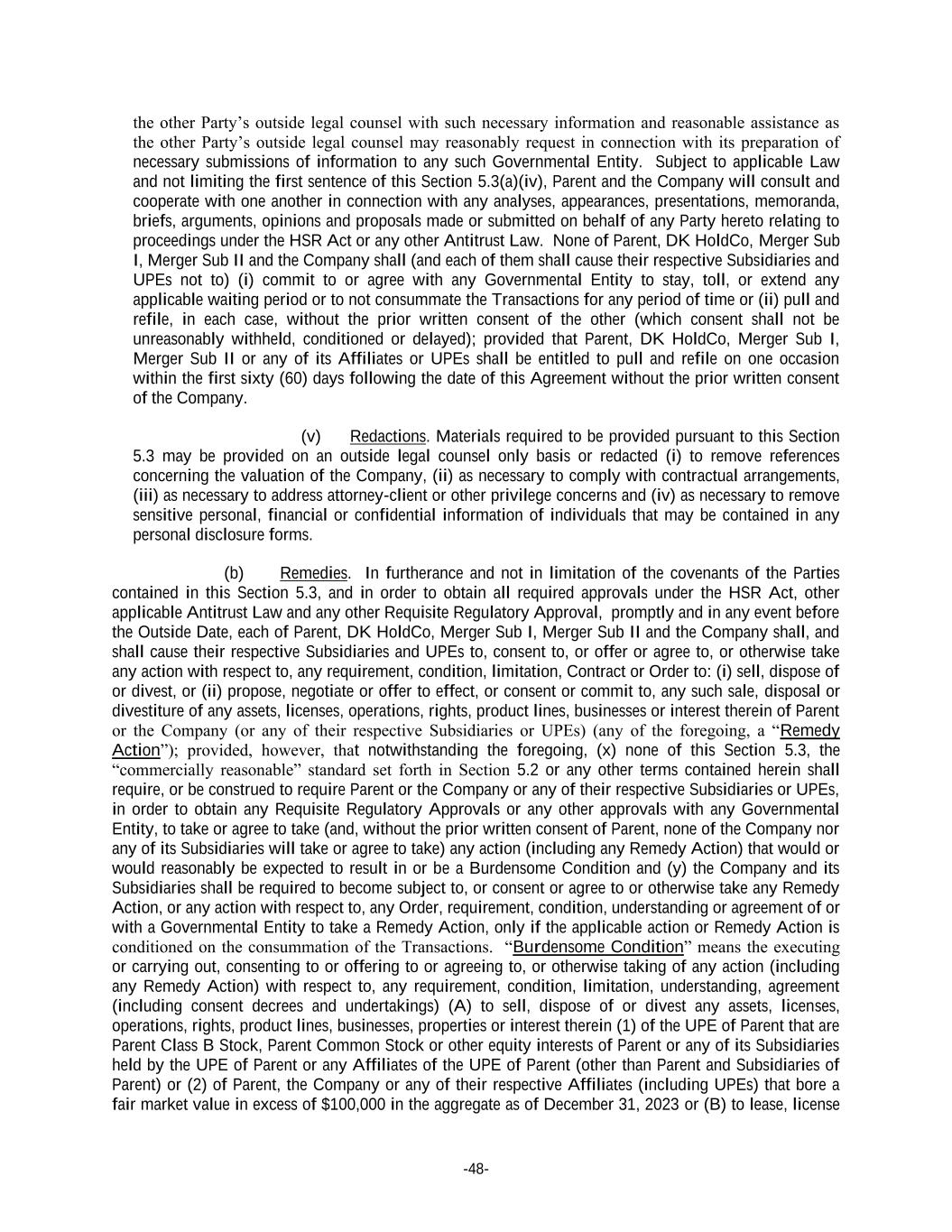 -3- and sufficiency of which are hereby acknowledged, accepted and agreed to, the Parties, intending to be legally bound, hereby agree as follows: ARTICLE I THE MERGERS; CLOSING; INITIAL EFFECTIVE TIME; SUBSEQUENT EFFECTIVE TIME; PAYMENTS AT CLOSING 1.1 The Initial Merger; Effects of the Initial Merger. On the terms and subject to the conditions set forth in this Agreement and the applicable provisions of the DGCL, (a) at the Initial Effective Time, Merger Sub I will be merged with and into the Company in accordance with the DGCL and the separate corporate existence of the Merger Sub I shall thereupon cease, (b) the Company will be the Initial Surviving Company in the Initial Merger and, from and after the Initial Effective Time, will be a direct wholly-owned subsidiary of DK HoldCo, which, in turn, will, from and after Initial Effective Time and until the Subsequent Effective Time, be a direct wholly-owned subsidiary of Parent, and the separate corporate existence of the Company with all of its rights, privileges, immunities, powers and franchises will continue unaffected by the Initial Merger as provided in the DGCL, and (c) from and after the Initial Effective Time, the Initial Merger shall have such other effects set forth in this Agreement and the applicable provisions of the DGCL. 1.2 The Subsequent Merger; Effects of the Subsequent Merger. On the terms and subject to the conditions set forth in this Agreement and the applicable provisions of the DGCL and the DLLCA, (a) immediately following the effectiveness of the Initial Merger, the Initial Surviving Company will be merged with and into Merger Sub II in accordance with the DGCL and the DLLCA and the separate corporate existence of Initial Surviving Company will thereupon cease, (b) Merger Sub II will be the Subsequent Surviving Company in the Subsequent Merger and, from and after the Subsequent Effective Time, will be a direct wholly-owned limited liability company subsidiary of DK HoldCo, which, in turn, will, from and after Subsequent Effective Time, be a direct wholly-owned subsidiary of Parent and the separate existence of Merger Sub II with all of its rights, privileges, immunities, powers and franchises will continue unaffected by the Subsequent Merger, as provided in the DGCL and the DLLCA, and (c) from and after the Subsequent Effective Time, the Subsequent Merger will have the effects set forth in this Agreement and the applicable provisions of the DGCL and the DLLCA. 1.3 Closing. The closing of the Initial Merger (the “Closing”) shall take place by remote communication and by the exchange of signatures by electronic transmission and to the extent a physical location is required or exchange by electronic transmission is not practicable, at the offices of Sullivan & Cromwell LLP, 125 Broad Street, New York, New York 10004, at 9:00 a.m. prevailing Eastern Time on the third (3rd) Business Day following the day on which the last to be satisfied or waived of the conditions set forth in Article VI (other than those conditions that by their nature are to be satisfied or waived at the Closing, but subject to the satisfaction or waiver of those conditions) have been satisfied or waived in accordance with this Agreement or at such other date, time or place (including by means of remote communication) as the Parties may mutually agree in writing (the date on which the Closing actually occurs, the “Closing Date”). 1.4 Initial Merger Effective Time and Subsequent Merger Effective Time. On the date of the Closing, the Company and DK HoldCo shall (a) cause the certificate of merger relating to the Initial Merger (the “Certificate of Initial Merger”) to be executed and filed with the Secretary of State of the State of Delaware as provided in Section 251 of the DGCL and (b) deliver and tender, or cause to be delivered or tendered, as applicable, any Taxes and fees and make all other filings or recordings required under the DGCL in connection with such filing of the Certificate of Initial Merger and the consummation of the Initial Merger, which shall become effective at the date and time when the Certificate of Initial