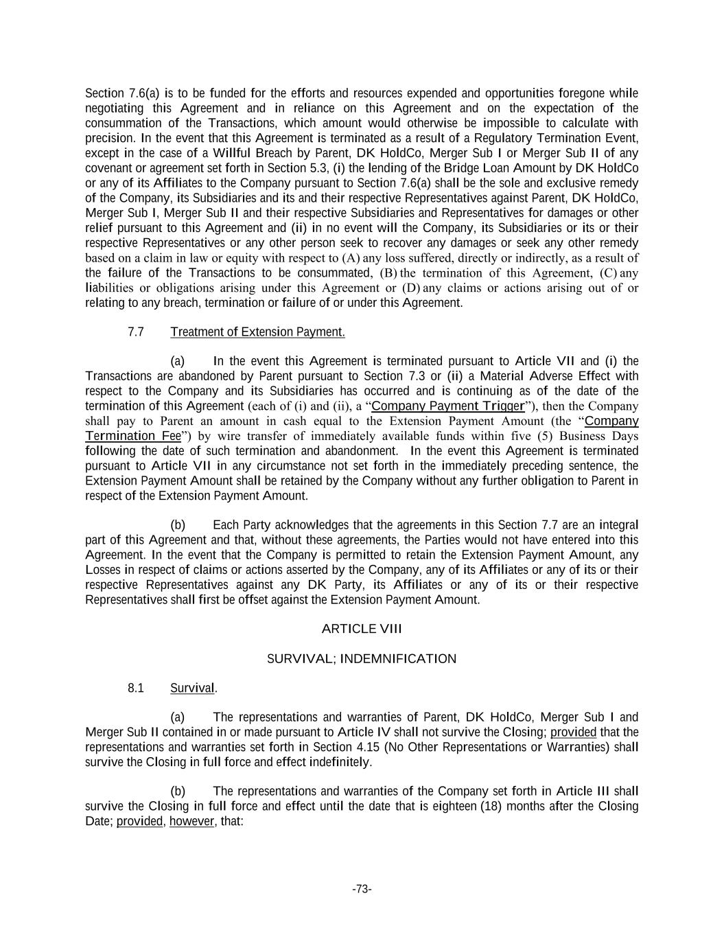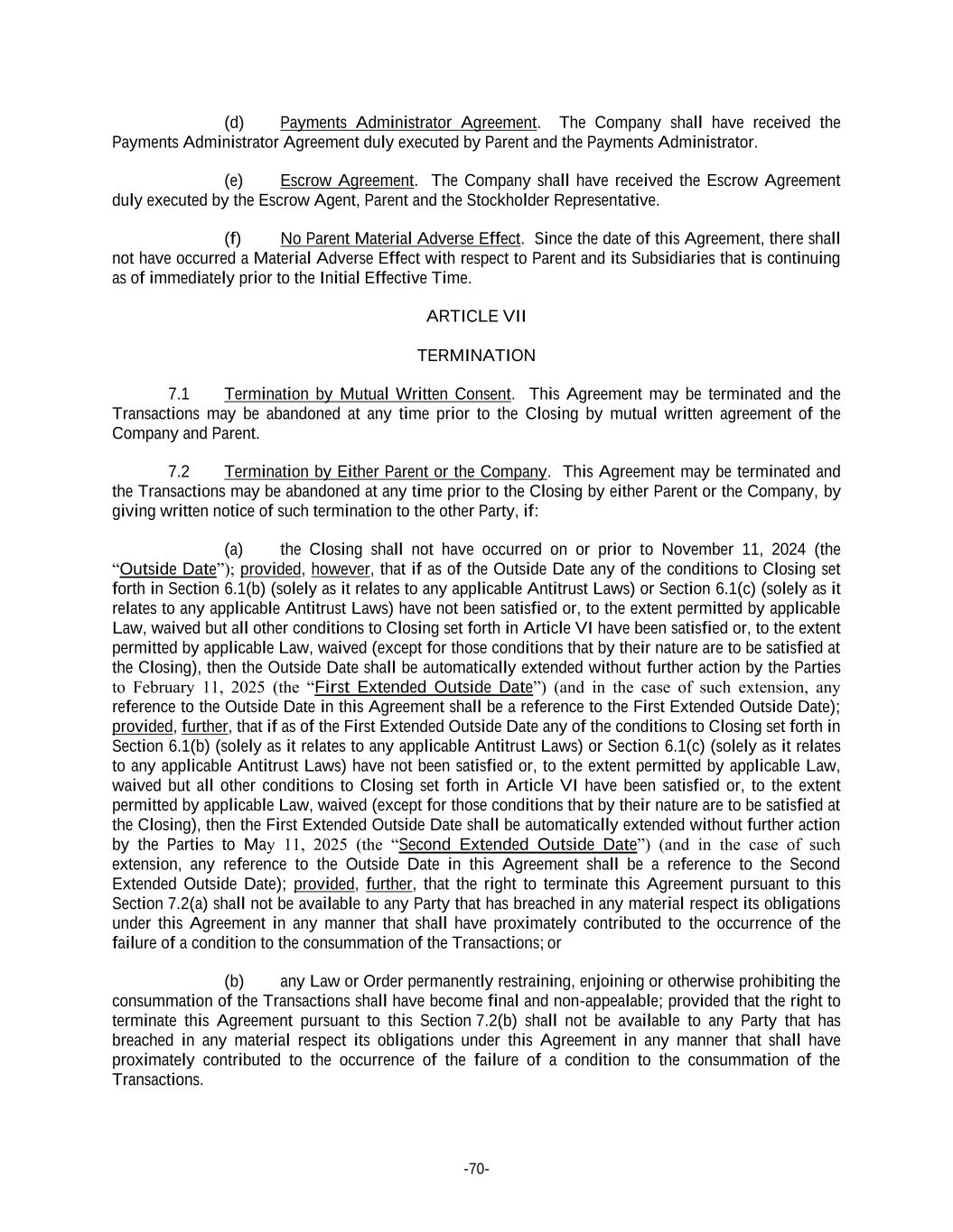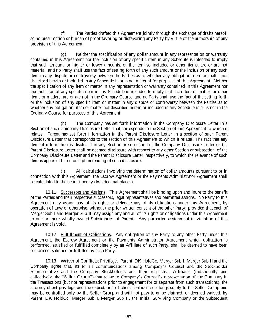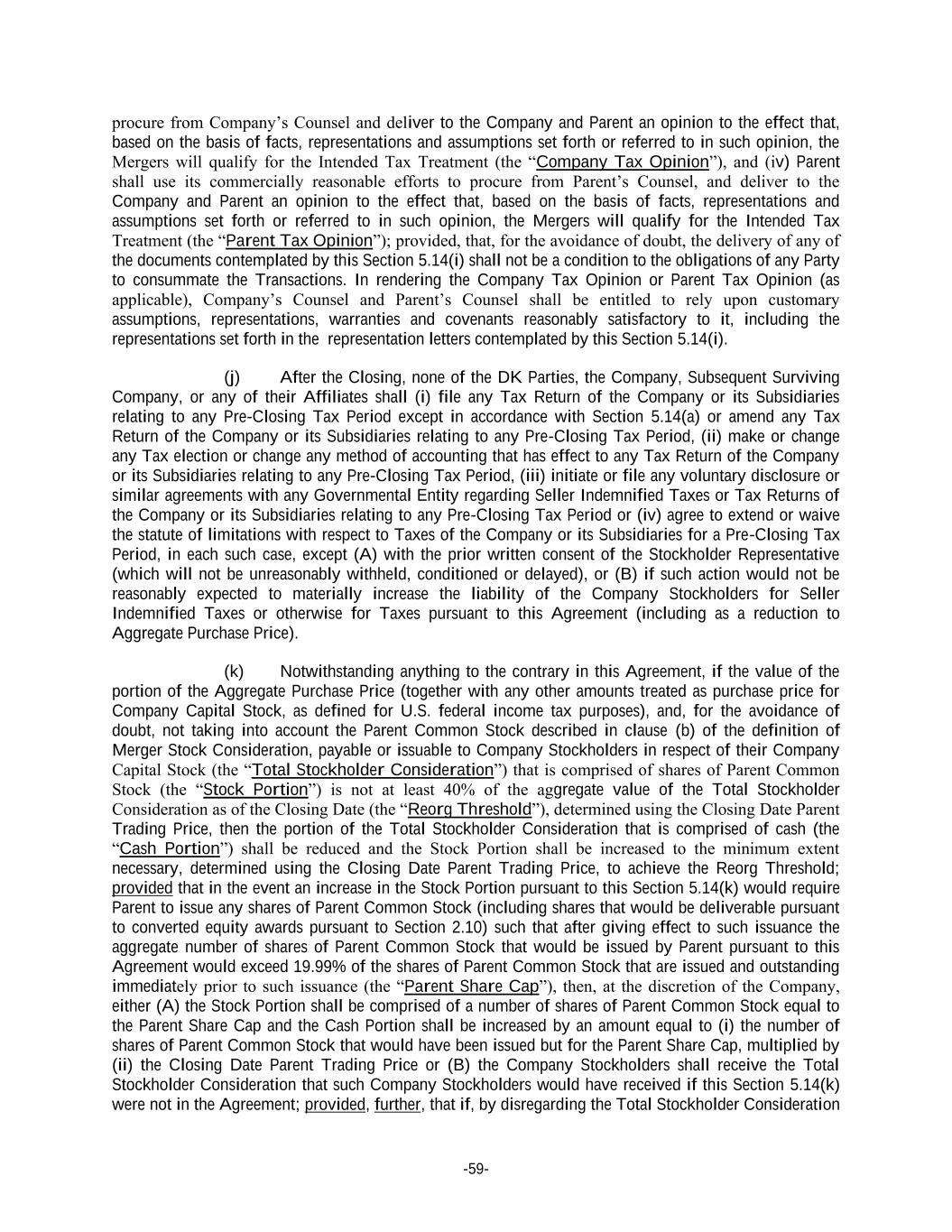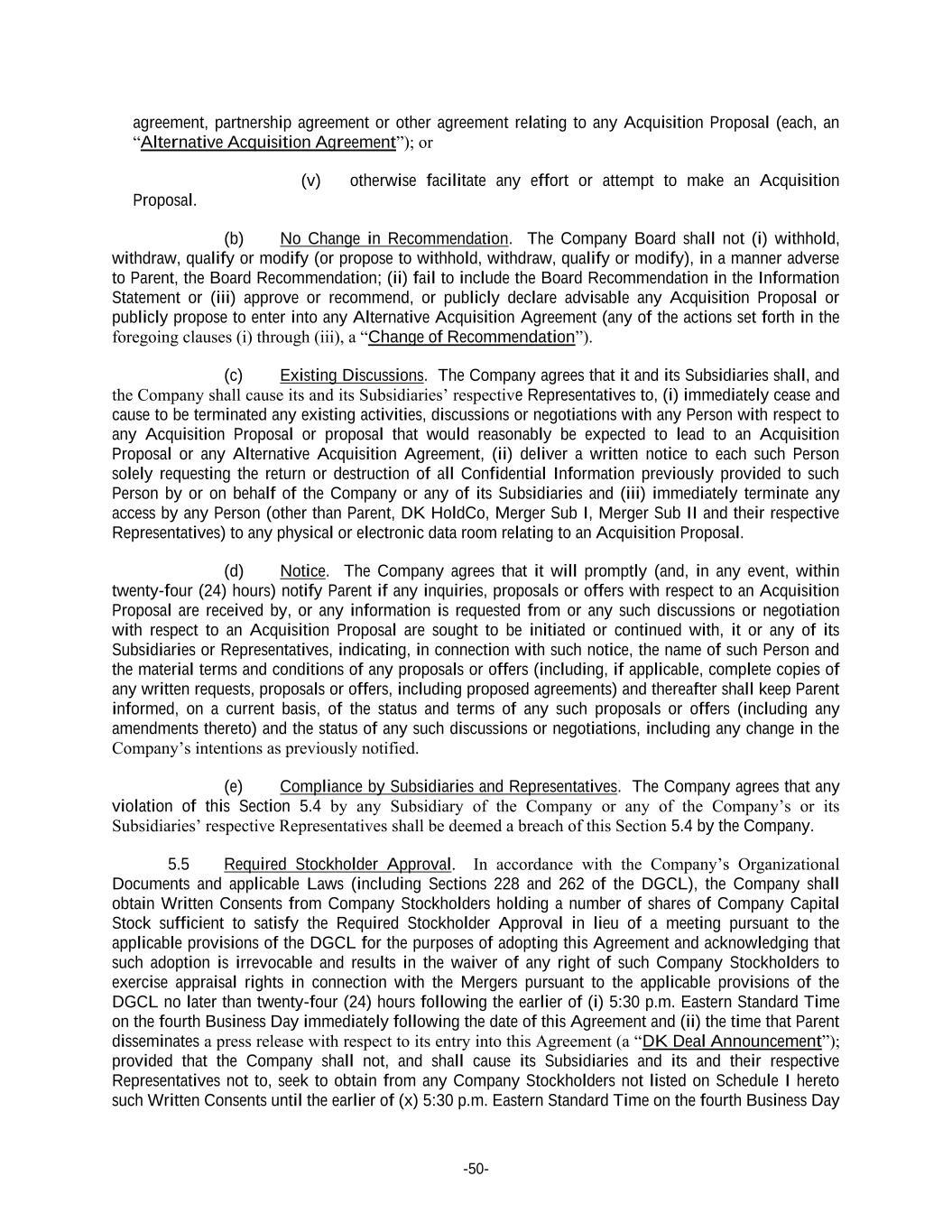TABLE OF CONTENTS (continued) Page -iv- 6.2 Conditions to Obligation of Parent, DK HoldCo, Merger Sub and Merger Sub I ........... 66 6.3 Conditions to Obligation of the Company ....................................................................... 69 ARTICLE VII TERMINATION ............................................................................................................... 70 7.1 Termination by Mutual Written Consent ......................................................................... 70 7.2 Termination by Either Parent or the Company ................................................................ 70 7.3 Termination by Parent ..................................................................................................... 71 7.4 Termination by the Company .......................................................................................... 71 7.5 Effect of Termination and Abandonment ........................................................................ 71 7.6 Bridge Loan ..................................................................................................................... 71 7.7 Treatment of Extension Payment ..................................................................................... 73 ARTICLE VIII SURVIVAL; INDEMNIFICATION ................................................................................ 73 8.1 Survival. ........................................................................................................................... 73 8.2 Indemnification by Company Stockholders. .................................................................... 74 8.3 Claim Procedures. ............................................................................................................ 76 8.4 Recoveries. ....................................................................................................................... 77 8.5 Indemnity Payments. ....................................................................................................... 78 8.6 Exclusive Remedies ......................................................................................................... 79 8.7 No Effect on R&W Insurance Policy ............................................................................... 79 ARTICLE IX STOCKHOLDER REPRESENTATIVE ............................................................................ 79 9.1 Acknowledgement ........................................................................................................... 79 9.2 Stockholder Representative Expense Amount ................................................................. 81 9.3 Exculpation and Indemnification of Stockholder Representative .................................... 81 9.4 Reliance ........................................................................................................................... 82 9.5 Replacement of the Stockholder Representative ............................................................. 82 ARTICLE X MISCELLANEOUS AND GENERAL ............................................................................... 82 10.1 Modification or Amendment; Waiver .............................................................................. 82 10.2 Expenses .......................................................................................................................... 82 10.3 Counterparts ..................................................................................................................... 83 10.4 Governing Law and Venue; Submission to Jurisdiction; Selection of Forum; Waiver of Trial by Jury; Specific Performance. .............................................................. 83 10.5 Notices ............................................................................................................................. 84 10.6 Entire Agreement ............................................................................................................. 85 10.7 No Third Party Beneficiaries ........................................................................................... 85