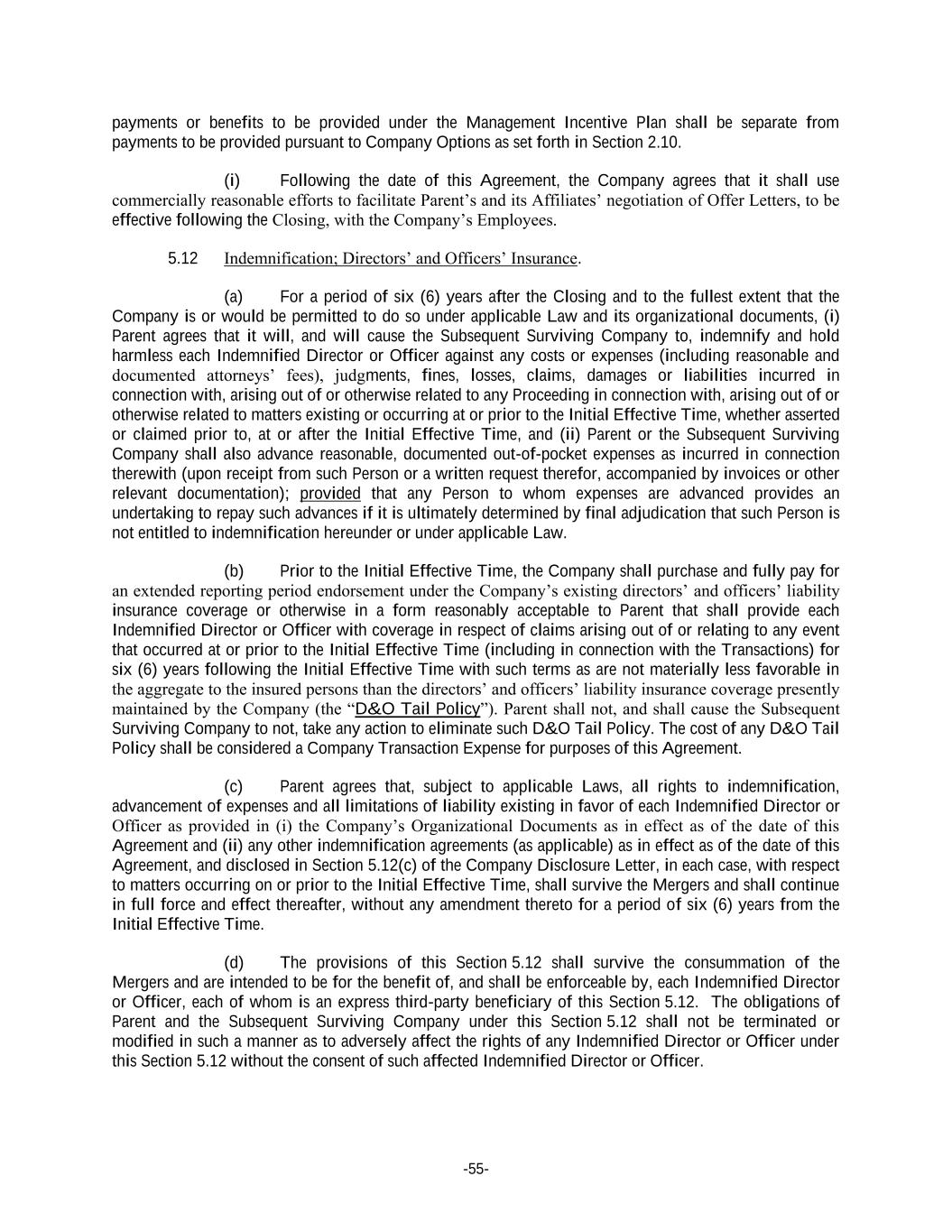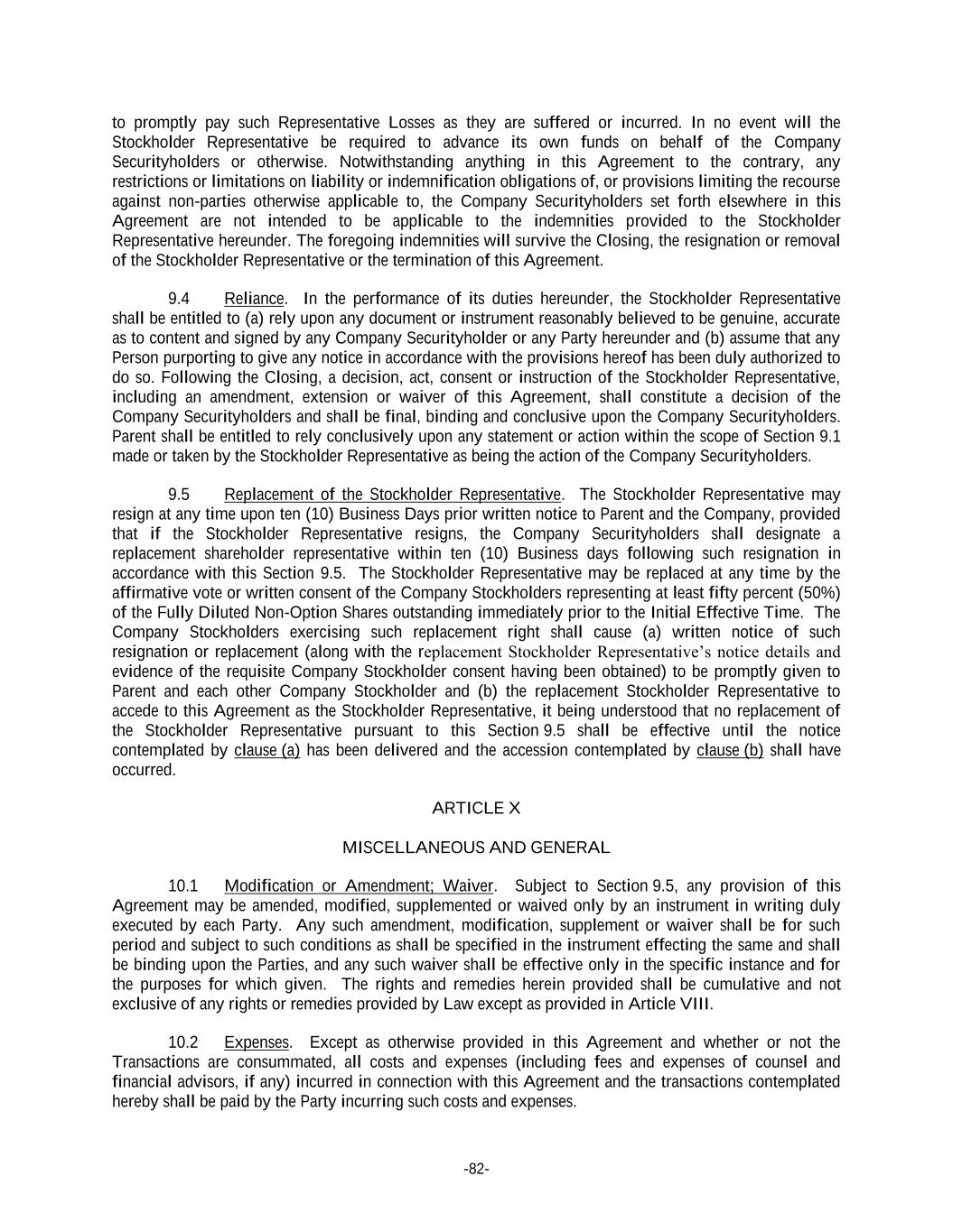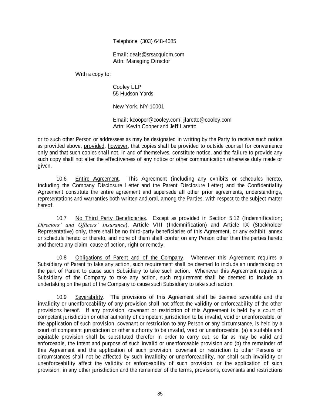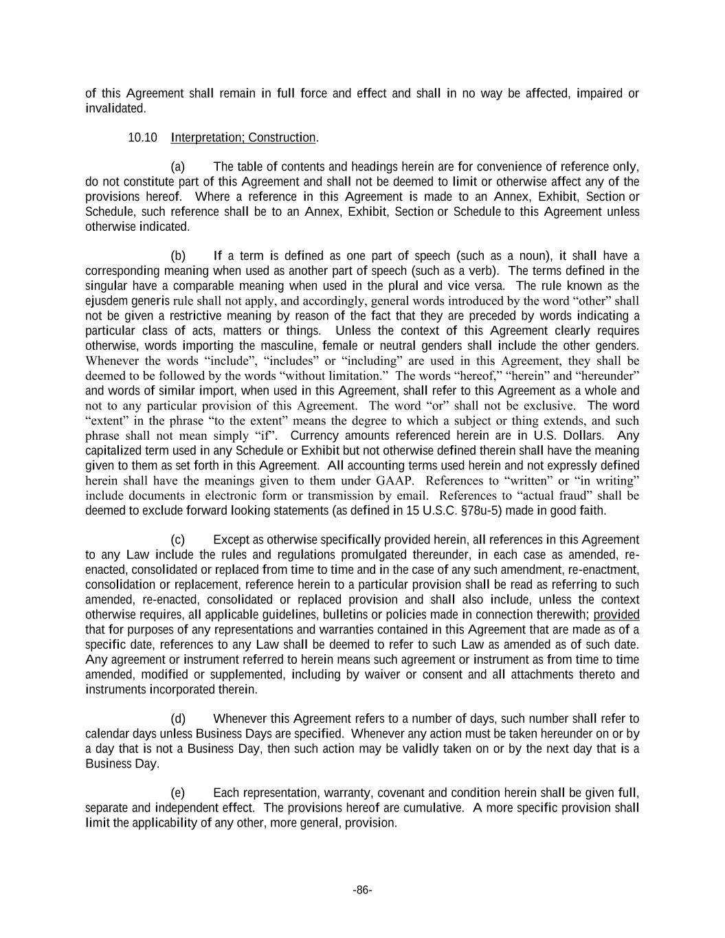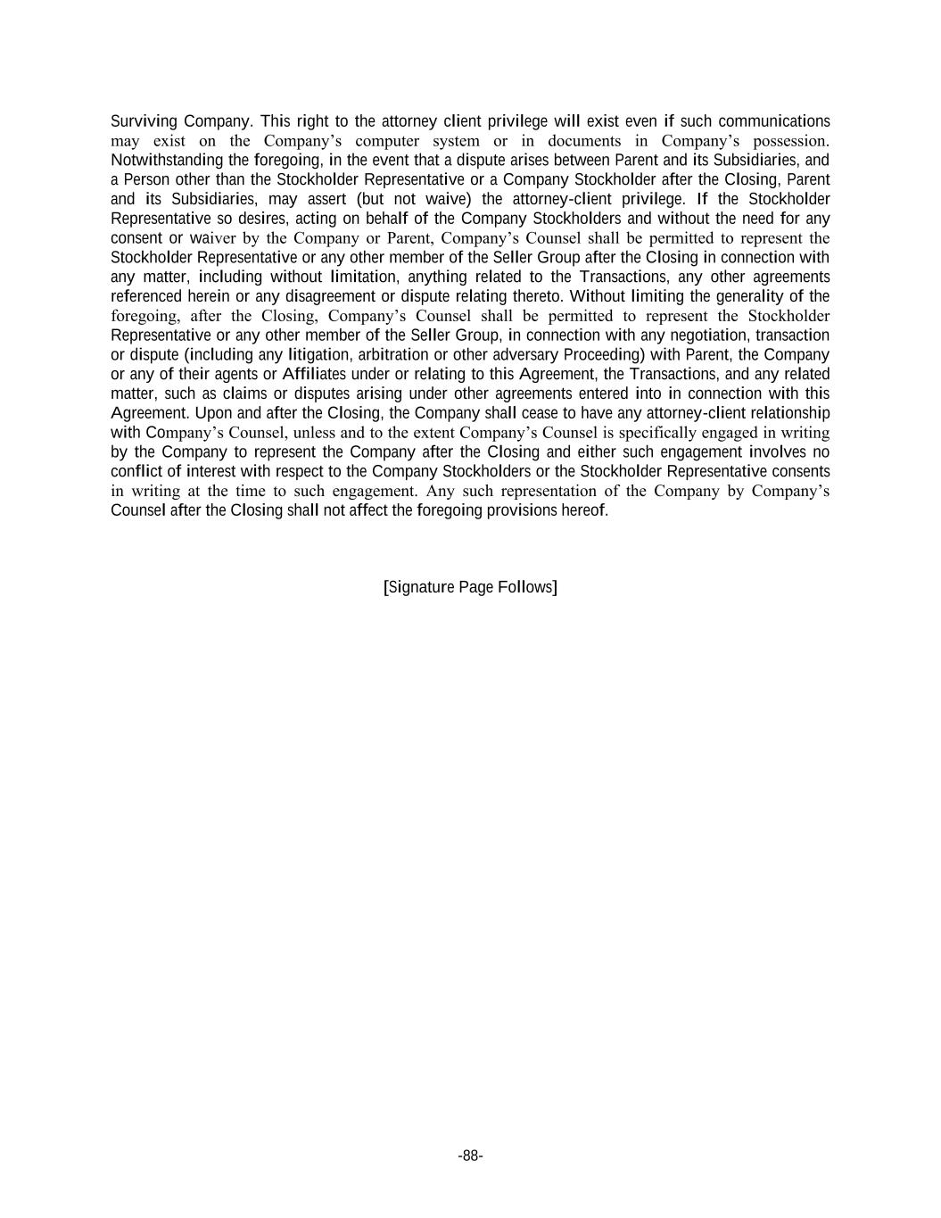 TABLE OF CONTENTS (continued) Page -v- 10.8 Obligations of Parent and of the Company ...................................................................... 85 10.9 Severability ...................................................................................................................... 85 10.10 Interpretation; Construction. ............................................................................................ 86 10.11 Successors and Assigns ................................................................................................... 87 10.12 Fulfillment of Obligations................................................................................................ 87 10.13 Waiver of Conflicts; Privilege ......................................................................................... 87