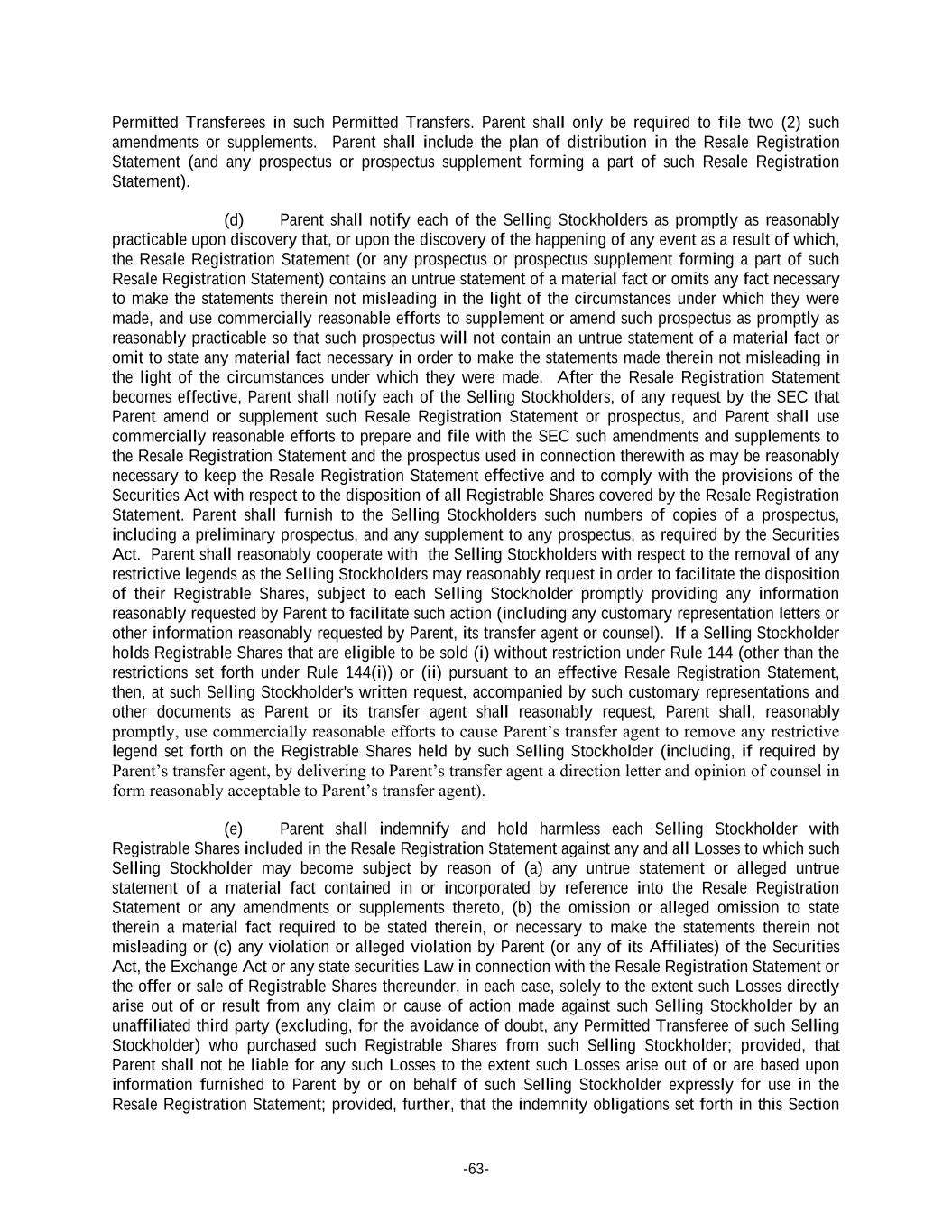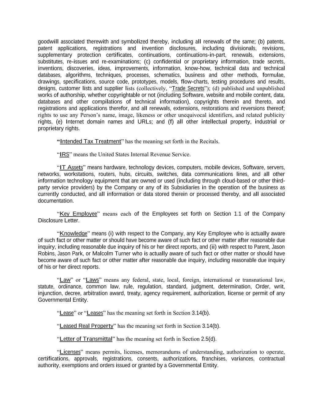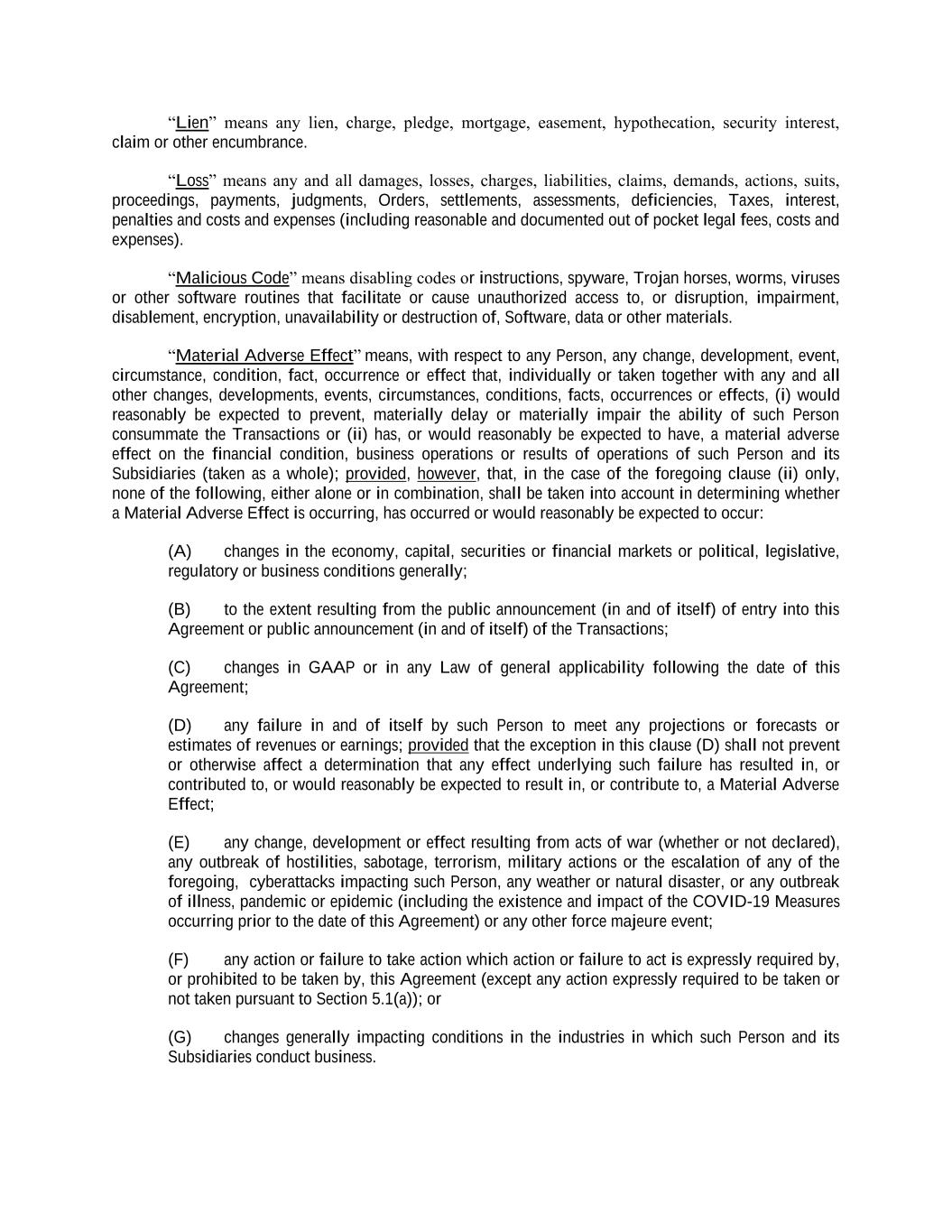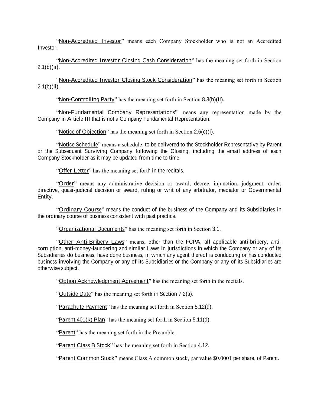 -5- ARTICLE II PURCHASE PRICE; EFFECT ON SHARES 2.1 Effect on Capital Stock and Merger Sub I. At the Initial Effective Time, as a result of the Initial Merger and without any action on the part of any of the Parties or any holder of Company Capital Stock: (a) Merger Sub I. Each share of common stock, par value $0.0001 per share, of Merger Sub I that is issued and outstanding immediately prior to the Initial Effective Time shall be converted into one share of common stock, par value $0.0001 per share, of the Initial Surviving Company. (b) Conversion of Company Capital Stock. (i) Each issued and outstanding share of Company Capital Stock held of record by an Accredited Investor (other than Excluded Shares, if any) shall be converted into and shall thereafter represent the right of the holder thereof to receive the following: (1) a number of shares of Parent Common Stock equal to the Per Share Portion multiplied by the Merger Stock Consideration, as adjusted pursuant to Section 2.1(b)(iv) (the “Accredited Investor Closing Stock Consideration”) and (2) an amount in cash equal to the Per Share Portion multiplied by the Estimated Merger Cash Consideration, as adjusted pursuant to Section 2.1(b)(iv) (the “Accredited Investor Closing Cash Consideration”) (clauses (1) and (2) collectively, the “Accredited Investor Company Capital Stock Closing Consideration”). (ii) Each issued and outstanding share of Company Capital Stock held of record by a Non-Accredited Investor (other than the Excluded Shares) shall be converted into and shall thereafter represent the right of the holder thereof to receive an amount in cash equal to the following: (1) the product of (A) the Per Share Portion, multiplied by (B) the Merger Stock Consideration, multiplied by (C) the Closing Parent Trading Price (the “Non-Accredited Investor Closing Stock Consideration”) and (2) an amount in cash equal to the Per Share Portion multiplied by the Estimated Merger Cash Consideration (the “Non-Accredited Investor Closing Cash Consideration”) (clauses (1) and (2) collectively, the “Non-Accredited Investor Company Capital Stock Closing Consideration” and together with the Accredited Investor Company Capital Stock Closing Consideration, the “Company Capital Stock Closing Consideration”, and the Company Capital Stock Closing Consideration to be paid in respect of each share of Company Capital Stock, as applicable the “Per Share Closing Consideration”). (iii) At the Initial Effective Time, all shares of Company Capital Stock issued and outstanding immediately prior to the Initial Effective Time shall no longer be outstanding and shall automatically be cancelled and retired and shall cease to exist, and each certificate (a “Certificate”) formerly representing any of the shares of Company Capital Stock (other than Excluded Shares) thereof shall cease to have any rights with respect thereto except the right to receive the Per Share Merger Consideration. (iv) To account for the fact that Non-Accredited Investors are not entitled to receive any Merger Stock Consideration hereunder: (1) the aggregate Accredited Investor Closing Cash Consideration shall be reduced by the aggregate amount of cash consideration included in the Non-Accredited Investor Closing Stock Consideration; and (2) the aggregate Accredited Investor Closing Stock Consideration shall be increased by the number of shares of Parent Common Stock