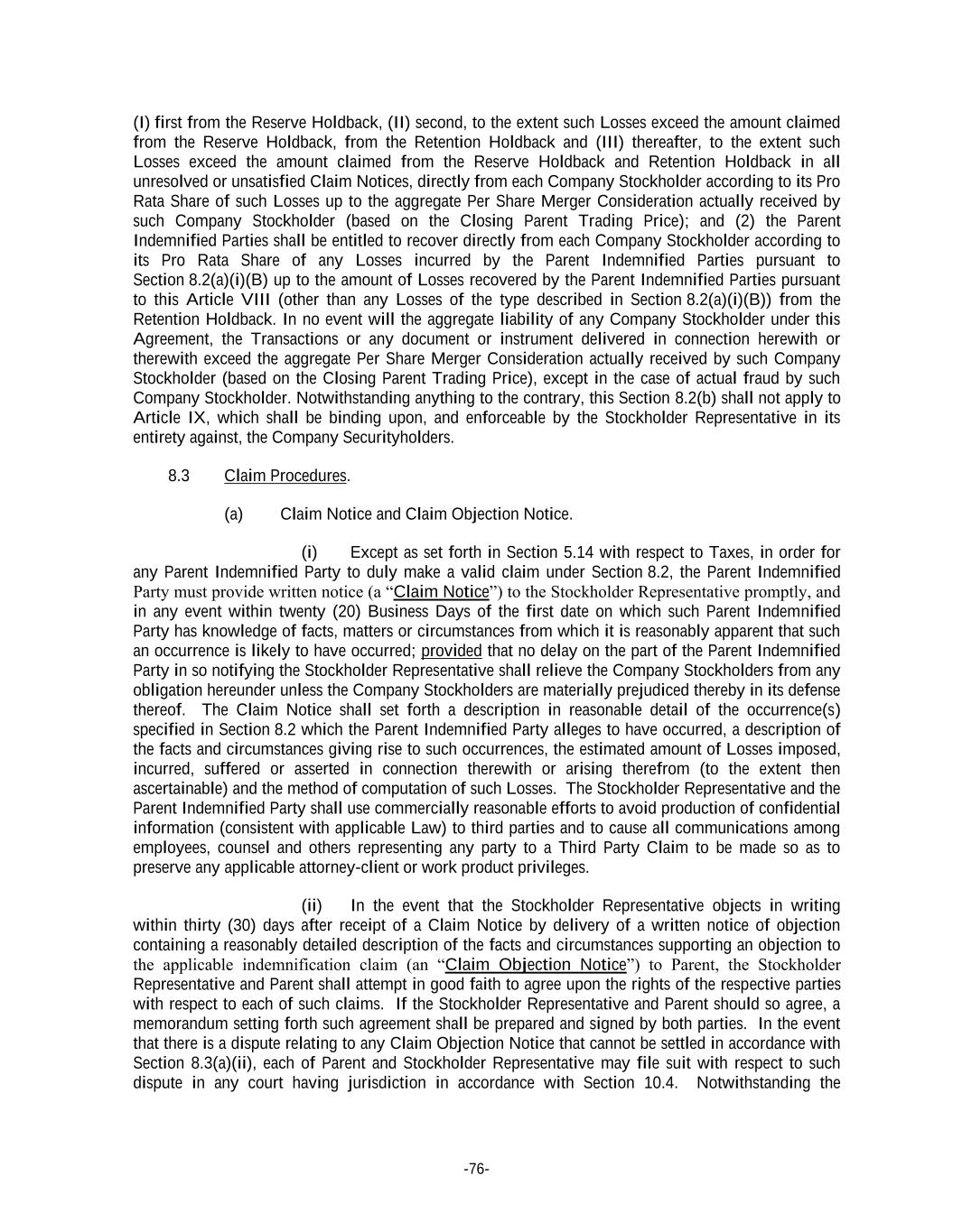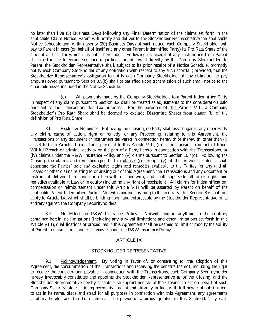-6- equal to (A) the aggregate Per Share Portion of the Fully Diluted Non-Option Shares held by Non- Accredited Investors, multiplied by (B) the Merger Stock Consideration. (c) Cancellation of Excluded Shares. Each Excluded Share shall cease to be outstanding, be cancelled without payment of any consideration therefor and shall cease to exist, subject to any rights the holder thereof may have under Section 2.1(d). (d) Appraisal Rights. Subject to the last sentence of this Section 2.1(d), no Dissenting Stockholder shall be entitled to receive the Per Share Merger Consideration with respect to the Dissenting Shares, and each Dissenting Stockholder shall be entitled to receive only the payment provided by Section 262 of the DGCL with respect to the Dissenting Shares owned by such Dissenting Stockholder and such Dissenting Stockholder shall cease to have any other rights with respect to such Dissenting Shares. The Company shall give Parent (i) prompt written notice and copies of any written demands for appraisal, actual, attempted or purported withdrawals of such demands, and any other instruments served pursuant to (or purportedly pursuant to) applicable Law that are received by the Company relating to the Company Stockholders’ demands of appraisal, and (ii) the opportunity to direct negotiations and Proceedings with respect to demands for appraisal, including any determination to make any payment or deposit with respect to any of the Dissenting Stockholders with respect to any of their Dissenting Shares under Section 262(h) of the DGCL prior to the entry of judgment in the Proceedings regarding appraisal; provided that, after the Closing, the Stockholder Representative, on behalf of the Company Securityholders, shall be entitled, at the Company Securityholders’ expense, to participate in all such negotiations and Proceedings, and Parent shall consider in good faith input from the Stockholder Representative. The Company shall not, except with the prior written consent of Parent (which shall not be unreasonably withheld, conditioned or delayed), and Parent shall not, except with the prior written consent of the Company (prior to the Closing) or the Stockholder Representative (from and after the Closing) (in each case which shall not be unreasonably withheld, conditioned or delayed) make any payment or deposit with respect to any demands for appraisal, offer to settle or settle any such demands or approve any withdrawal of any such demands or agree, authorize or commit to do any of the foregoing. If any Dissenting Stockholder shall have effectively withdrawn or otherwise waived or lost the right under Section 262 of the DGCL with respect to any Dissenting Shares, such Dissenting Shares shall thereupon be converted into the right to receive the Per Share Merger Consideration with respect to such Company Capital Stock pursuant to this Article II. (e) No Fractional Shares. Notwithstanding anything to the contrary contained in this Agreement, no fractional shares of Parent Common Stock shall be issued to the holders of Company Capital Stock in connection with the Initial Merger and any such fractional share interests shall not entitle the owner thereof to vote or to any other rights of a holder of shares of Parent Common Stock. Parent shall pay to each Company Stockholder that would otherwise have been entitled to receive a fraction of a share of Parent Common Stock (after aggregating all shares represented by the Certificates delivered by such holder), in lieu thereof and upon surrender thereof, an amount in cash (without interest) equal to the product obtained by multiplying (i) the fraction of a share of Parent Common Stock to which such holder would otherwise be entitled (after taking into account all shares of Company Capital Stock held by such holder immediately prior to the Initial Effective Time) by (ii) the Closing Parent Trading Price. All calculations pursuant to or in connection with this Agreement or the Payments Administrator Agreement involving the determination of shares of Parent Common Stock, including the calculation of Aggregate Stock Consideration and Per Share Closing Consideration shall be calculated to the nearest sixth decimal place. 2.2 Effect of Subsequent Merger on Initial Surviving Company. At the Subsequent Effective Time, as a result of the Subsequent Merger and without any action on the part of any of the Parties or any holder of stock of the Initial Surviving Company, each share of common stock, par value $0.0001 per