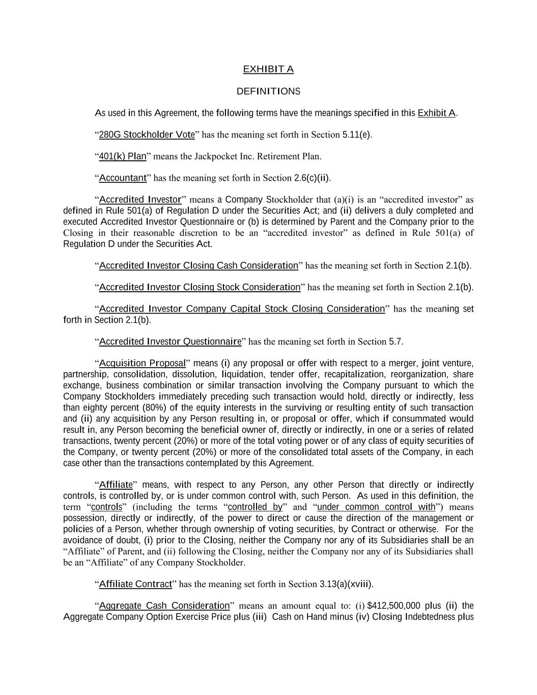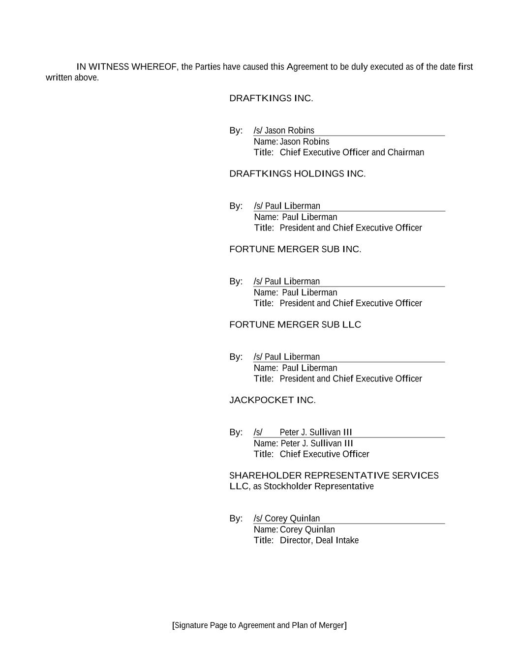 -1- AGREEMENT AND PLAN OF MERGER AND PLAN OF REORGANIZATION This AGREEMENT AND PLAN OF MERGER AND PLAN OF REORGANIZATION (as amended or restated from time to time, this “Agreement”), dated as of February 11, 2024, is entered into by and among DraftKings Inc., a Nevada corporation (“Parent”), DraftKings Holdings Inc., a Nevada corporation and a direct and wholly-owned subsidiary of Parent (“DK HoldCo”), Fortune Merger Sub Inc., a Delaware corporation and a direct and wholly-owned subsidiary of DK HoldCo (“Merger Sub I”), Fortune Merger Sub LLC, a Delaware limited liability company and a direct and wholly-owned subsidiary of DK HoldCo (“Merger Sub II”), JackPocket Inc., a Delaware corporation (the “Company”), and Shareholder Representative Services LLC, a Colorado limited liability company, solely in its capacity as representative, agent and attorney-in-fact of the Company Securityholders (the “Stockholder Representative”). All of the signatories to this Agreement are collectively referred to as the “Parties” and individually as a “Party.” RECITALS WHEREAS, the Parties intend that, on the terms and subject to the conditions set forth in this Agreement, Merger Sub I shall merge with and into the Company (the “Initial Merger”), with the Company surviving the Initial Merger as the surviving corporation (the “Initial Surviving Company”), pursuant to the provisions of the General Corporation Law of the State of Delaware (the “DGCL”); WHEREAS, the Parties intend that, on the terms and subject to the conditions set forth in this Agreement, promptly following the consummation of the Initial Merger, the Initial Surviving Company shall merge with and into Merger Sub II (the “Subsequent Merger”, together with the Initial Merger, the “Mergers”), with Merger Sub II surviving the Subsequent Merger as the surviving company (the “Subsequent Surviving Company”), pursuant to the provisions of the DGCL and the Delaware Limited Liability Company Act (the “DLLCA”); WHEREAS, the board of directors of the Company (the “Company Board”) has unanimously (a) approved and declared advisable this Agreement and the transactions contemplated by this Agreement (the “Transactions”), (b) determined that this Agreement and the Transactions are fair to, and in the best interests of, the Company and the holders of shares of the Company’s common stock, $0.00001 par value (“Common Stock”), Series Seed Preferred Stock, $0.00001 par value (“Seed Stock”), Series A Preferred Stock, $0.00001 par value (“Class A Stock”), Series B Preferred Stock, $0.00001 par value (“Class B Stock”), Series B-1 Preferred Stock, $0.00001 par value (“Class B-1 Stock”), Series C-1 Preferred Stock, $0.00001 par value (“Class C-1 Stock”), Series C-2 Preferred Stock, $0.00001 par value (“Class C-2 Stock”), Series C-3 Preferred Stock, $0.00001 par value (“Class C-3 Stock”, and together with the Class C-1 Stock and Class C-2 Stock, the “Class C Preferred Stock”), Series D-1 Preferred Stock, $0.00001 par value (“Class D-1 Stock”), Series D-2 Preferred Stock, $0.00001 par value (“Class D-2 Stock”) and Series D-3 Preferred Stock, $0.00001 par value (“Class D-3 Stock”, and together with the Common Stock, Seed Stock, Class A Stock, Class B Stock, Class B-1 Stock, Class C-1 Stock, Class C-2 Stock, Class C-3 Stock, Class D-1 Stock and Class D-2 Stock, the “Company Capital Stock”), (c) directed that this Agreement be submitted to the holders of Company Capital Stock (the “Company Stockholders”) for their adoption and (d) resolved to recommend that the Company Stockholders adopt this Agreement; WHEREAS, DK HoldCo, as the sole shareholder of Merger Sub I, has (a) determined that this Agreement and the Transactions are fair and advisable to, and in the commercial interests of, DK HoldCo and Merger Sub I, (b) approved and adopted this Agreement, and (c) authorized and approved the Transactions, including Merger Sub I’s execution and delivery of this Agreement;