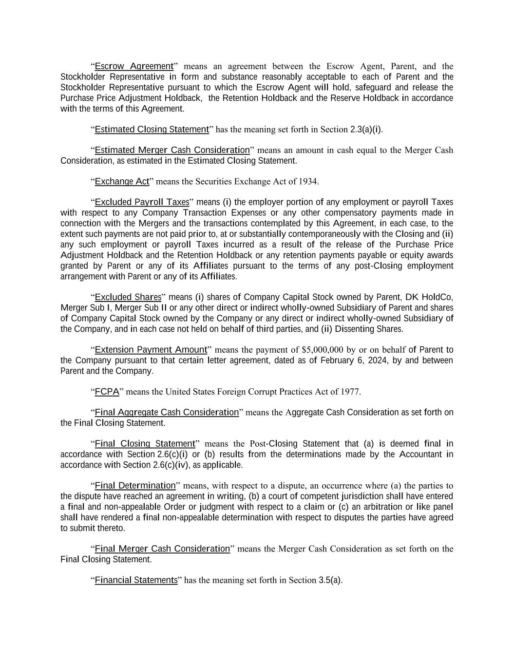 -8- Funds Flow Memorandum to reflect any such agreements, along with an updated officer’s certificate required by Section 2.3(a)(iii) not later than the Business Day immediately prior to the Closing Date. If Parent has validly provided notice of an objection to the Estimated Closing Statement and/or the Funds Flow Memorandum pursuant to this Section 2.3(a)(v) and Parent and the Company fail to mutually agree upon revisions to the Estimated Closing Statement and/or the Funds Flow Memorandum on or prior to the Business Day immediately prior to the Closing Date, then (A) neither Parent nor the Company shall delay the Closing because of such failure and (B) the amounts set forth in the Estimated Closing Statement, without any adjustment, shall be the amounts used in the determination of the Estimated Merger Cash Consideration. The agreement of the Parties to revisions to the Estimated Closing Statement and/or the Funds Flow Memorandum or the failure of the Parties to agree to such revisions shall not constitute a waiver or limitation of a Party’s rights and obligations pursuant to Section 2.7. 2.4 Purchase Price Holdbacks. (a) Purchase Price Adjustment Holdback. At the Initial Effective Time, Parent shall deposit, or cause to be deposited, $5,000,000 of the Aggregate Cash Consideration with Computershare Trust Company, N.A. (in such capacity, the “Escrow Agent”), which shall constitute a holdback used to satisfy, among other matters, amounts owed to Parent from the Company Securityholders pursuant to Section 2.7(a) (the “Purchase Price Adjustment Holdback”). Parent will pay, or cause to be paid, all fees, costs and expenses of the Escrow Agent. Upon joint written instructions from Parent and the Stockholder Representative (or otherwise in accordance with the procedures set forth in the Escrow Agreement), the Escrow Agent shall release the Purchase Price Adjustment Holdback in accordance with Section 2.7 and the Escrow Agreement to the Payments Administrator. The Payments Administrator shall distribute the portion of any Per Share Post-Closing Adjustment Amount that is distributable to the Company Securityholders in accordance with Section 2.7, the Payments Administrator Agreement and the Funds Flow Memorandum. Parent will pay, or cause to be paid, all fees, costs and expenses of the Payments Administrator will be paid by DK HoldCo. (b) Retention Holdback. At the Initial Effective Time, Parent shall deposit, or cause to be deposited, $1,875,000 (the “Retention Holdback Amount”) of the Aggregate Cash Consideration with the Escrow Agent, which shall constitute a holdback used to satisfy, among other matters, any indemnification amounts owed to Parent or any other Parent Indemnified Party from the Company Stockholders. Upon joint written instructions from Parent and the Stockholder Representative (or otherwise in accordance with the procedures set forth in the Escrow Agreement), an amount, if any, that is in excess of eighty percent (80%) of the initial aggregate Retention Holdback Amount shall be released by the Escrow Agent to the Payments Administrator within ten (10) Business Days following the date that is twelve (12) months after the Closing Date (the “First Release Date”), and the remainder of the Retention Holdback, if any, shall be released by the Escrow Agent to the Payments Administrator within ten (10) Business Days following the date that is eighteen (18) months after the Closing Date (the “Second Release Date” and each of the Second Release Date and First Release Date, a “Release Date”), in each case, for further distribution by the Payments Administrator to the Company Securityholders no later than ten (10) Business Days following the applicable Release Date; provided that such portion of the Retention Holdback Amount as may be necessary in the reasonable good faith of Parent to satisfy any unresolved or unsatisfied claims for Losses validly made under Article VIII before the applicable Release Date shall remain in the Retention Holdback and the applicable portion of the Retention Holdback Amount that is subject to any such claimed Losses shall not be so released until such the amount of such Losses are finally resolved and satisfied in accordance with Article VIII. The Payments Administrator shall distribute the portion of any Per Share Retention Holdback Consideration that is distributable to the Company Securityholders in accordance with the terms of this Agreement, the Payments Administrator Agreement and the Funds Flow Memorandum promptly after its release from the Retention Holdback.