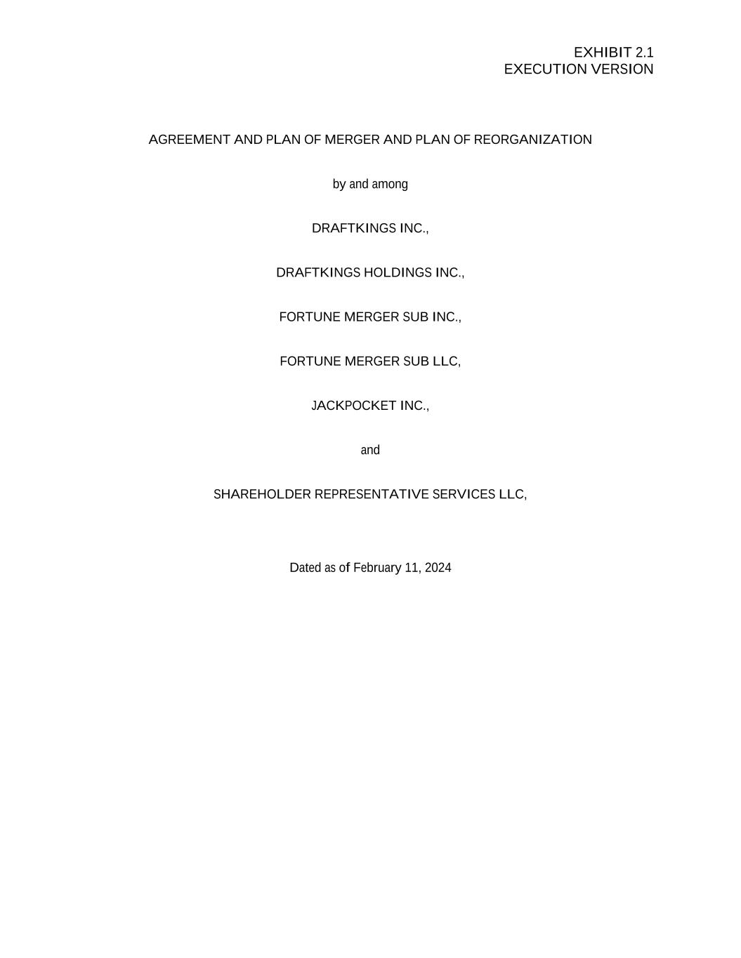 EXHIBIT 2.1 EXECUTION VERSION AGREEMENT AND PLAN OF MERGER AND PLAN OF REORGANIZATION by and among DRAFTKINGS INC., DRAFTKINGS HOLDINGS INC., FORTUNE MERGER SUB INC., FORTUNE MERGER SUB LLC, JACKPOCKET INC., and SHAREHOLDER REPRESENTATIVE SERVICES LLC, Dated as of February 11, 2024