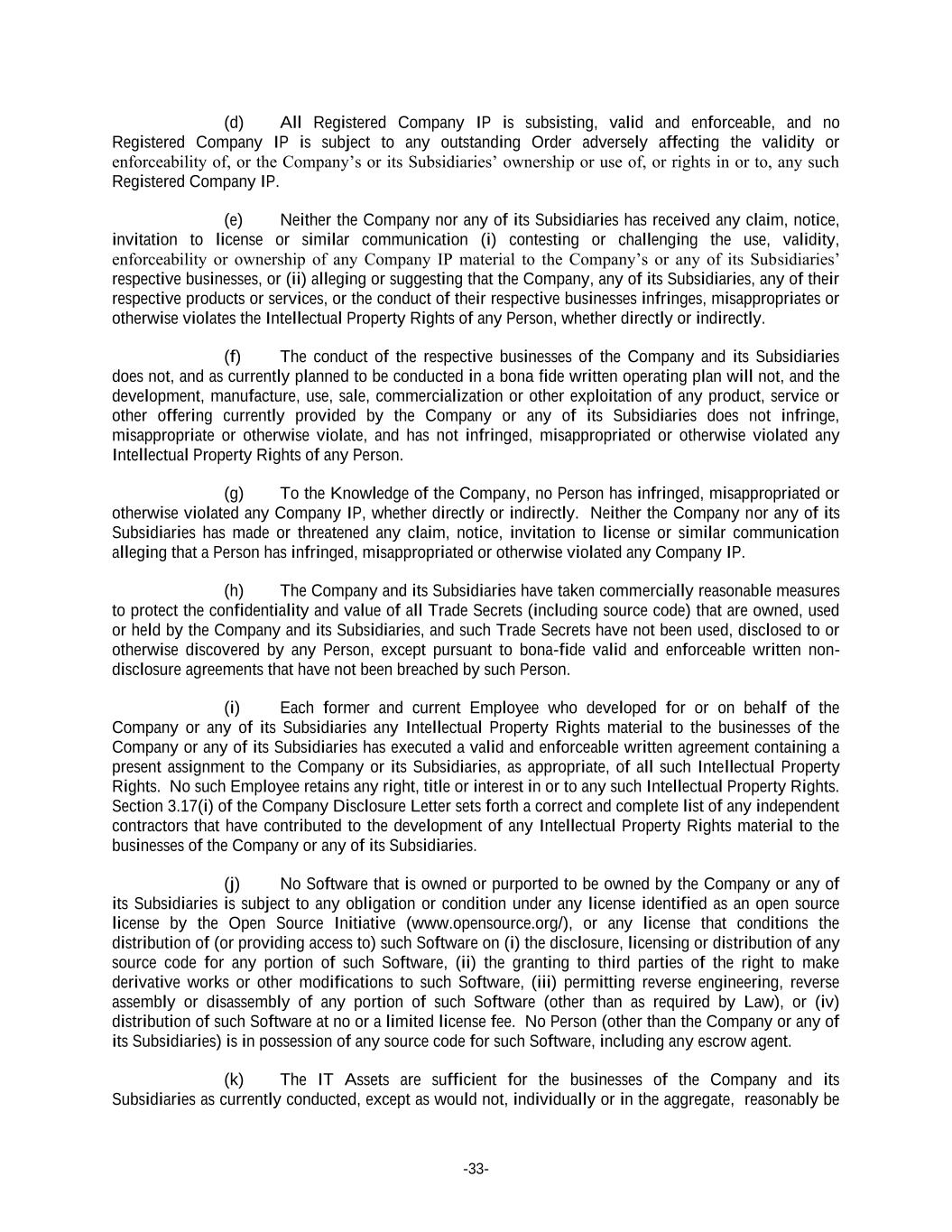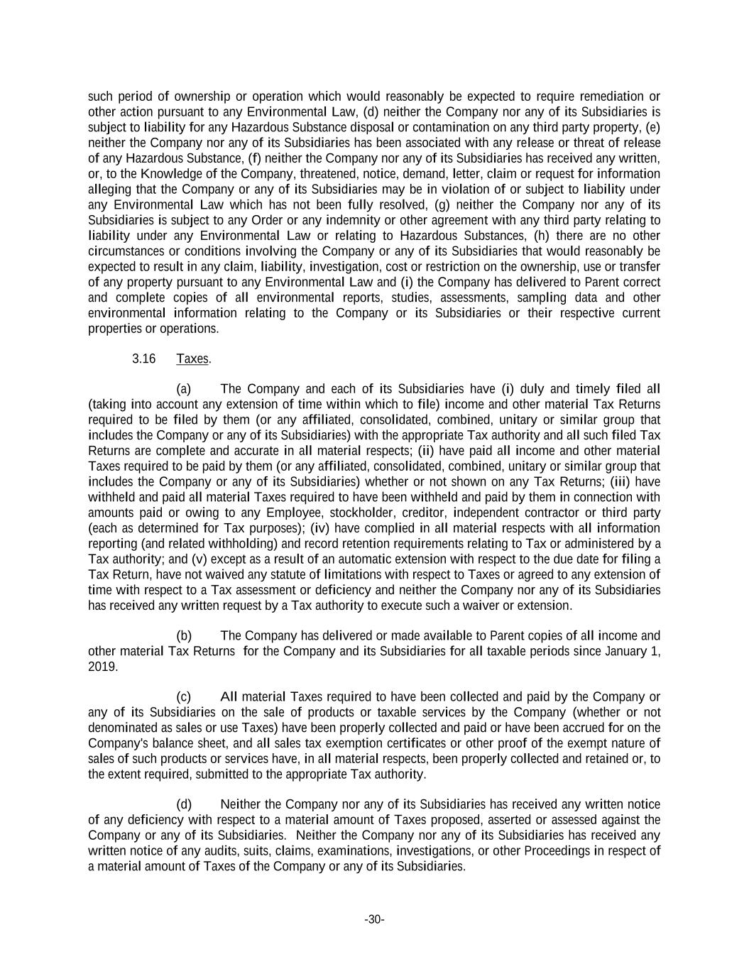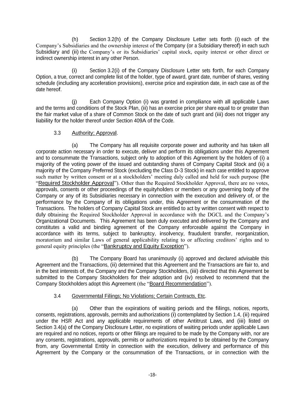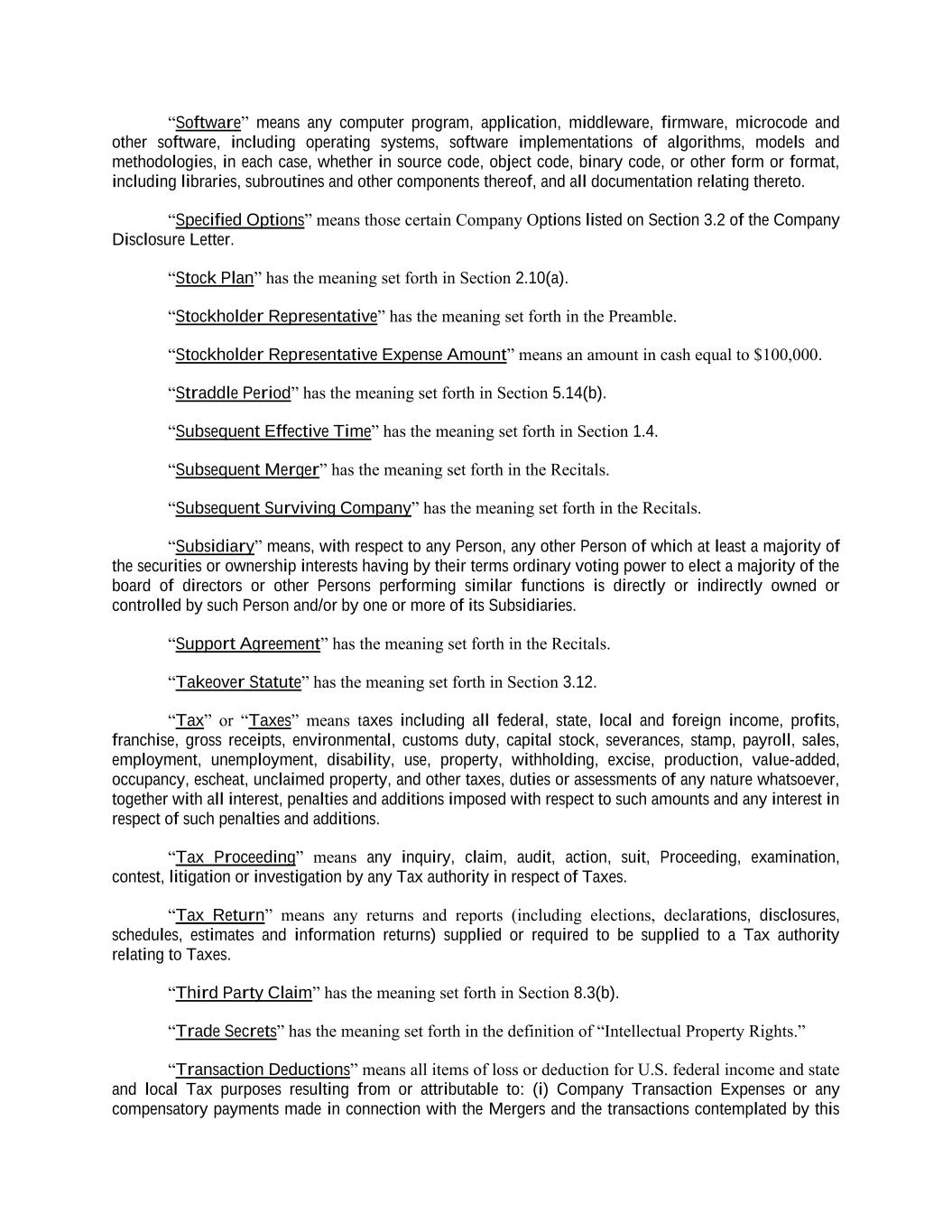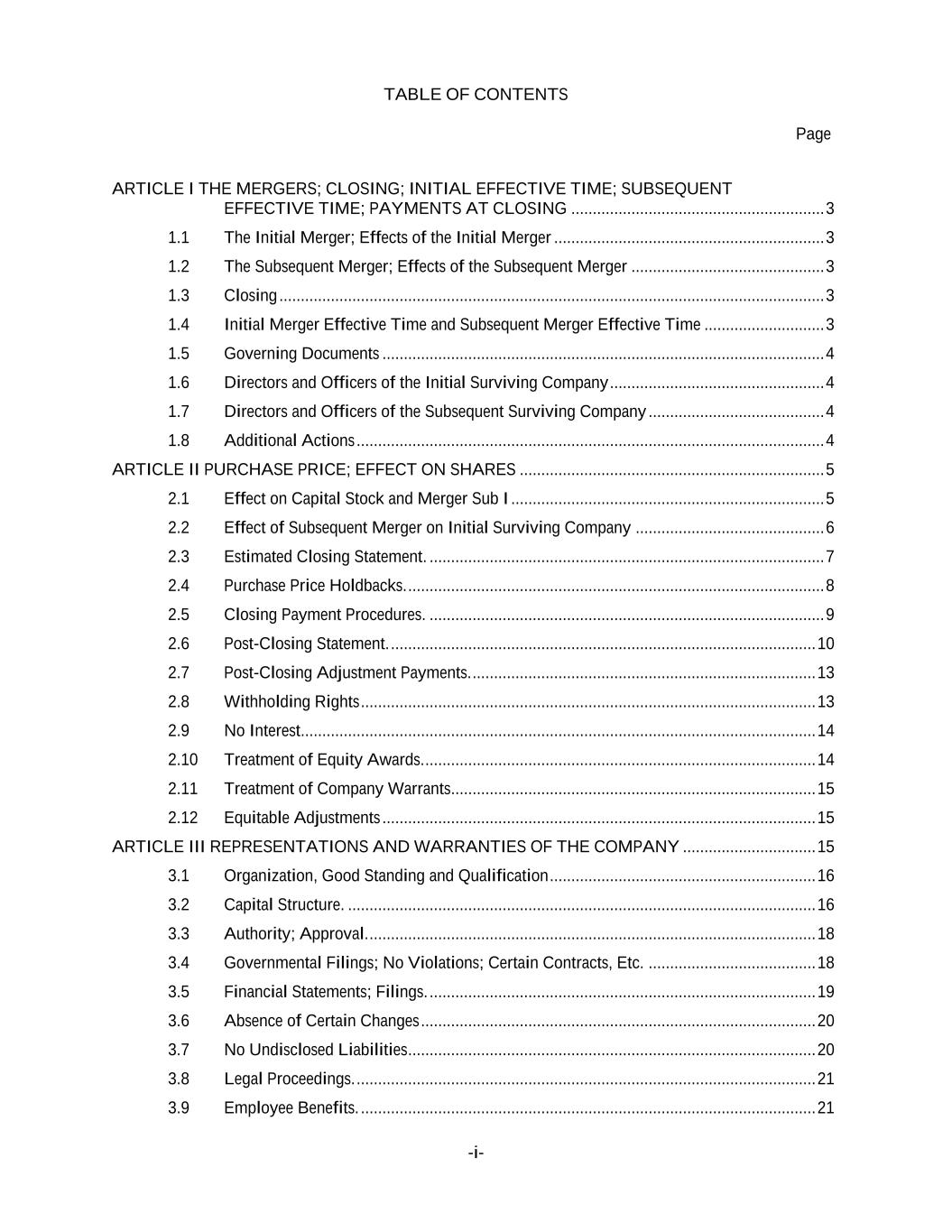 TABLE OF CONTENTS Page -i- ARTICLE I THE MERGERS; CLOSING; INITIAL EFFECTIVE TIME; SUBSEQUENT EFFECTIVE TIME; PAYMENTS AT CLOSING ........................................................... 3 1.1 The Initial Merger; Effects of the Initial Merger ............................................................... 3 1.2 The Subsequent Merger; Effects of the Subsequent Merger ............................................. 3 1.3 Closing ............................................................................................................................... 3 1.4 Initial Merger Effective Time and Subsequent Merger Effective Time ............................ 3 1.5 Governing Documents ....................................................................................................... 4 1.6 Directors and Officers of the Initial Surviving Company .................................................. 4 1.7 Directors and Officers of the Subsequent Surviving Company ......................................... 4 1.8 Additional Actions ............................................................................................................. 4 ARTICLE II PURCHASE PRICE; EFFECT ON SHARES ....................................................................... 5 2.1 Effect on Capital Stock and Merger Sub I ......................................................................... 5 2.2 Effect of Subsequent Merger on Initial Surviving Company ............................................ 6 2.3 Estimated Closing Statement. ............................................................................................ 7 2.4 Purchase Price Holdbacks. ................................................................................................. 8 2.5 Closing Payment Procedures. ............................................................................................ 9 2.6 Post-Closing Statement. ................................................................................................... 10 2.7 Post-Closing Adjustment Payments. ................................................................................ 13 2.8 Withholding Rights .......................................................................................................... 13 2.9 No Interest........................................................................................................................ 14 2.10 Treatment of Equity Awards. ........................................................................................... 14 2.11 Treatment of Company Warrants ..................................................................................... 15 2.12 Equitable Adjustments ..................................................................................................... 15 ARTICLE III REPRESENTATIONS AND WARRANTIES OF THE COMPANY ............................... 15 3.1 Organization, Good Standing and Qualification .............................................................. 16 3.2 Capital Structure. ............................................................................................................. 16 3.3 Authority; Approval. ........................................................................................................ 18 3.4 Governmental Filings; No Violations; Certain Contracts, Etc. ....................................... 18 3.5 Financial Statements; Filings. .......................................................................................... 19 3.6 Absence of Certain Changes ............................................................................................ 20 3.7 No Undisclosed Liabilities ............................................................................................... 20 3.8 Legal Proceedings. ........................................................................................................... 21 3.9 Employee Benefits. .......................................................................................................... 21