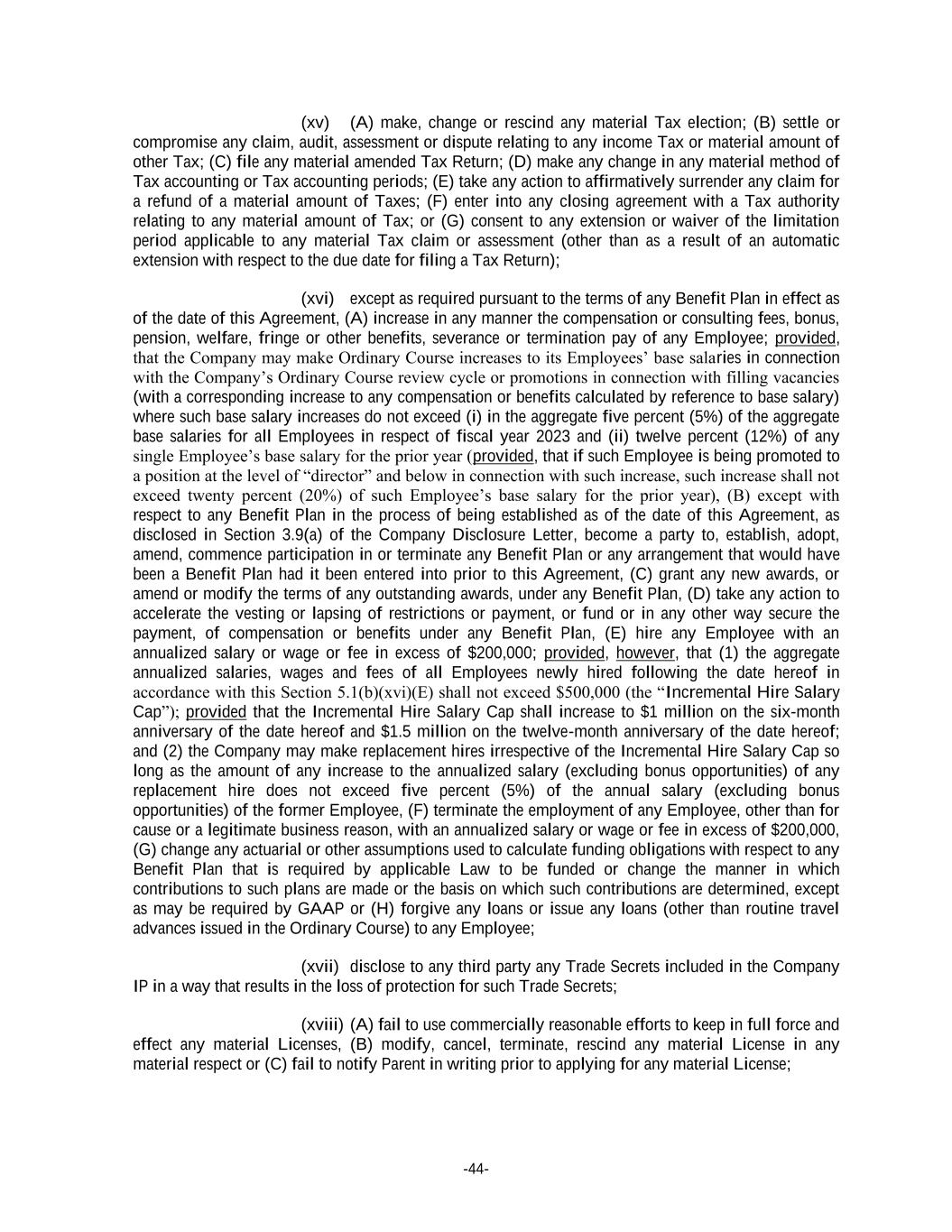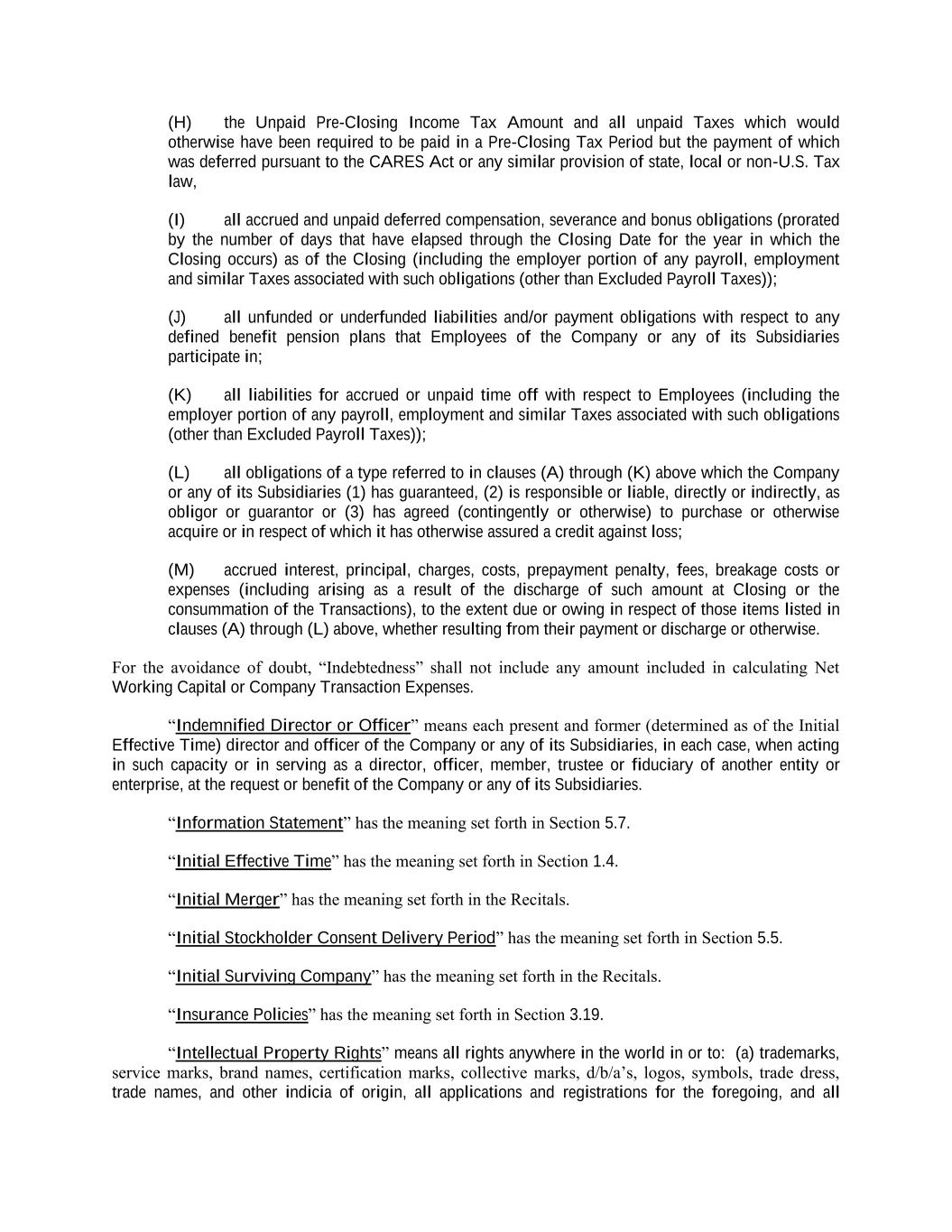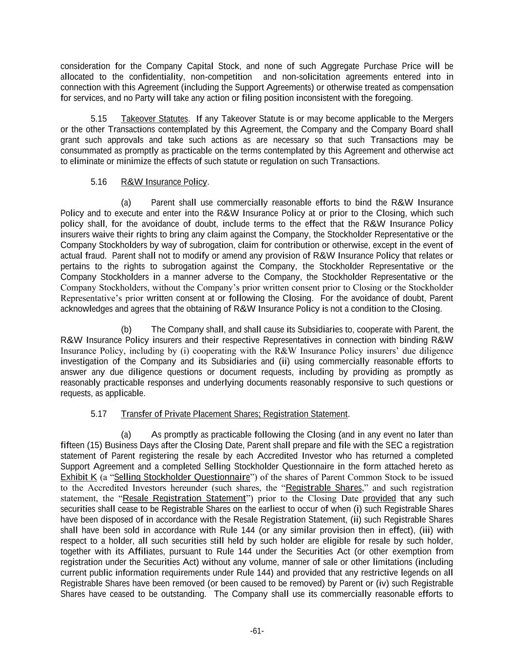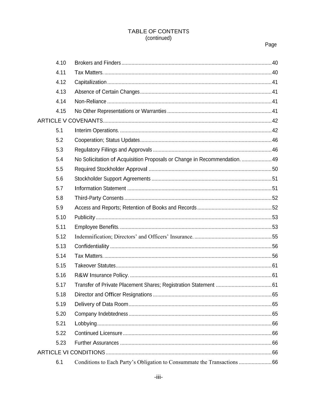 TABLE OF CONTENTS (continued) Page -iii- 4.10 Brokers and Finders ......................................................................................................... 40 4.11 Tax Matters. ..................................................................................................................... 40 4.12 Capitalization ................................................................................................................... 41 4.13 Absence of Certain Changes ............................................................................................ 41 4.14 Non-Reliance ................................................................................................................... 41 4.15 No Other Representations or Warranties ......................................................................... 41 ARTICLE V COVENANTS ...................................................................................................................... 42 5.1 Interim Operations. .......................................................................................................... 42 5.2 Cooperation; Status Updates ............................................................................................ 46 5.3 Regulatory Filings and Approvals ................................................................................... 46 5.4 No Solicitation of Acquisition Proposals or Change in Recommendation. ..................... 49 5.5 Required Stockholder Approval ...................................................................................... 50 5.6 Stockholder Support Agreements .................................................................................... 51 5.7 Information Statement ..................................................................................................... 51 5.8 Third-Party Consents ....................................................................................................... 52 5.9 Access and Reports; Retention of Books and Records .................................................... 52 5.10 Publicity ........................................................................................................................... 53 5.11 Employee Benefits. .......................................................................................................... 53 5.12 Indemnification; Directors’ and Officers’ Insurance. ...................................................... 55 5.13 Confidentiality ................................................................................................................. 56 5.14 Tax Matters. ..................................................................................................................... 56 5.15 Takeover Statutes ............................................................................................................. 61 5.16 R&W Insurance Policy. ................................................................................................... 61 5.17 Transfer of Private Placement Shares; Registration Statement ....................................... 61 5.18 Director and Officer Resignations ................................................................................... 65 5.19 Delivery of Data Room .................................................................................................... 65 5.20 Company Indebtedness .................................................................................................... 65 5.21 Lobbying .......................................................................................................................... 66 5.22 Continued Licensure ........................................................................................................ 66 5.23 Further Assurances .......................................................................................................... 66 ARTICLE VI CONDITIONS .................................................................................................................... 66 6.1 Conditions to Each Party’s Obligation to Consummate the Transactions ....................... 66
