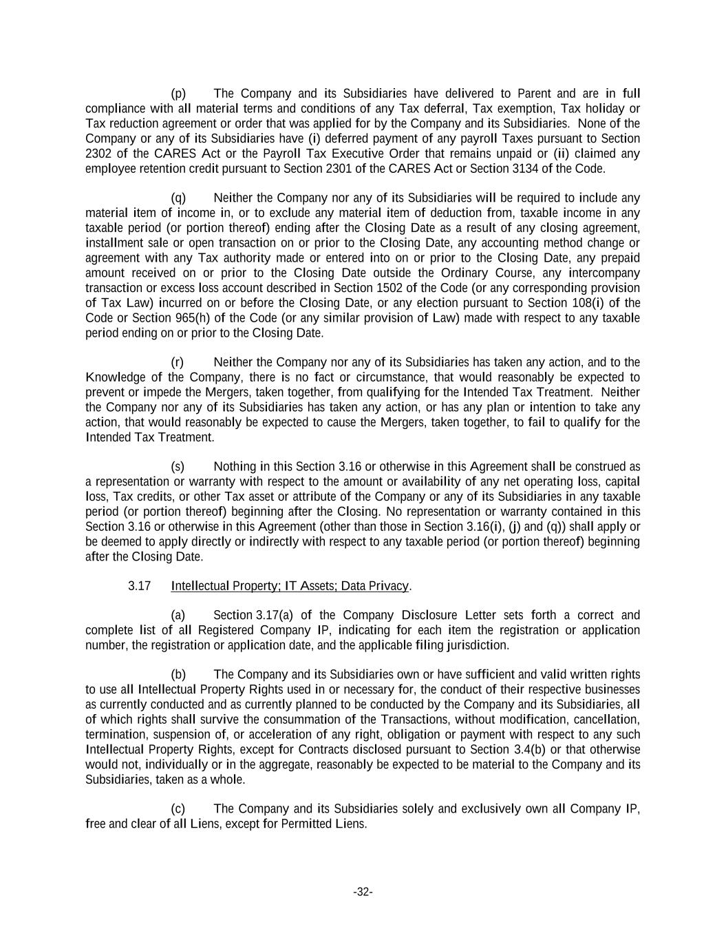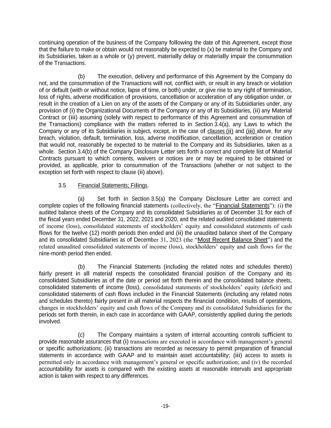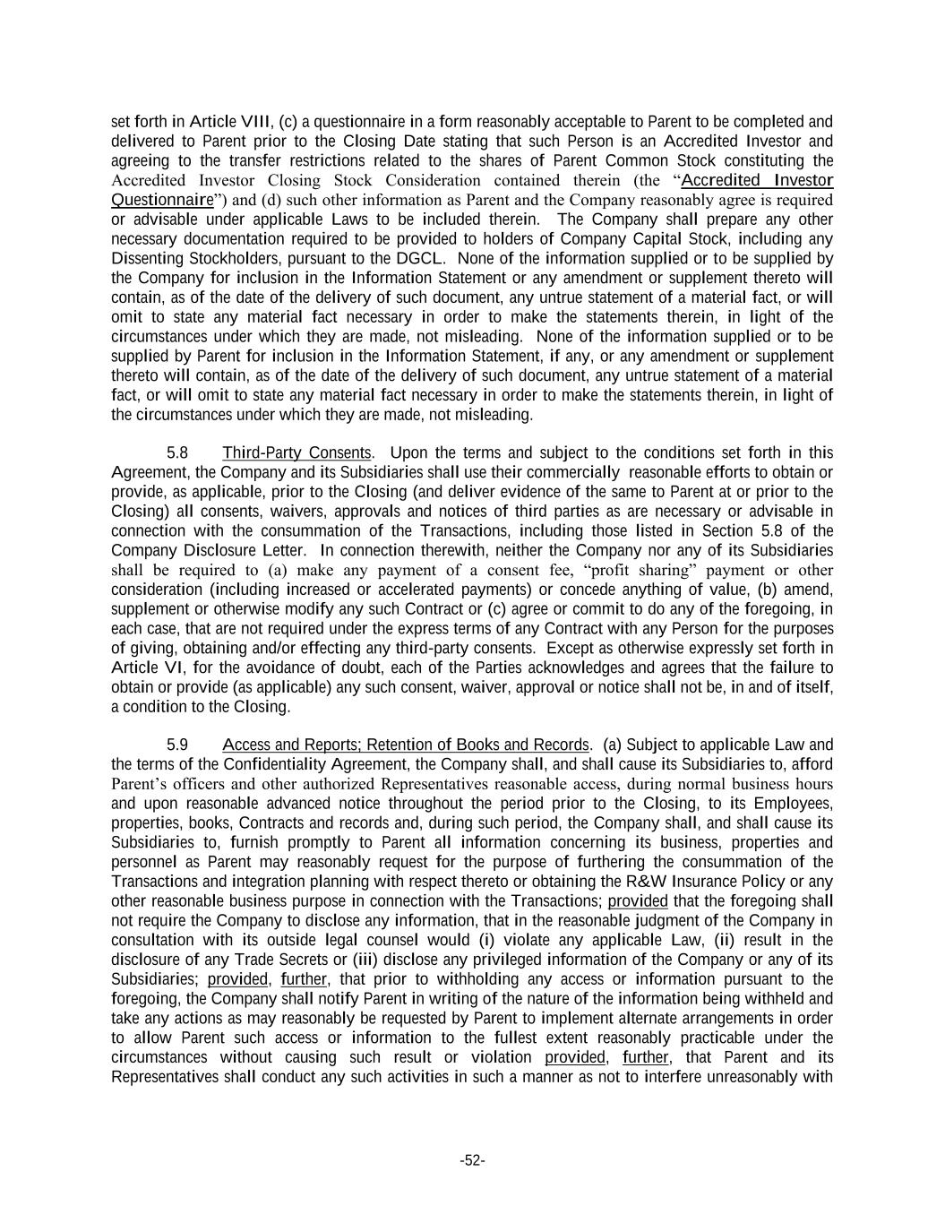 TABLE OF CONTENTS (continued) Page -iii- 4.10 Brokers and Finders ......................................................................................................... 40 4.11 Tax Matters. ..................................................................................................................... 40 4.12 Capitalization ................................................................................................................... 41 4.13 Absence of Certain Changes ............................................................................................ 41 4.14 Non-Reliance ................................................................................................................... 41 4.15 No Other Representations or Warranties ......................................................................... 41 ARTICLE V COVENANTS ...................................................................................................................... 42 5.1 Interim Operations. .......................................................................................................... 42 5.2 Cooperation; Status Updates ............................................................................................ 46 5.3 Regulatory Filings and Approvals ................................................................................... 46 5.4 No Solicitation of Acquisition Proposals or Change in Recommendation. ..................... 49 5.5 Required Stockholder Approval ...................................................................................... 50 5.6 Stockholder Support Agreements .................................................................................... 51 5.7 Information Statement ..................................................................................................... 51 5.8 Third-Party Consents ....................................................................................................... 52 5.9 Access and Reports; Retention of Books and Records .................................................... 52 5.10 Publicity ........................................................................................................................... 53 5.11 Employee Benefits. .......................................................................................................... 53 5.12 Indemnification; Directors’ and Officers’ Insurance. ...................................................... 55 5.13 Confidentiality ................................................................................................................. 56 5.14 Tax Matters. ..................................................................................................................... 56 5.15 Takeover Statutes ............................................................................................................. 61 5.16 R&W Insurance Policy. ................................................................................................... 61 5.17 Transfer of Private Placement Shares; Registration Statement ....................................... 61 5.18 Director and Officer Resignations ................................................................................... 65 5.19 Delivery of Data Room .................................................................................................... 65 5.20 Company Indebtedness .................................................................................................... 65 5.21 Lobbying .......................................................................................................................... 66 5.22 Continued Licensure ........................................................................................................ 66 5.23 Further Assurances .......................................................................................................... 66 ARTICLE VI CONDITIONS .................................................................................................................... 66 6.1 Conditions to Each Party’s Obligation to Consummate the Transactions ....................... 66