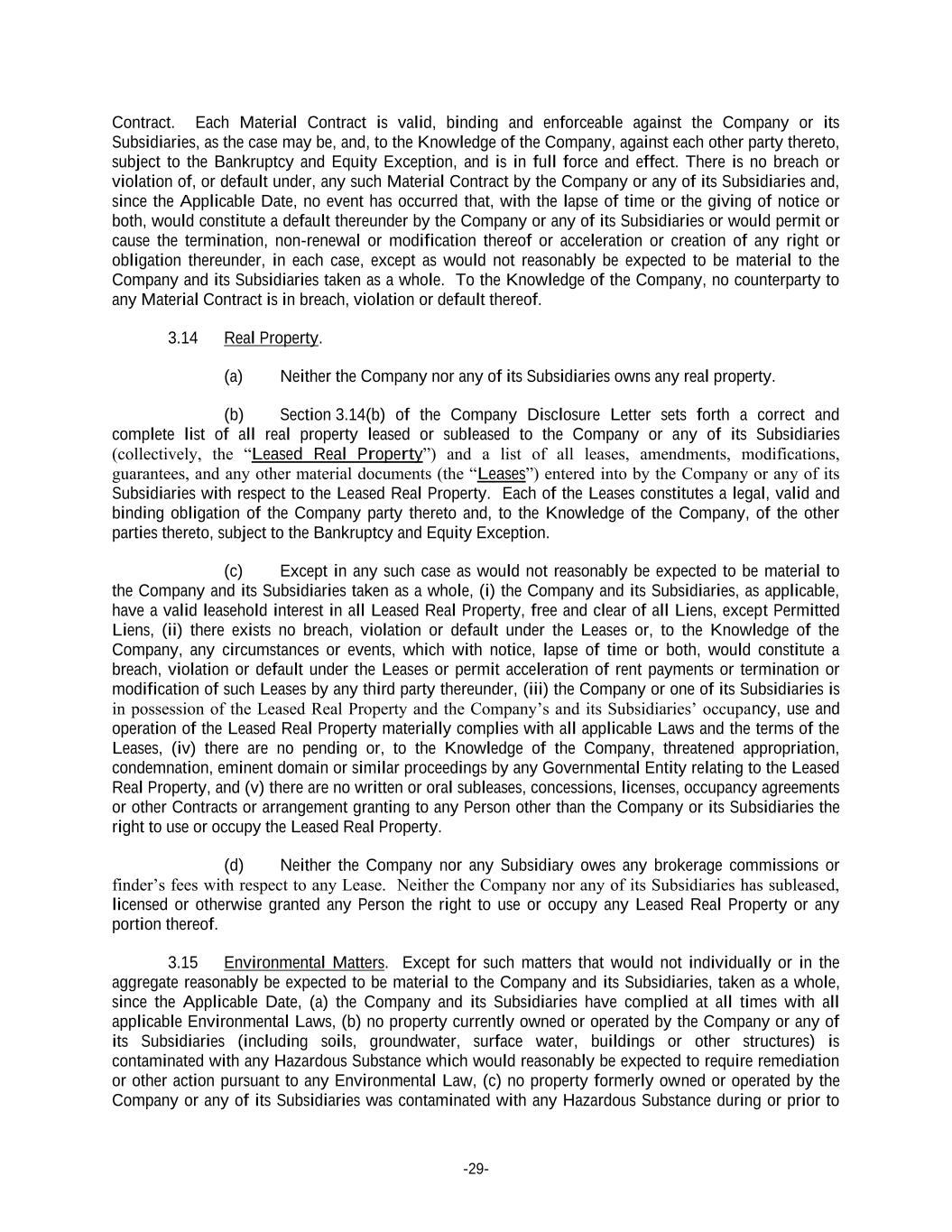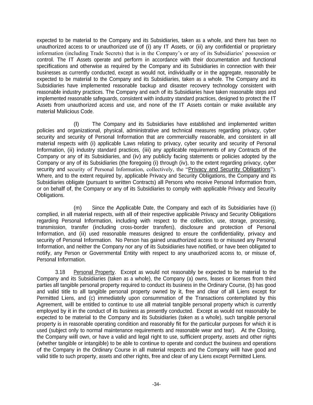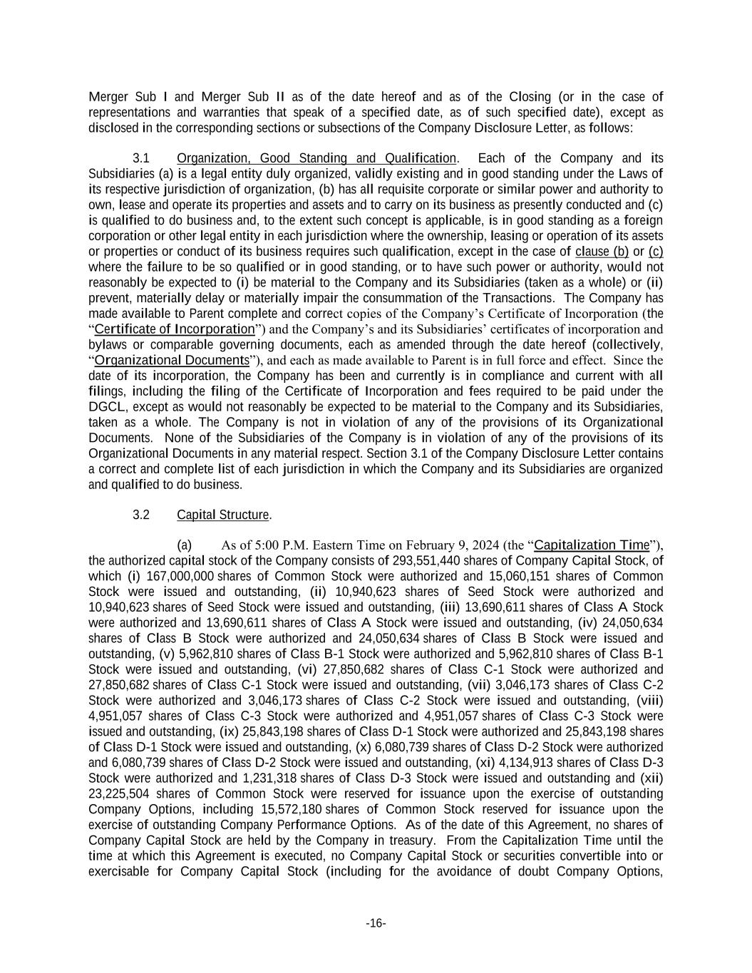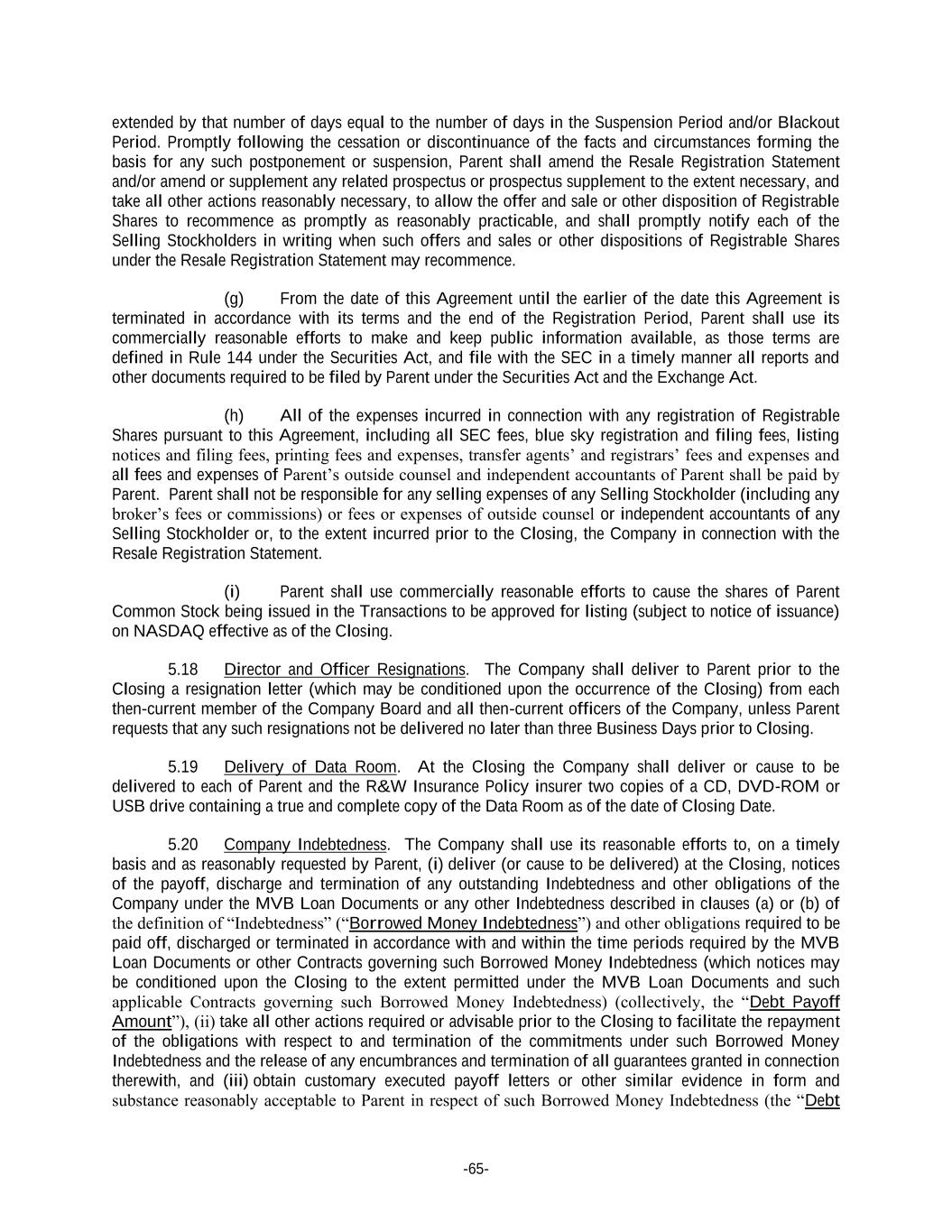 TABLE OF CONTENTS (continued) Page -iii- 4.10 Brokers and Finders ......................................................................................................... 40 4.11 Tax Matters. ..................................................................................................................... 40 4.12 Capitalization ................................................................................................................... 41 4.13 Absence of Certain Changes ............................................................................................ 41 4.14 Non-Reliance ................................................................................................................... 41 4.15 No Other Representations or Warranties ......................................................................... 41 ARTICLE V COVENANTS ...................................................................................................................... 42 5.1 Interim Operations. .......................................................................................................... 42 5.2 Cooperation; Status Updates ............................................................................................ 46 5.3 Regulatory Filings and Approvals ................................................................................... 46 5.4 No Solicitation of Acquisition Proposals or Change in Recommendation. ..................... 49 5.5 Required Stockholder Approval ...................................................................................... 50 5.6 Stockholder Support Agreements .................................................................................... 51 5.7 Information Statement ..................................................................................................... 51 5.8 Third-Party Consents ....................................................................................................... 52 5.9 Access and Reports; Retention of Books and Records .................................................... 52 5.10 Publicity ........................................................................................................................... 53 5.11 Employee Benefits. .......................................................................................................... 53 5.12 Indemnification; Directors’ and Officers’ Insurance. ...................................................... 55 5.13 Confidentiality ................................................................................................................. 56 5.14 Tax Matters. ..................................................................................................................... 56 5.15 Takeover Statutes ............................................................................................................. 61 5.16 R&W Insurance Policy. ................................................................................................... 61 5.17 Transfer of Private Placement Shares; Registration Statement ....................................... 61 5.18 Director and Officer Resignations ................................................................................... 65 5.19 Delivery of Data Room .................................................................................................... 65 5.20 Company Indebtedness .................................................................................................... 65 5.21 Lobbying .......................................................................................................................... 66 5.22 Continued Licensure ........................................................................................................ 66 5.23 Further Assurances .......................................................................................................... 66 ARTICLE VI CONDITIONS .................................................................................................................... 66 6.1 Conditions to Each Party’s Obligation to Consummate the Transactions ....................... 66