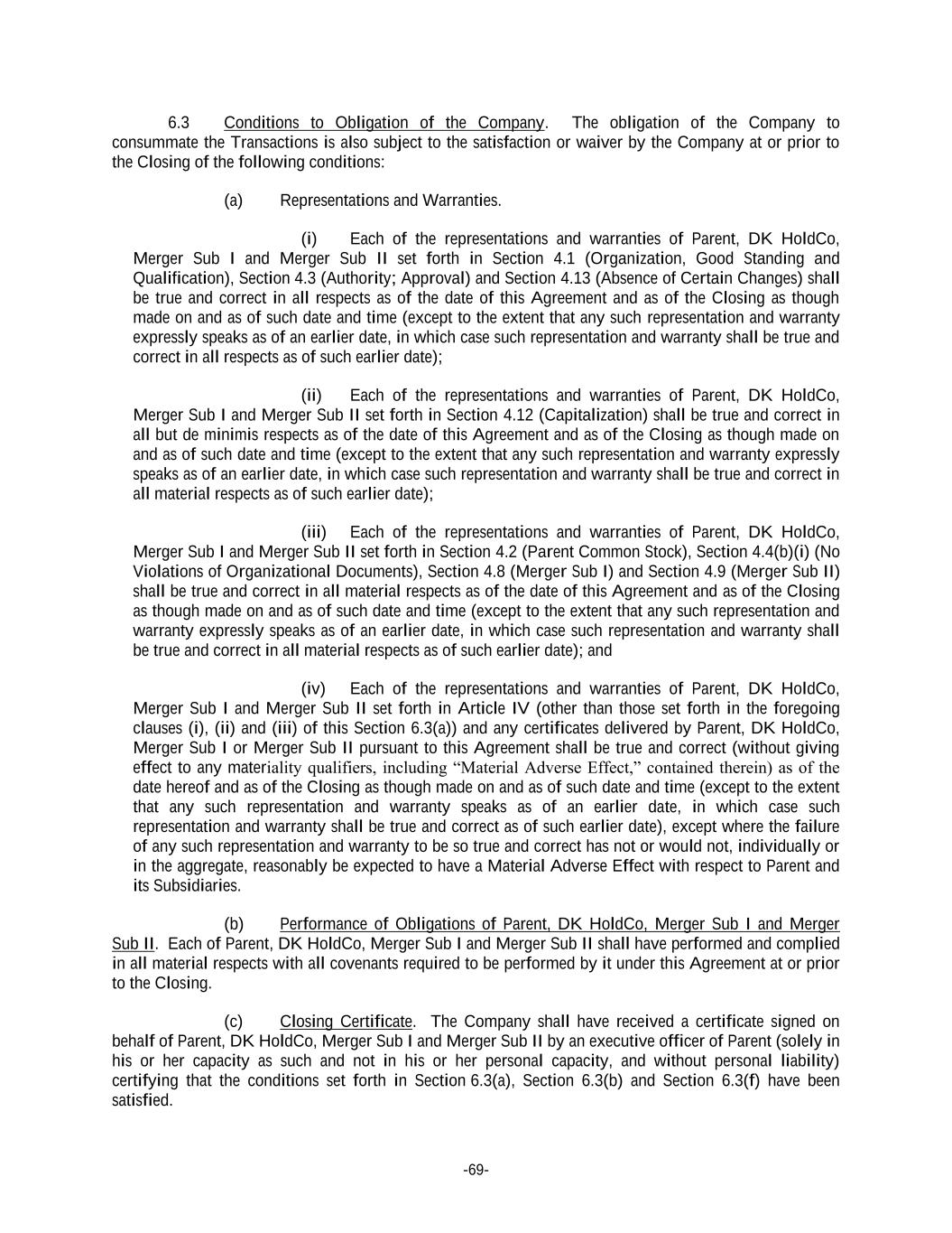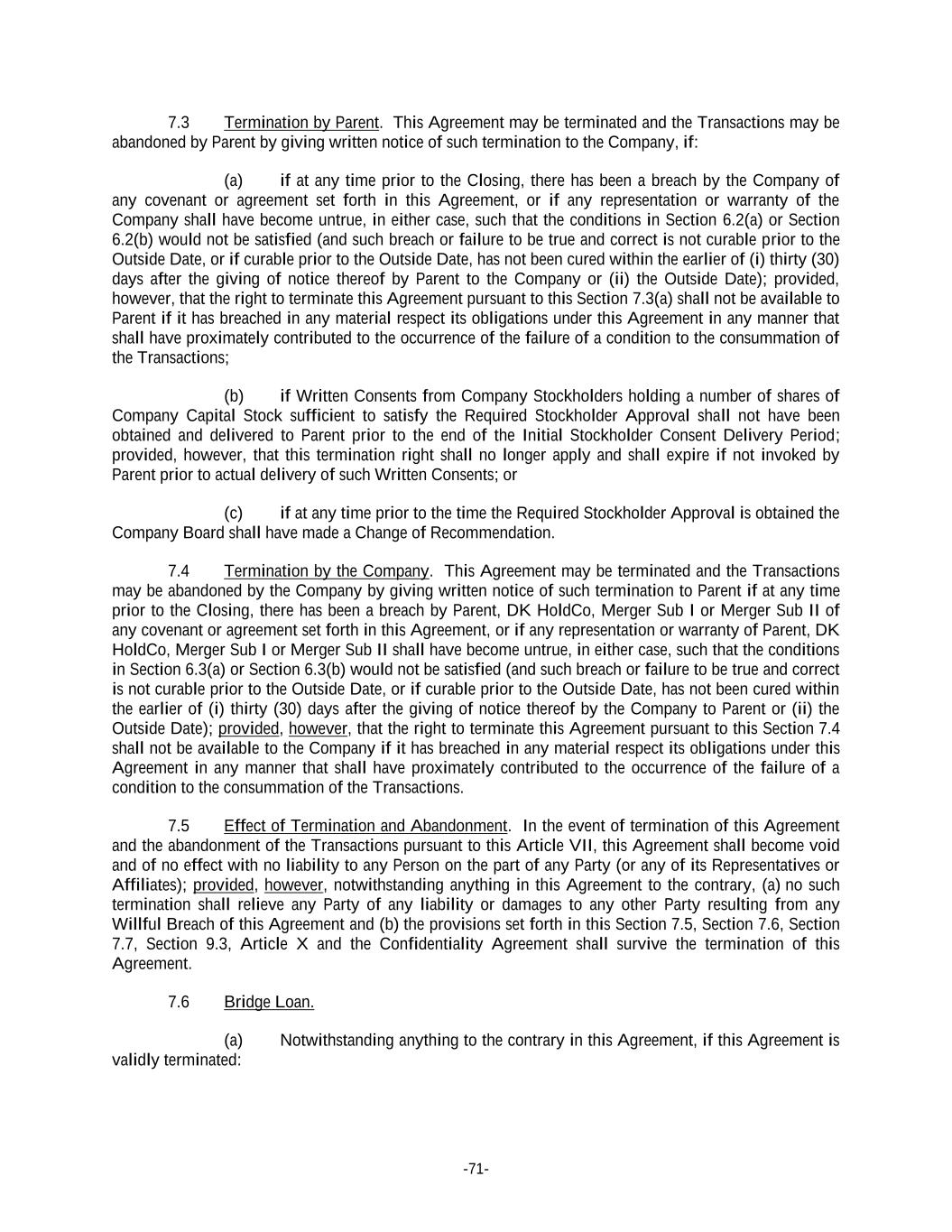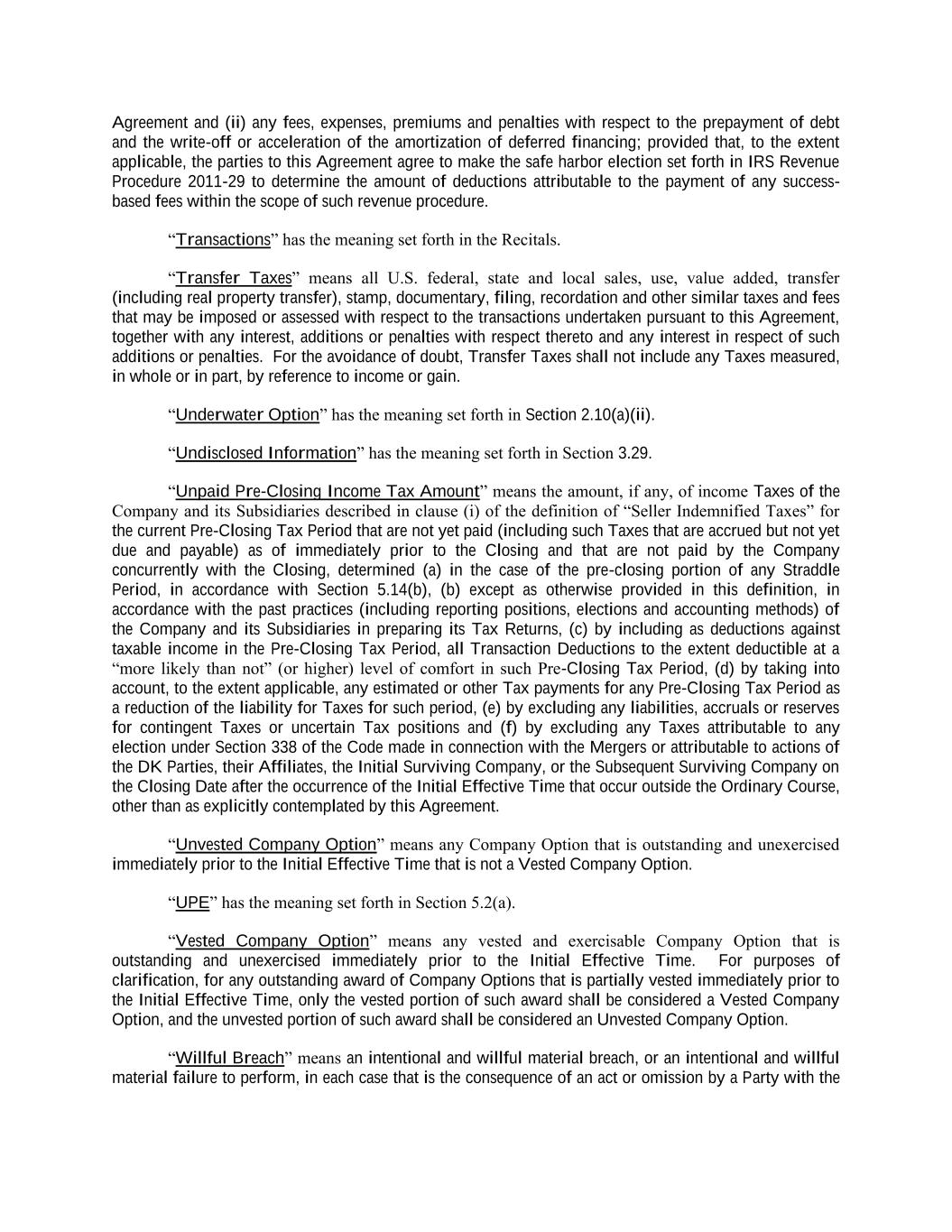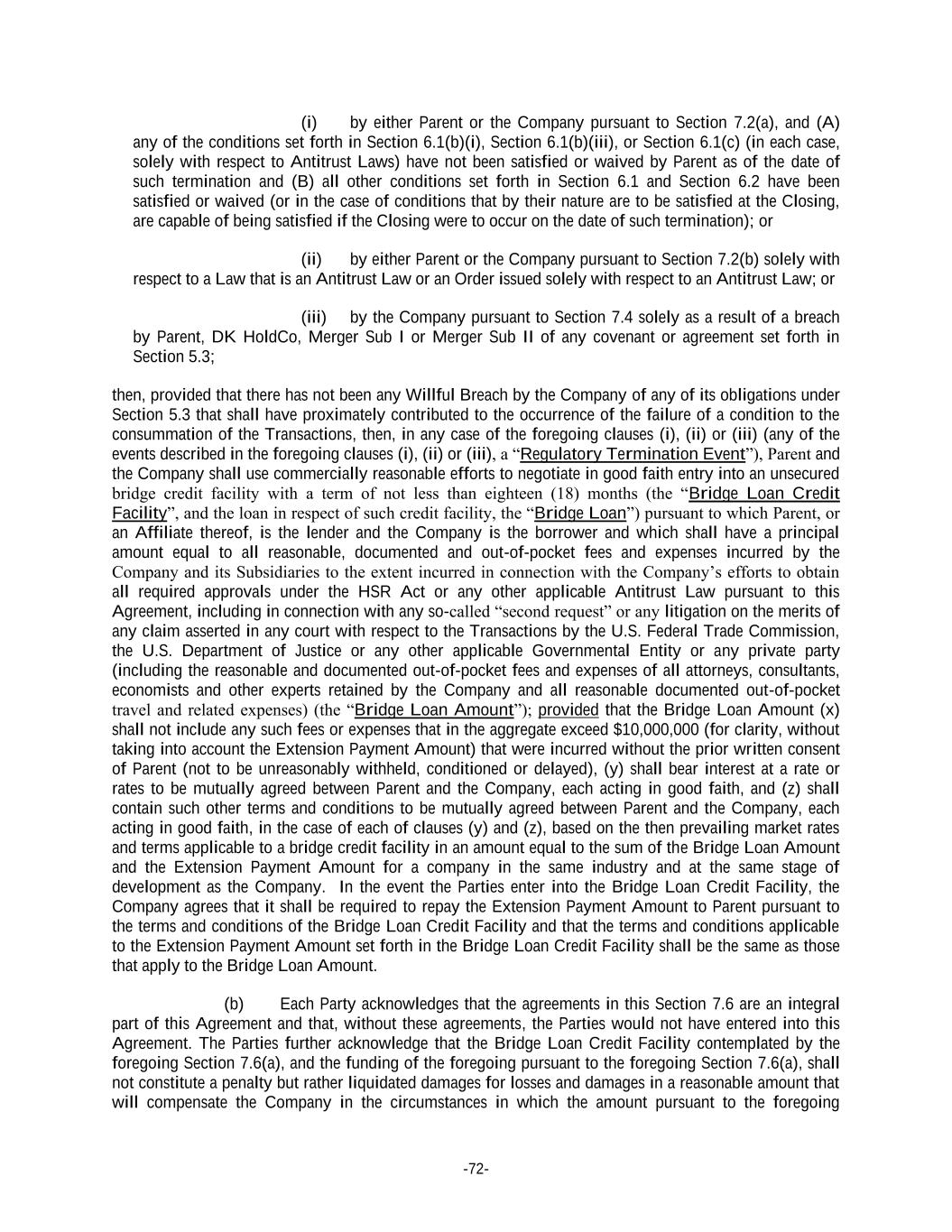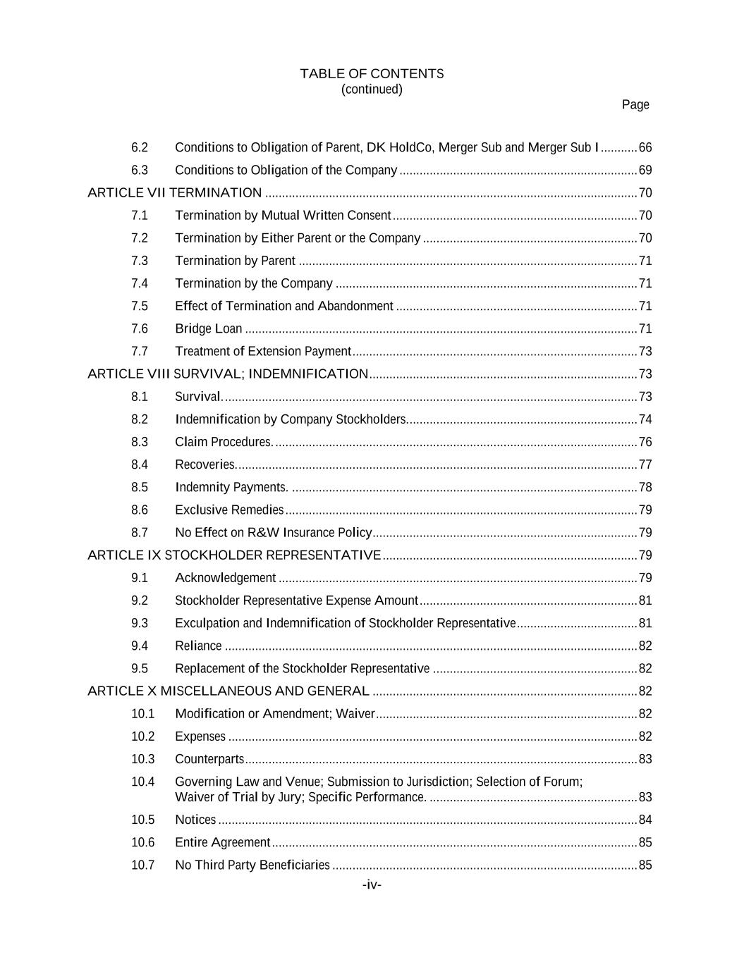 TABLE OF CONTENTS (continued) Page -iv- 6.2 Conditions to Obligation of Parent, DK HoldCo, Merger Sub and Merger Sub I ........... 66 6.3 Conditions to Obligation of the Company ....................................................................... 69 ARTICLE VII TERMINATION ............................................................................................................... 70 7.1 Termination by Mutual Written Consent ......................................................................... 70 7.2 Termination by Either Parent or the Company ................................................................ 70 7.3 Termination by Parent ..................................................................................................... 71 7.4 Termination by the Company .......................................................................................... 71 7.5 Effect of Termination and Abandonment ........................................................................ 71 7.6 Bridge Loan ..................................................................................................................... 71 7.7 Treatment of Extension Payment ..................................................................................... 73 ARTICLE VIII SURVIVAL; INDEMNIFICATION ................................................................................ 73 8.1 Survival. ........................................................................................................................... 73 8.2 Indemnification by Company Stockholders. .................................................................... 74 8.3 Claim Procedures. ............................................................................................................ 76 8.4 Recoveries. ....................................................................................................................... 77 8.5 Indemnity Payments. ....................................................................................................... 78 8.6 Exclusive Remedies ......................................................................................................... 79 8.7 No Effect on R&W Insurance Policy ............................................................................... 79 ARTICLE IX STOCKHOLDER REPRESENTATIVE ............................................................................ 79 9.1 Acknowledgement ........................................................................................................... 79 9.2 Stockholder Representative Expense Amount ................................................................. 81 9.3 Exculpation and Indemnification of Stockholder Representative .................................... 81 9.4 Reliance ........................................................................................................................... 82 9.5 Replacement of the Stockholder Representative ............................................................. 82 ARTICLE X MISCELLANEOUS AND GENERAL ............................................................................... 82 10.1 Modification or Amendment; Waiver .............................................................................. 82 10.2 Expenses .......................................................................................................................... 82 10.3 Counterparts ..................................................................................................................... 83 10.4 Governing Law and Venue; Submission to Jurisdiction; Selection of Forum; Waiver of Trial by Jury; Specific Performance. .............................................................. 83 10.5 Notices ............................................................................................................................. 84 10.6 Entire Agreement ............................................................................................................. 85 10.7 No Third Party Beneficiaries ........................................................................................... 85