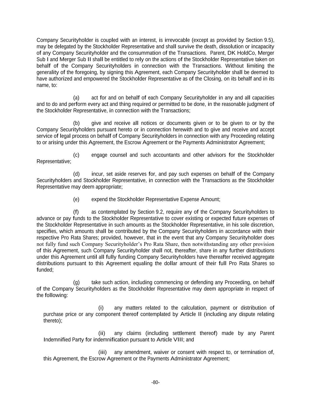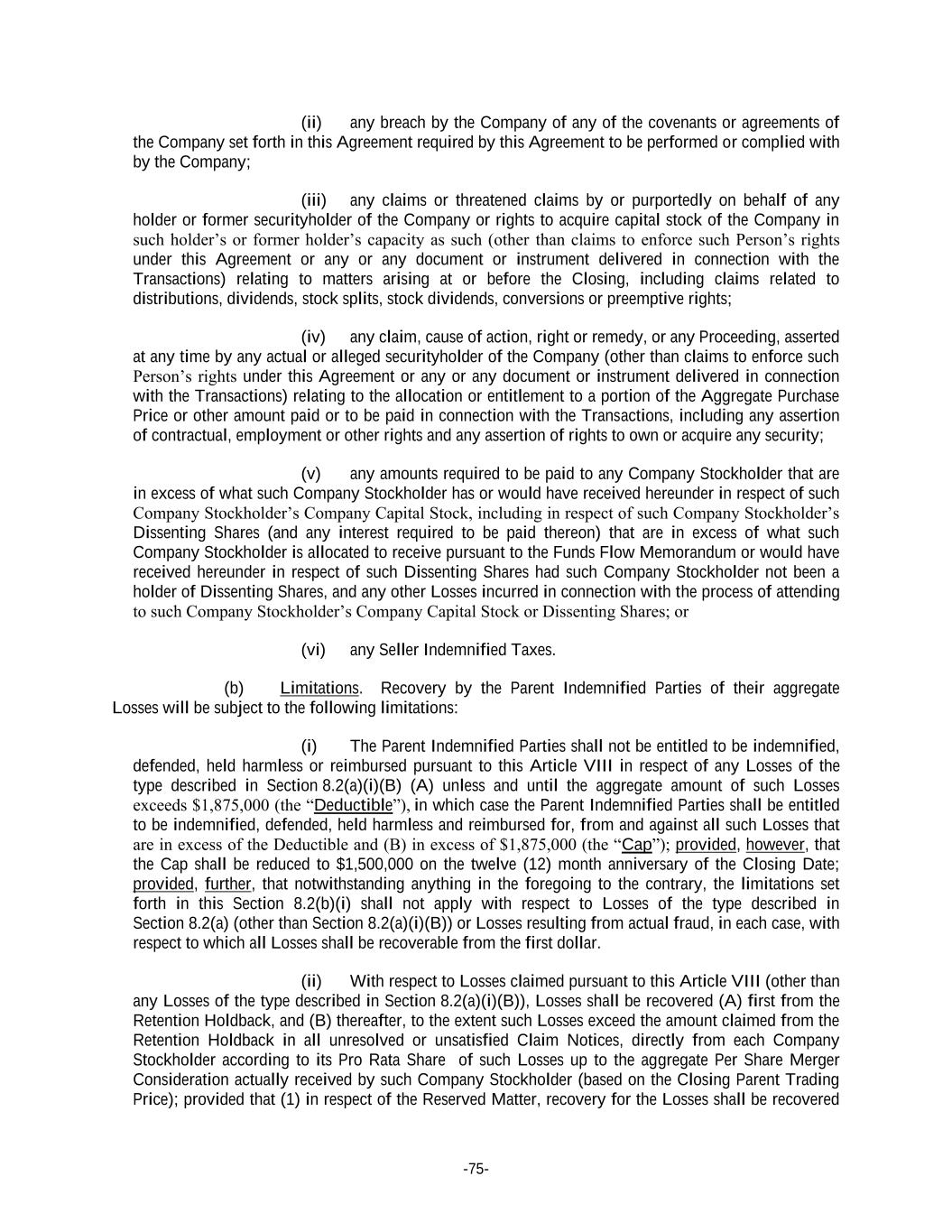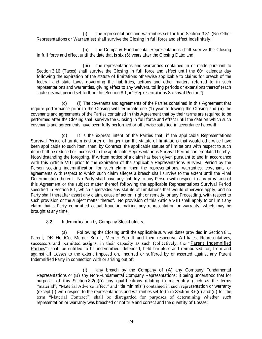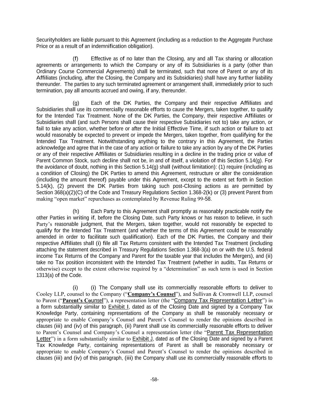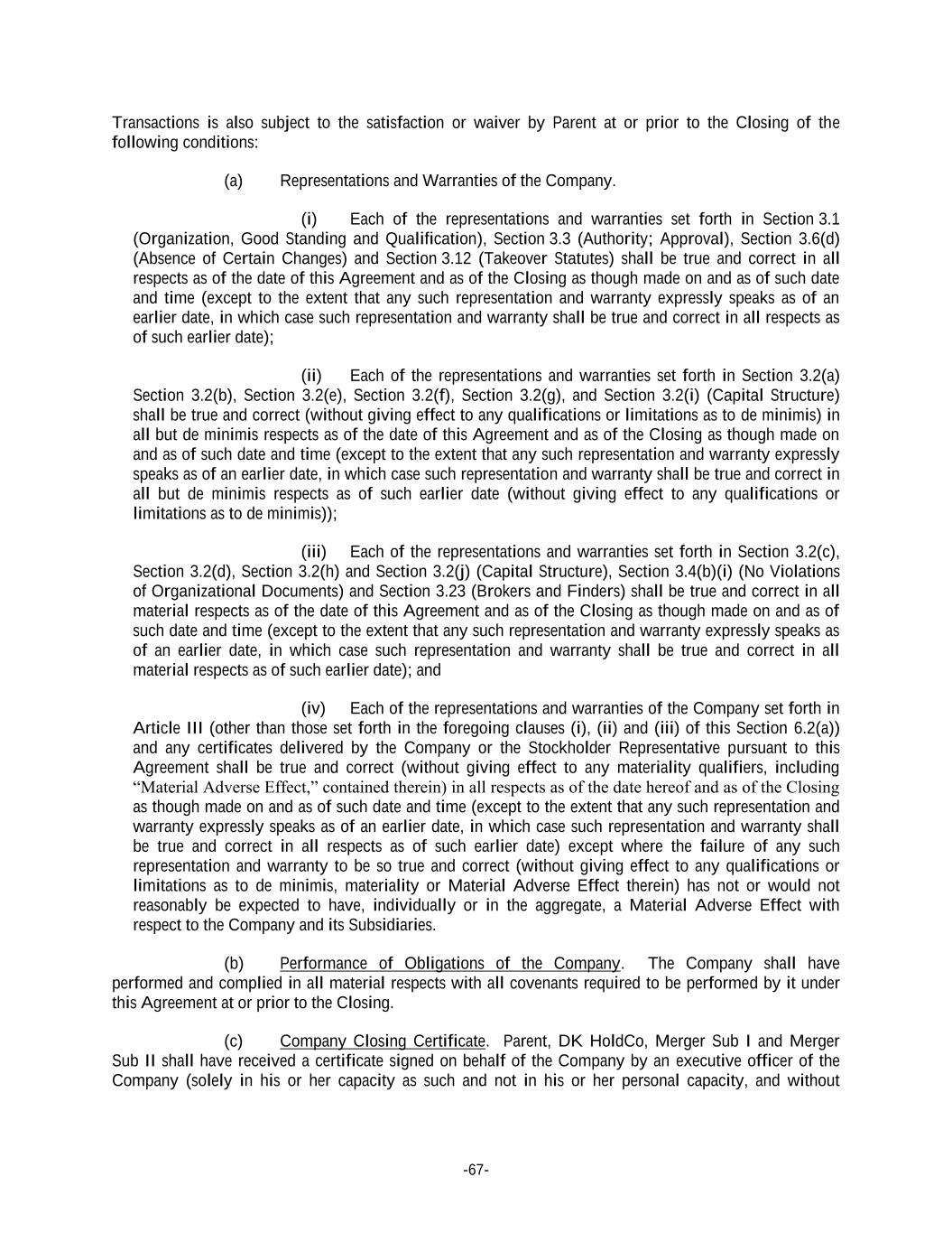 TABLE OF CONTENTS (continued) Page -iv- 6.2 Conditions to Obligation of Parent, DK HoldCo, Merger Sub and Merger Sub I ........... 66 6.3 Conditions to Obligation of the Company ....................................................................... 69 ARTICLE VII TERMINATION ............................................................................................................... 70 7.1 Termination by Mutual Written Consent ......................................................................... 70 7.2 Termination by Either Parent or the Company ................................................................ 70 7.3 Termination by Parent ..................................................................................................... 71 7.4 Termination by the Company .......................................................................................... 71 7.5 Effect of Termination and Abandonment ........................................................................ 71 7.6 Bridge Loan ..................................................................................................................... 71 7.7 Treatment of Extension Payment ..................................................................................... 73 ARTICLE VIII SURVIVAL; INDEMNIFICATION ................................................................................ 73 8.1 Survival. ........................................................................................................................... 73 8.2 Indemnification by Company Stockholders. .................................................................... 74 8.3 Claim Procedures. ............................................................................................................ 76 8.4 Recoveries. ....................................................................................................................... 77 8.5 Indemnity Payments. ....................................................................................................... 78 8.6 Exclusive Remedies ......................................................................................................... 79 8.7 No Effect on R&W Insurance Policy ............................................................................... 79 ARTICLE IX STOCKHOLDER REPRESENTATIVE ............................................................................ 79 9.1 Acknowledgement ........................................................................................................... 79 9.2 Stockholder Representative Expense Amount ................................................................. 81 9.3 Exculpation and Indemnification of Stockholder Representative .................................... 81 9.4 Reliance ........................................................................................................................... 82 9.5 Replacement of the Stockholder Representative ............................................................. 82 ARTICLE X MISCELLANEOUS AND GENERAL ............................................................................... 82 10.1 Modification or Amendment; Waiver .............................................................................. 82 10.2 Expenses .......................................................................................................................... 82 10.3 Counterparts ..................................................................................................................... 83 10.4 Governing Law and Venue; Submission to Jurisdiction; Selection of Forum; Waiver of Trial by Jury; Specific Performance. .............................................................. 83 10.5 Notices ............................................................................................................................. 84 10.6 Entire Agreement ............................................................................................................. 85 10.7 No Third Party Beneficiaries ........................................................................................... 85