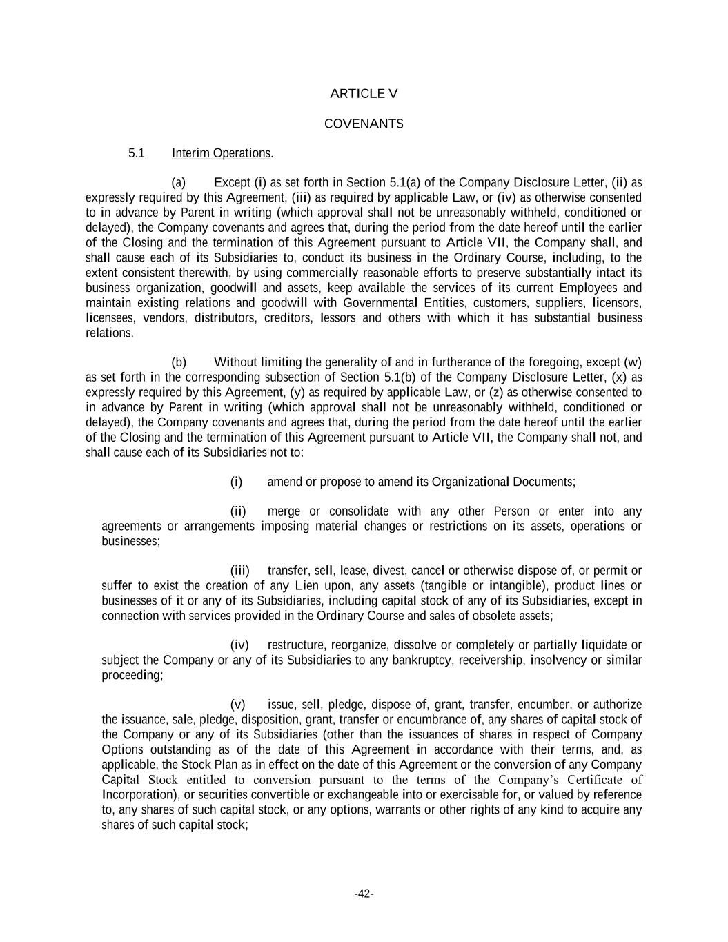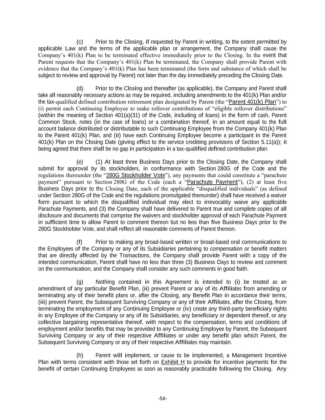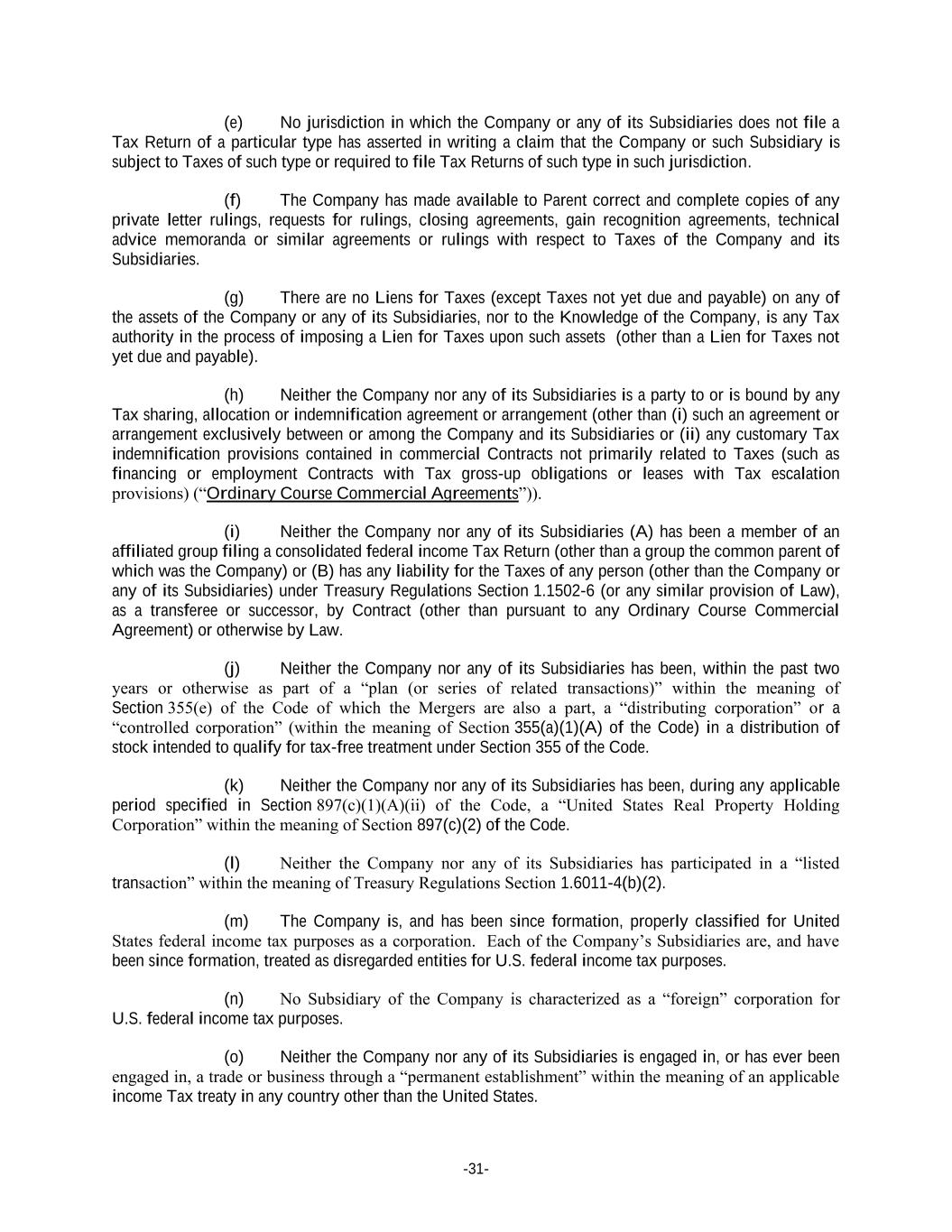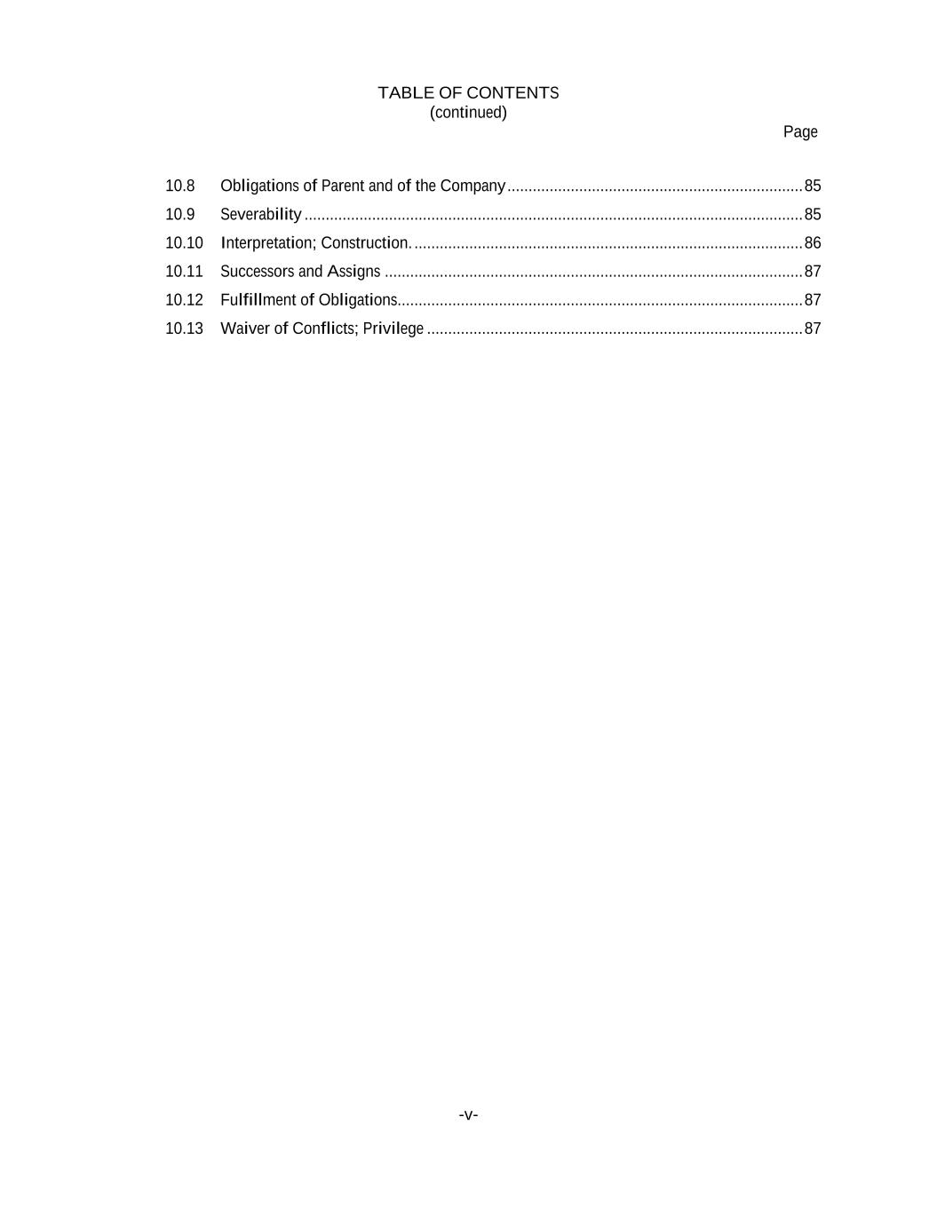 TABLE OF CONTENTS (continued) Page -v- 10.8 Obligations of Parent and of the Company ...................................................................... 85 10.9 Severability ...................................................................................................................... 85 10.10 Interpretation; Construction. ............................................................................................ 86 10.11 Successors and Assigns ................................................................................................... 87 10.12 Fulfillment of Obligations................................................................................................ 87 10.13 Waiver of Conflicts; Privilege ......................................................................................... 87