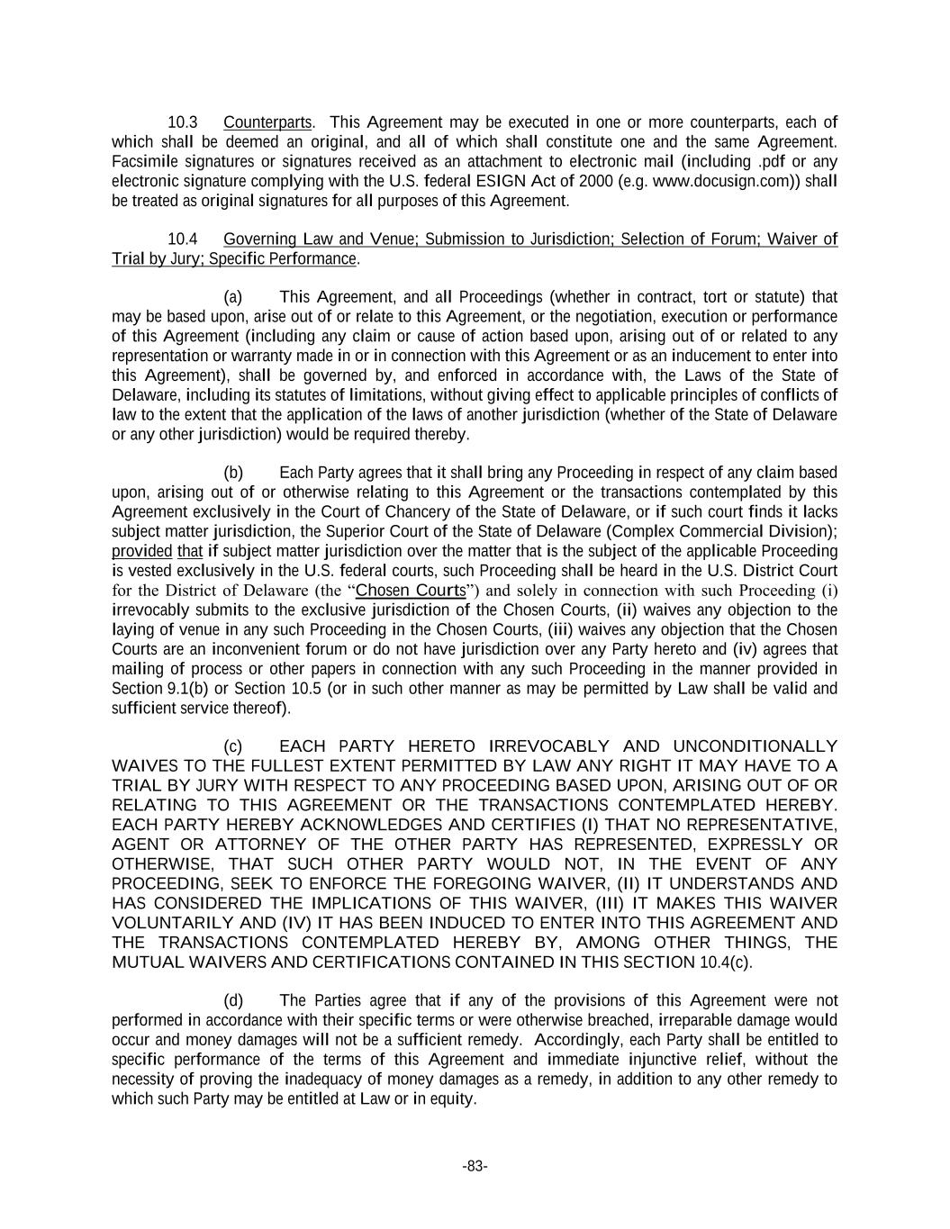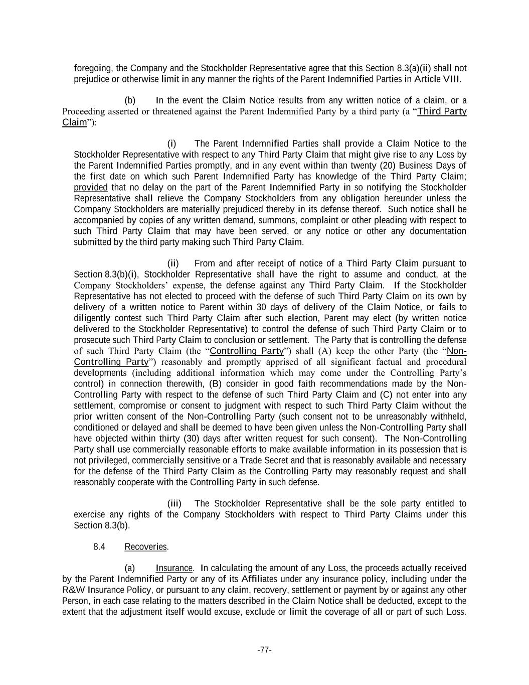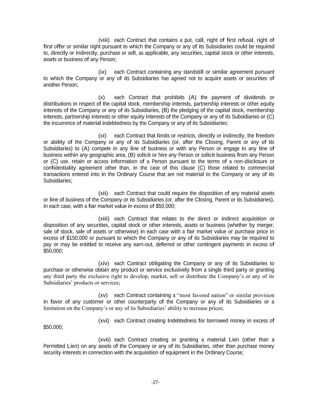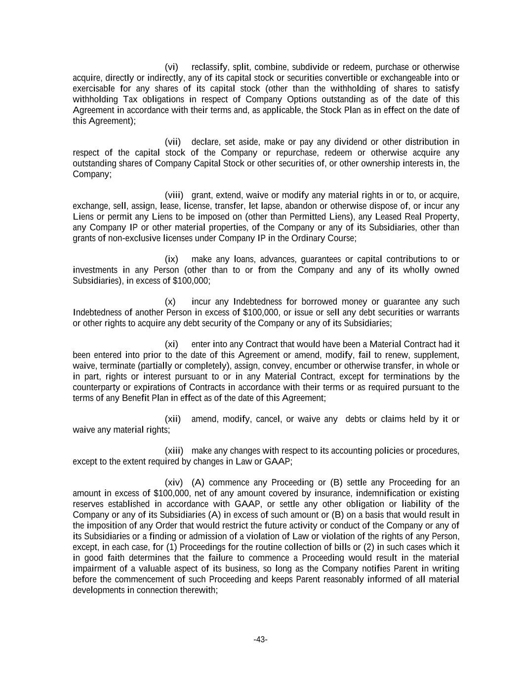 TABLE OF CONTENTS (continued) Page -v- 10.8 Obligations of Parent and of the Company ...................................................................... 85 10.9 Severability ...................................................................................................................... 85 10.10 Interpretation; Construction. ............................................................................................ 86 10.11 Successors and Assigns ................................................................................................... 87 10.12 Fulfillment of Obligations................................................................................................ 87 10.13 Waiver of Conflicts; Privilege ......................................................................................... 87