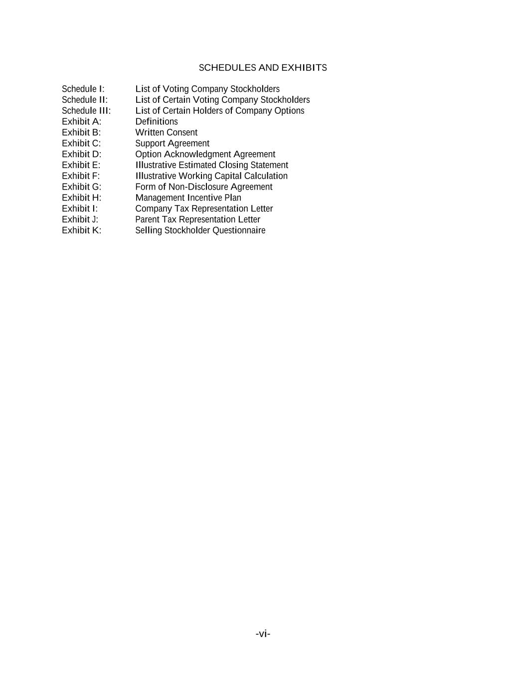 -vi- SCHEDULES AND EXHIBITS Schedule I: List of Voting Company Stockholders Schedule II: Schedule III: List of Certain Voting Company Stockholders List of Certain Holders of Company Options Exhibit A: Definitions Exhibit B: Written Consent Exhibit C: Support Agreement Exhibit D: Option Acknowledgment Agreement Exhibit E: Illustrative Estimated Closing Statement Exhibit F: Illustrative Working Capital Calculation Exhibit G: Form of Non-Disclosure Agreement Exhibit H: Management Incentive Plan Exhibit I: Company Tax Representation Letter Exhibit J: Parent Tax Representation Letter Exhibit K: Selling Stockholder Questionnaire
