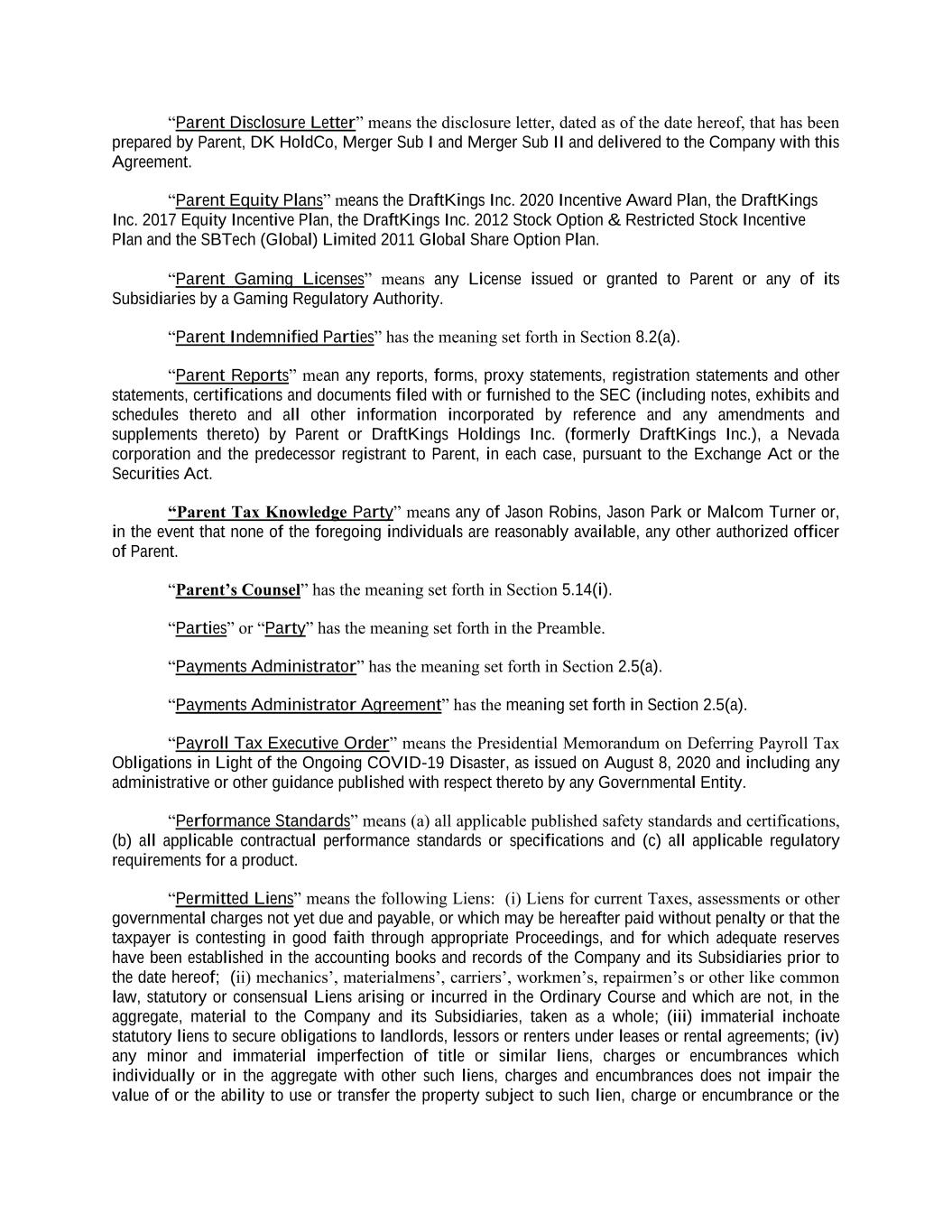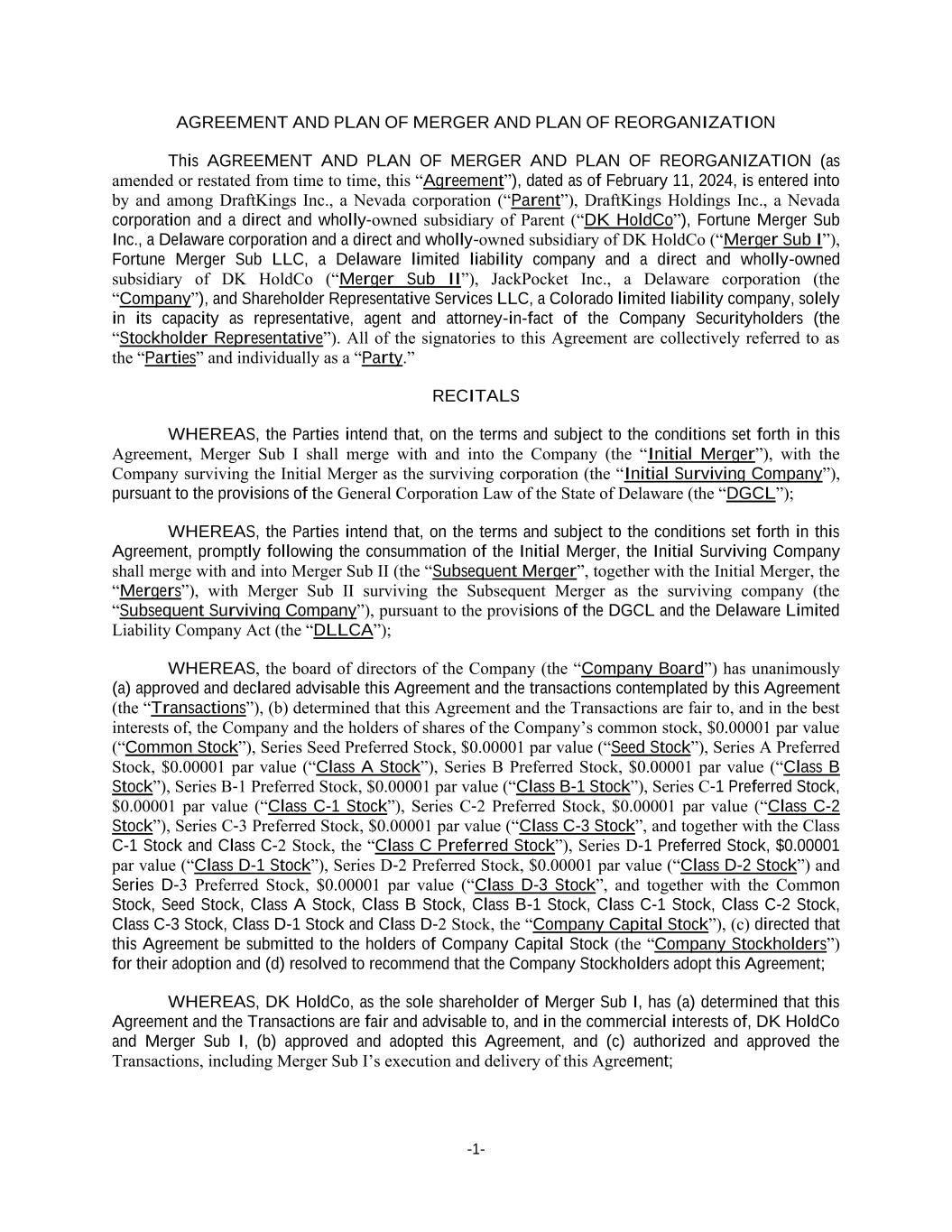 -1- AGREEMENT AND PLAN OF MERGER AND PLAN OF REORGANIZATION This AGREEMENT AND PLAN OF MERGER AND PLAN OF REORGANIZATION (as amended or restated from time to time, this “Agreement”), dated as of February 11, 2024, is entered into by and among DraftKings Inc., a Nevada corporation (“Parent”), DraftKings Holdings Inc., a Nevada corporation and a direct and wholly-owned subsidiary of Parent (“DK HoldCo”), Fortune Merger Sub Inc., a Delaware corporation and a direct and wholly-owned subsidiary of DK HoldCo (“Merger Sub I”), Fortune Merger Sub LLC, a Delaware limited liability company and a direct and wholly-owned subsidiary of DK HoldCo (“Merger Sub II”), JackPocket Inc., a Delaware corporation (the “Company”), and Shareholder Representative Services LLC, a Colorado limited liability company, solely in its capacity as representative, agent and attorney-in-fact of the Company Securityholders (the “Stockholder Representative”). All of the signatories to this Agreement are collectively referred to as the “Parties” and individually as a “Party.” RECITALS WHEREAS, the Parties intend that, on the terms and subject to the conditions set forth in this Agreement, Merger Sub I shall merge with and into the Company (the “Initial Merger”), with the Company surviving the Initial Merger as the surviving corporation (the “Initial Surviving Company”), pursuant to the provisions of the General Corporation Law of the State of Delaware (the “DGCL”); WHEREAS, the Parties intend that, on the terms and subject to the conditions set forth in this Agreement, promptly following the consummation of the Initial Merger, the Initial Surviving Company shall merge with and into Merger Sub II (the “Subsequent Merger”, together with the Initial Merger, the “Mergers”), with Merger Sub II surviving the Subsequent Merger as the surviving company (the “Subsequent Surviving Company”), pursuant to the provisions of the DGCL and the Delaware Limited Liability Company Act (the “DLLCA”); WHEREAS, the board of directors of the Company (the “Company Board”) has unanimously (a) approved and declared advisable this Agreement and the transactions contemplated by this Agreement (the “Transactions”), (b) determined that this Agreement and the Transactions are fair to, and in the best interests of, the Company and the holders of shares of the Company’s common stock, $0.00001 par value (“Common Stock”), Series Seed Preferred Stock, $0.00001 par value (“Seed Stock”), Series A Preferred Stock, $0.00001 par value (“Class A Stock”), Series B Preferred Stock, $0.00001 par value (“Class B Stock”), Series B-1 Preferred Stock, $0.00001 par value (“Class B-1 Stock”), Series C-1 Preferred Stock, $0.00001 par value (“Class C-1 Stock”), Series C-2 Preferred Stock, $0.00001 par value (“Class C-2 Stock”), Series C-3 Preferred Stock, $0.00001 par value (“Class C-3 Stock”, and together with the Class C-1 Stock and Class C-2 Stock, the “Class C Preferred Stock”), Series D-1 Preferred Stock, $0.00001 par value (“Class D-1 Stock”), Series D-2 Preferred Stock, $0.00001 par value (“Class D-2 Stock”) and Series D-3 Preferred Stock, $0.00001 par value (“Class D-3 Stock”, and together with the Common Stock, Seed Stock, Class A Stock, Class B Stock, Class B-1 Stock, Class C-1 Stock, Class C-2 Stock, Class C-3 Stock, Class D-1 Stock and Class D-2 Stock, the “Company Capital Stock”), (c) directed that this Agreement be submitted to the holders of Company Capital Stock (the “Company Stockholders”) for their adoption and (d) resolved to recommend that the Company Stockholders adopt this Agreement; WHEREAS, DK HoldCo, as the sole shareholder of Merger Sub I, has (a) determined that this Agreement and the Transactions are fair and advisable to, and in the commercial interests of, DK HoldCo and Merger Sub I, (b) approved and adopted this Agreement, and (c) authorized and approved the Transactions, including Merger Sub I’s execution and delivery of this Agreement;