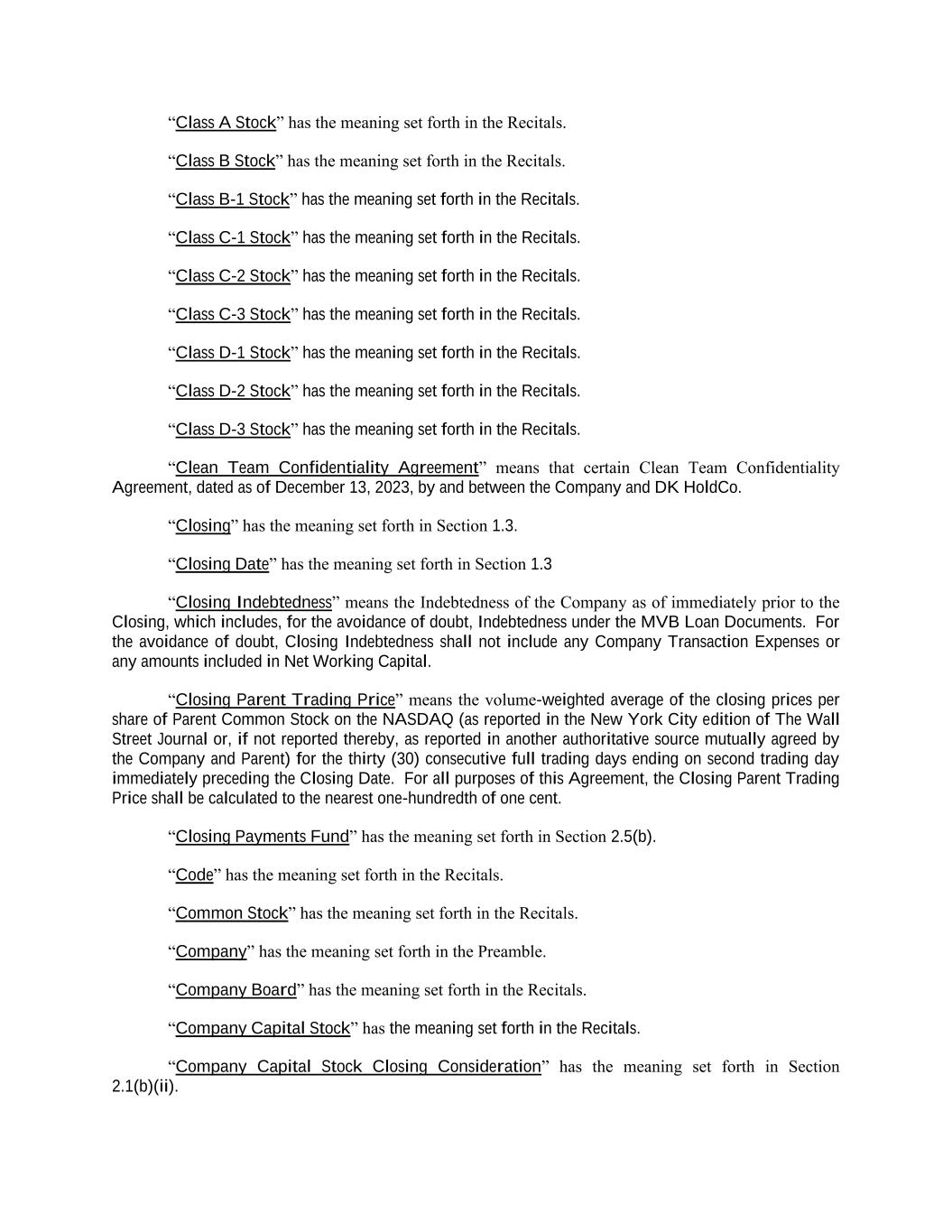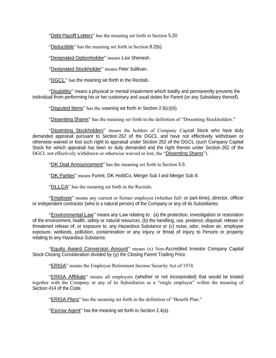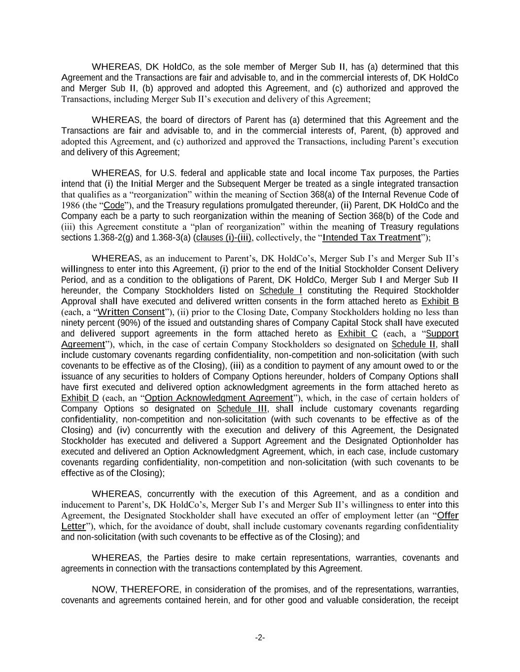 -2- WHEREAS, DK HoldCo, as the sole member of Merger Sub II, has (a) determined that this Agreement and the Transactions are fair and advisable to, and in the commercial interests of, DK HoldCo and Merger Sub II, (b) approved and adopted this Agreement, and (c) authorized and approved the Transactions, including Merger Sub II’s execution and delivery of this Agreement; WHEREAS, the board of directors of Parent has (a) determined that this Agreement and the Transactions are fair and advisable to, and in the commercial interests of, Parent, (b) approved and adopted this Agreement, and (c) authorized and approved the Transactions, including Parent’s execution and delivery of this Agreement; WHEREAS, for U.S. federal and applicable state and local income Tax purposes, the Parties intend that (i) the Initial Merger and the Subsequent Merger be treated as a single integrated transaction that qualifies as a “reorganization” within the meaning of Section 368(a) of the Internal Revenue Code of 1986 (the “Code”), and the Treasury regulations promulgated thereunder, (ii) Parent, DK HoldCo and the Company each be a party to such reorganization within the meaning of Section 368(b) of the Code and (iii) this Agreement constitute a “plan of reorganization” within the meaning of Treasury regulations sections 1.368-2(g) and 1.368-3(a) (clauses (i)-(iii), collectively, the “Intended Tax Treatment”); WHEREAS, as an inducement to Parent’s, DK HoldCo’s, Merger Sub I’s and Merger Sub II’s willingness to enter into this Agreement, (i) prior to the end of the Initial Stockholder Consent Delivery Period, and as a condition to the obligations of Parent, DK HoldCo, Merger Sub I and Merger Sub II hereunder, the Company Stockholders listed on Schedule I constituting the Required Stockholder Approval shall have executed and delivered written consents in the form attached hereto as Exhibit B (each, a “Written Consent”), (ii) prior to the Closing Date, Company Stockholders holding no less than ninety percent (90%) of the issued and outstanding shares of Company Capital Stock shall have executed and delivered support agreements in the form attached hereto as Exhibit C (each, a “Support Agreement”), which, in the case of certain Company Stockholders so designated on Schedule II, shall include customary covenants regarding confidentiality, non-competition and non-solicitation (with such covenants to be effective as of the Closing), (iii) as a condition to payment of any amount owed to or the issuance of any securities to holders of Company Options hereunder, holders of Company Options shall have first executed and delivered option acknowledgment agreements in the form attached hereto as Exhibit D (each, an “Option Acknowledgment Agreement”), which, in the case of certain holders of Company Options so designated on Schedule III, shall include customary covenants regarding confidentiality, non-competition and non-solicitation (with such covenants to be effective as of the Closing) and (iv) concurrently with the execution and delivery of this Agreement, the Designated Stockholder has executed and delivered a Support Agreement and the Designated Optionholder has executed and delivered an Option Acknowledgment Agreement, which, in each case, include customary covenants regarding confidentiality, non-competition and non-solicitation (with such covenants to be effective as of the Closing); WHEREAS, concurrently with the execution of this Agreement, and as a condition and inducement to Parent’s, DK HoldCo’s, Merger Sub I’s and Merger Sub II’s willingness to enter into this Agreement, the Designated Stockholder shall have executed an offer of employment letter (an “Offer Letter”), which, for the avoidance of doubt, shall include customary covenants regarding confidentiality and non-solicitation (with such covenants to be effective as of the Closing); and WHEREAS, the Parties desire to make certain representations, warranties, covenants and agreements in connection with the transactions contemplated by this Agreement. NOW, THEREFORE, in consideration of the promises, and of the representations, warranties, covenants and agreements contained herein, and for other good and valuable consideration, the receipt