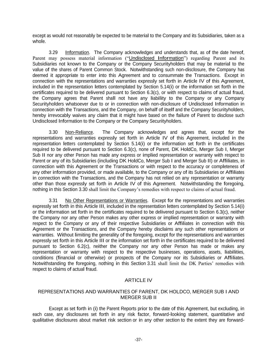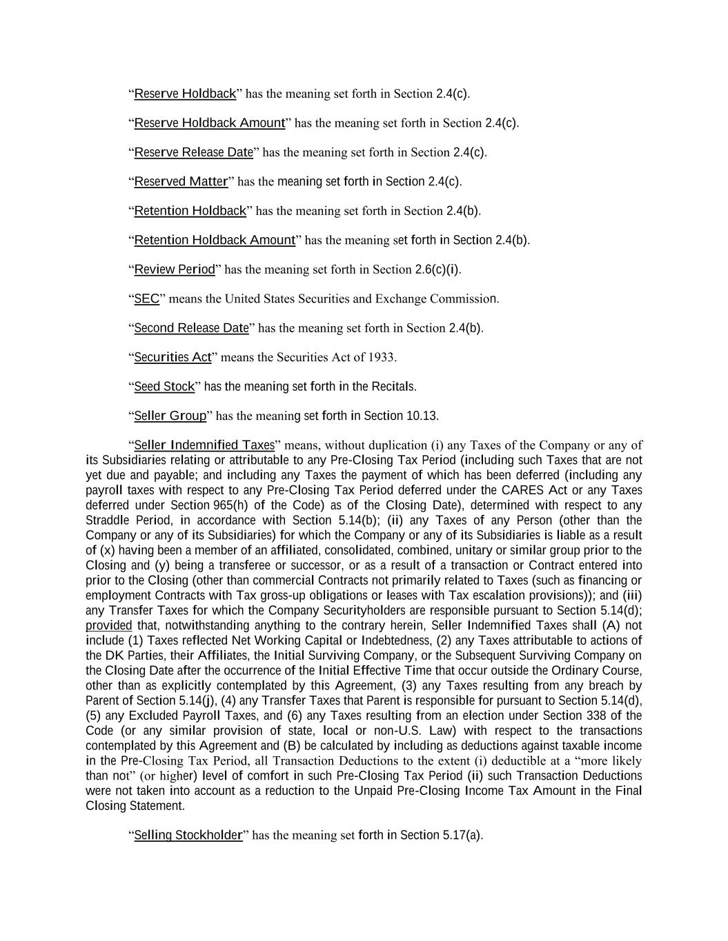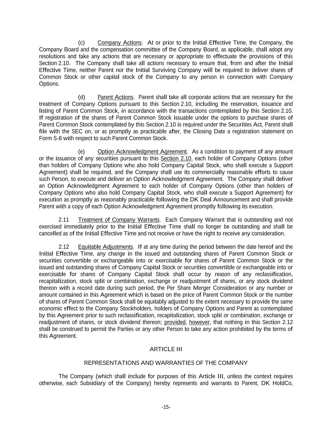 -2- WHEREAS, DK HoldCo, as the sole member of Merger Sub II, has (a) determined that this Agreement and the Transactions are fair and advisable to, and in the commercial interests of, DK HoldCo and Merger Sub II, (b) approved and adopted this Agreement, and (c) authorized and approved the Transactions, including Merger Sub II’s execution and delivery of this Agreement; WHEREAS, the board of directors of Parent has (a) determined that this Agreement and the Transactions are fair and advisable to, and in the commercial interests of, Parent, (b) approved and adopted this Agreement, and (c) authorized and approved the Transactions, including Parent’s execution and delivery of this Agreement; WHEREAS, for U.S. federal and applicable state and local income Tax purposes, the Parties intend that (i) the Initial Merger and the Subsequent Merger be treated as a single integrated transaction that qualifies as a “reorganization” within the meaning of Section 368(a) of the Internal Revenue Code of 1986 (the “Code”), and the Treasury regulations promulgated thereunder, (ii) Parent, DK HoldCo and the Company each be a party to such reorganization within the meaning of Section 368(b) of the Code and (iii) this Agreement constitute a “plan of reorganization” within the meaning of Treasury regulations sections 1.368-2(g) and 1.368-3(a) (clauses (i)-(iii), collectively, the “Intended Tax Treatment”); WHEREAS, as an inducement to Parent’s, DK HoldCo’s, Merger Sub I’s and Merger Sub II’s willingness to enter into this Agreement, (i) prior to the end of the Initial Stockholder Consent Delivery Period, and as a condition to the obligations of Parent, DK HoldCo, Merger Sub I and Merger Sub II hereunder, the Company Stockholders listed on Schedule I constituting the Required Stockholder Approval shall have executed and delivered written consents in the form attached hereto as Exhibit B (each, a “Written Consent”), (ii) prior to the Closing Date, Company Stockholders holding no less than ninety percent (90%) of the issued and outstanding shares of Company Capital Stock shall have executed and delivered support agreements in the form attached hereto as Exhibit C (each, a “Support Agreement”), which, in the case of certain Company Stockholders so designated on Schedule II, shall include customary covenants regarding confidentiality, non-competition and non-solicitation (with such covenants to be effective as of the Closing), (iii) as a condition to payment of any amount owed to or the issuance of any securities to holders of Company Options hereunder, holders of Company Options shall have first executed and delivered option acknowledgment agreements in the form attached hereto as Exhibit D (each, an “Option Acknowledgment Agreement”), which, in the case of certain holders of Company Options so designated on Schedule III, shall include customary covenants regarding confidentiality, non-competition and non-solicitation (with such covenants to be effective as of the Closing) and (iv) concurrently with the execution and delivery of this Agreement, the Designated Stockholder has executed and delivered a Support Agreement and the Designated Optionholder has executed and delivered an Option Acknowledgment Agreement, which, in each case, include customary covenants regarding confidentiality, non-competition and non-solicitation (with such covenants to be effective as of the Closing); WHEREAS, concurrently with the execution of this Agreement, and as a condition and inducement to Parent’s, DK HoldCo’s, Merger Sub I’s and Merger Sub II’s willingness to enter into this Agreement, the Designated Stockholder shall have executed an offer of employment letter (an “Offer Letter”), which, for the avoidance of doubt, shall include customary covenants regarding confidentiality and non-solicitation (with such covenants to be effective as of the Closing); and WHEREAS, the Parties desire to make certain representations, warranties, covenants and agreements in connection with the transactions contemplated by this Agreement. NOW, THEREFORE, in consideration of the promises, and of the representations, warranties, covenants and agreements contained herein, and for other good and valuable consideration, the receipt