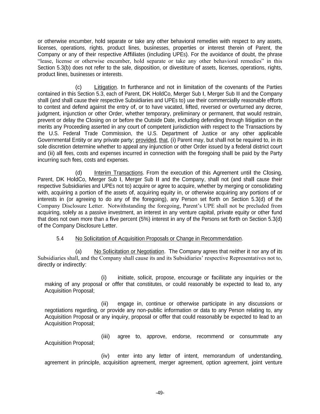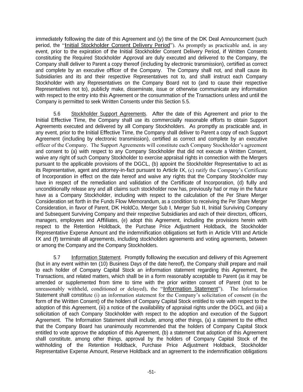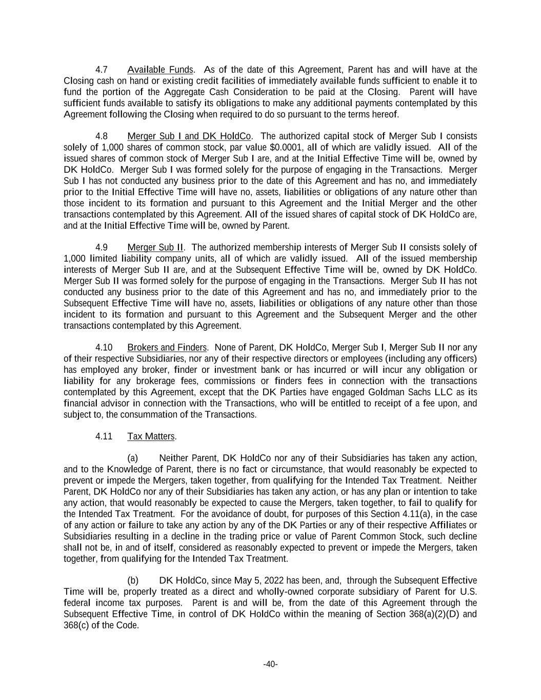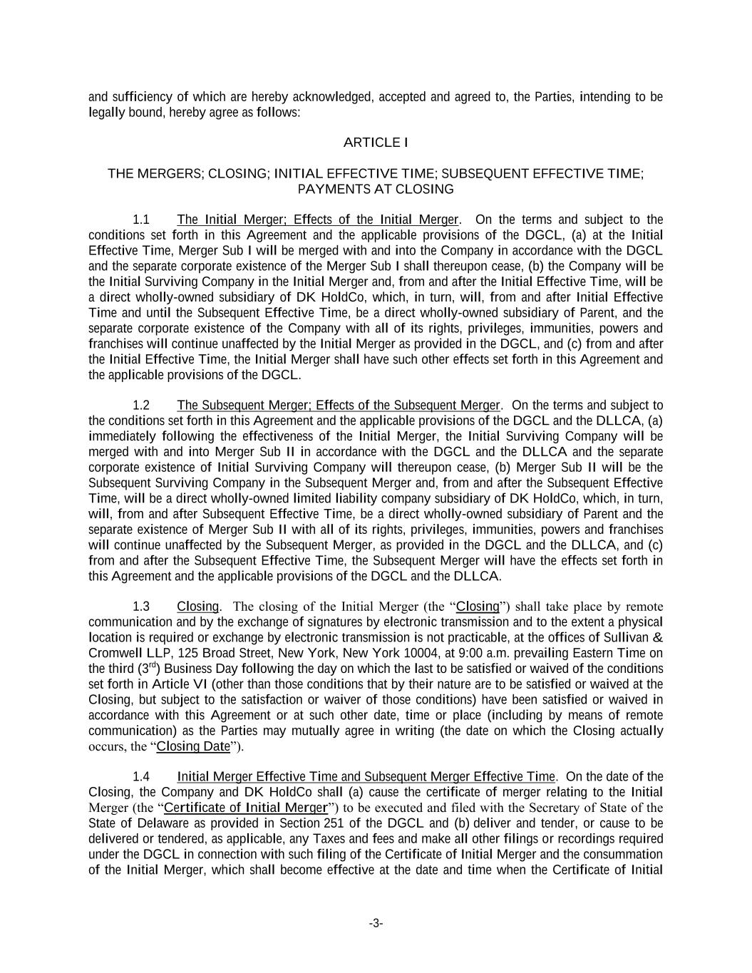 -3- and sufficiency of which are hereby acknowledged, accepted and agreed to, the Parties, intending to be legally bound, hereby agree as follows: ARTICLE I THE MERGERS; CLOSING; INITIAL EFFECTIVE TIME; SUBSEQUENT EFFECTIVE TIME; PAYMENTS AT CLOSING 1.1 The Initial Merger; Effects of the Initial Merger. On the terms and subject to the conditions set forth in this Agreement and the applicable provisions of the DGCL, (a) at the Initial Effective Time, Merger Sub I will be merged with and into the Company in accordance with the DGCL and the separate corporate existence of the Merger Sub I shall thereupon cease, (b) the Company will be the Initial Surviving Company in the Initial Merger and, from and after the Initial Effective Time, will be a direct wholly-owned subsidiary of DK HoldCo, which, in turn, will, from and after Initial Effective Time and until the Subsequent Effective Time, be a direct wholly-owned subsidiary of Parent, and the separate corporate existence of the Company with all of its rights, privileges, immunities, powers and franchises will continue unaffected by the Initial Merger as provided in the DGCL, and (c) from and after the Initial Effective Time, the Initial Merger shall have such other effects set forth in this Agreement and the applicable provisions of the DGCL. 1.2 The Subsequent Merger; Effects of the Subsequent Merger. On the terms and subject to the conditions set forth in this Agreement and the applicable provisions of the DGCL and the DLLCA, (a) immediately following the effectiveness of the Initial Merger, the Initial Surviving Company will be merged with and into Merger Sub II in accordance with the DGCL and the DLLCA and the separate corporate existence of Initial Surviving Company will thereupon cease, (b) Merger Sub II will be the Subsequent Surviving Company in the Subsequent Merger and, from and after the Subsequent Effective Time, will be a direct wholly-owned limited liability company subsidiary of DK HoldCo, which, in turn, will, from and after Subsequent Effective Time, be a direct wholly-owned subsidiary of Parent and the separate existence of Merger Sub II with all of its rights, privileges, immunities, powers and franchises will continue unaffected by the Subsequent Merger, as provided in the DGCL and the DLLCA, and (c) from and after the Subsequent Effective Time, the Subsequent Merger will have the effects set forth in this Agreement and the applicable provisions of the DGCL and the DLLCA. 1.3 Closing. The closing of the Initial Merger (the “Closing”) shall take place by remote communication and by the exchange of signatures by electronic transmission and to the extent a physical location is required or exchange by electronic transmission is not practicable, at the offices of Sullivan & Cromwell LLP, 125 Broad Street, New York, New York 10004, at 9:00 a.m. prevailing Eastern Time on the third (3rd) Business Day following the day on which the last to be satisfied or waived of the conditions set forth in Article VI (other than those conditions that by their nature are to be satisfied or waived at the Closing, but subject to the satisfaction or waiver of those conditions) have been satisfied or waived in accordance with this Agreement or at such other date, time or place (including by means of remote communication) as the Parties may mutually agree in writing (the date on which the Closing actually occurs, the “Closing Date”). 1.4 Initial Merger Effective Time and Subsequent Merger Effective Time. On the date of the Closing, the Company and DK HoldCo shall (a) cause the certificate of merger relating to the Initial Merger (the “Certificate of Initial Merger”) to be executed and filed with the Secretary of State of the State of Delaware as provided in Section 251 of the DGCL and (b) deliver and tender, or cause to be delivered or tendered, as applicable, any Taxes and fees and make all other filings or recordings required under the DGCL in connection with such filing of the Certificate of Initial Merger and the consummation of the Initial Merger, which shall become effective at the date and time when the Certificate of Initial